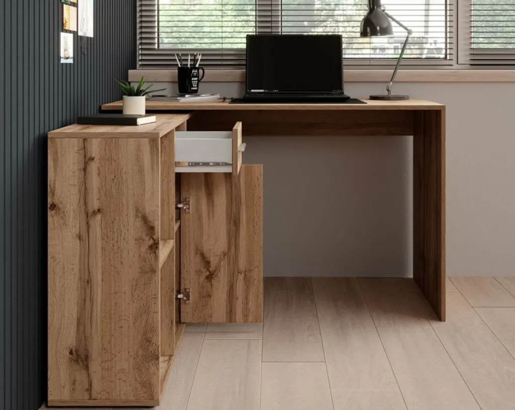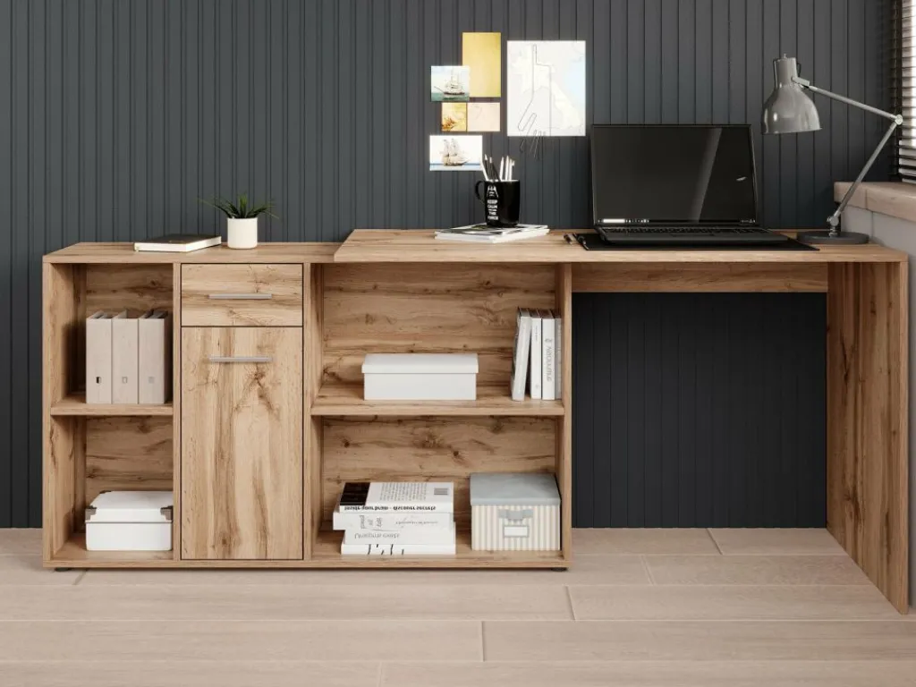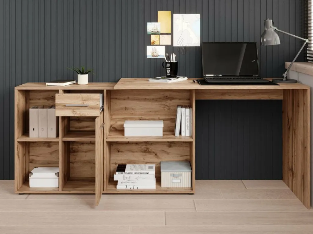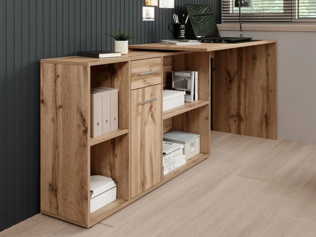 Het bureau beschikt over 1 lade en 1 deur, die je opent met grijze handgrepen. Daarnaast bevinden zich 4 open vakken. De module met opbergkasten is van positie te veranderen: plaats deze recht naast het blad, of schuin voor een hoekbureau.
