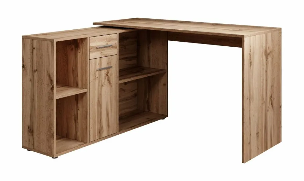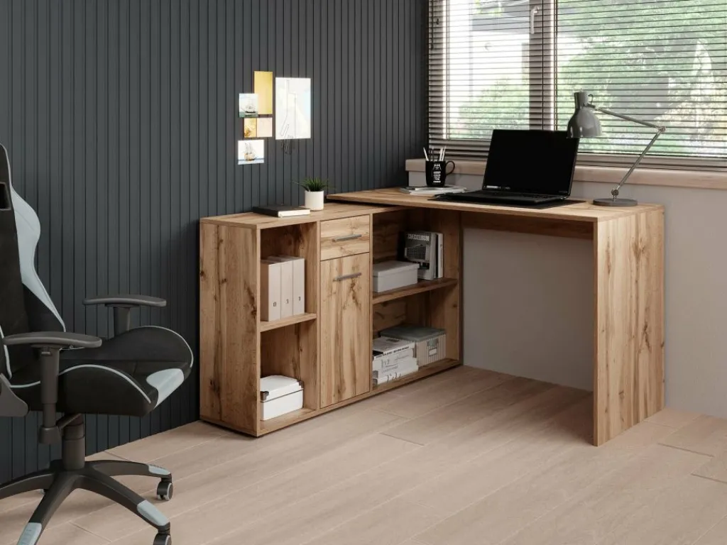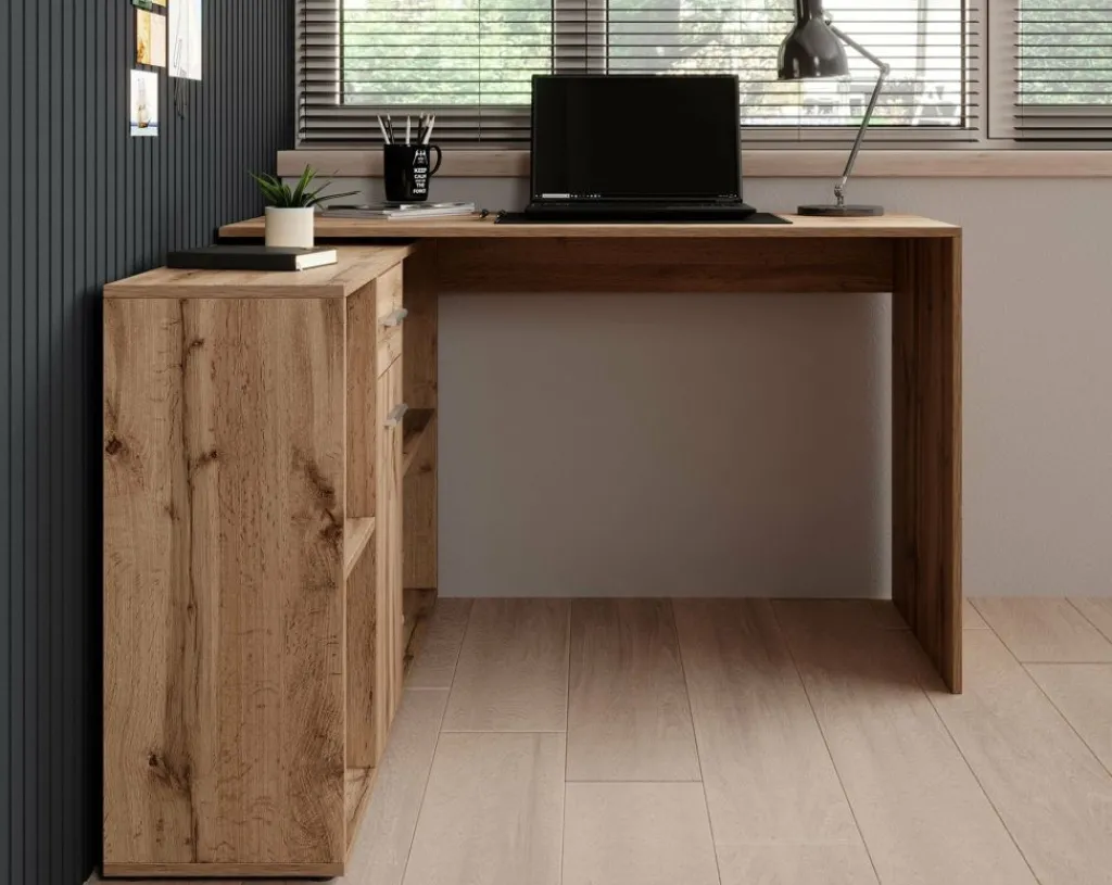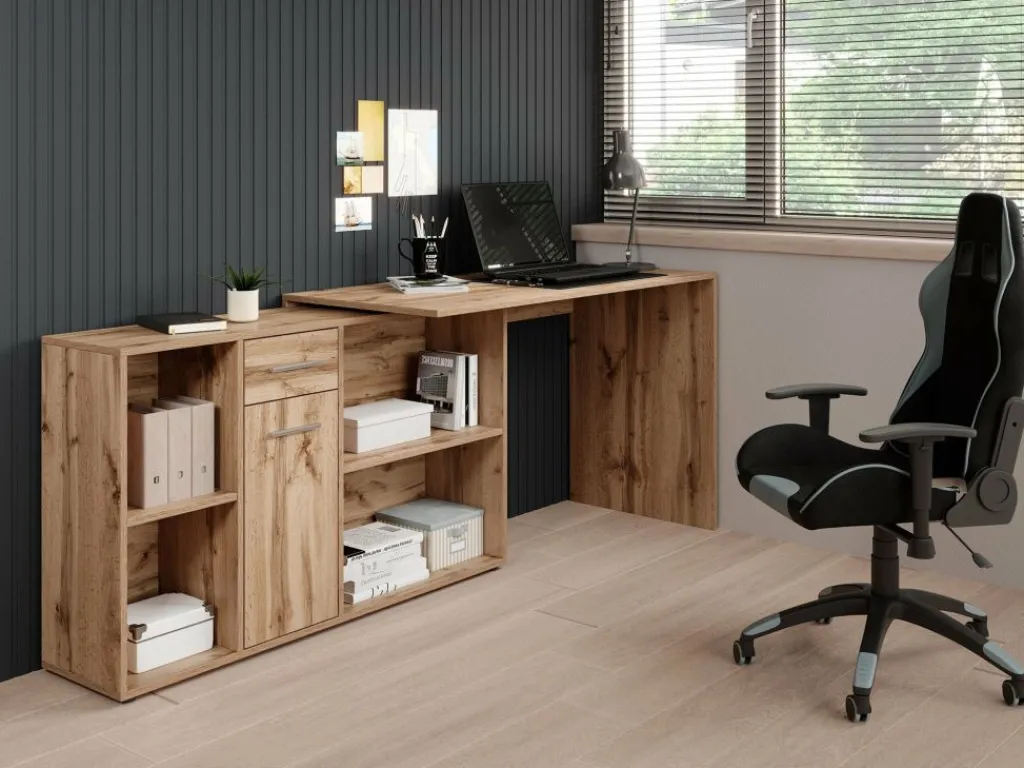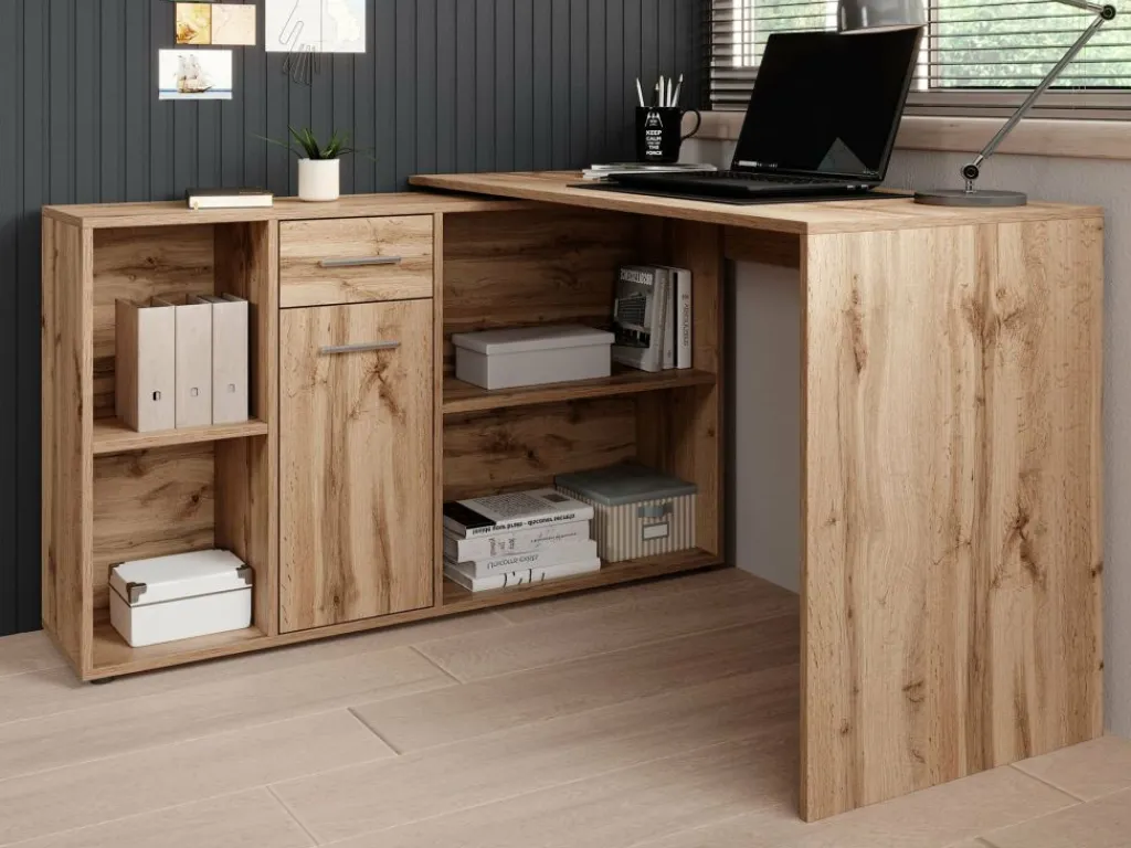 Het bureau beschikt over 1 lade en 1 deur, die je opent met grijze handgrepen. Daarnaast bevinden zich 4 open vakken. De module met opbergkasten is van positie te veranderen: plaats deze recht naast het blad, of schuin voor een hoekbureau.