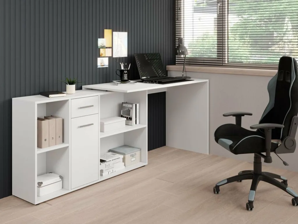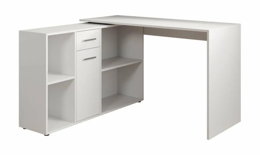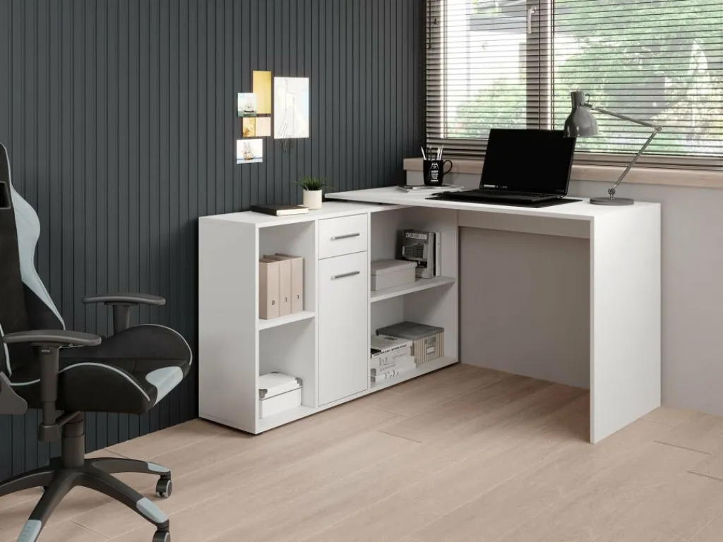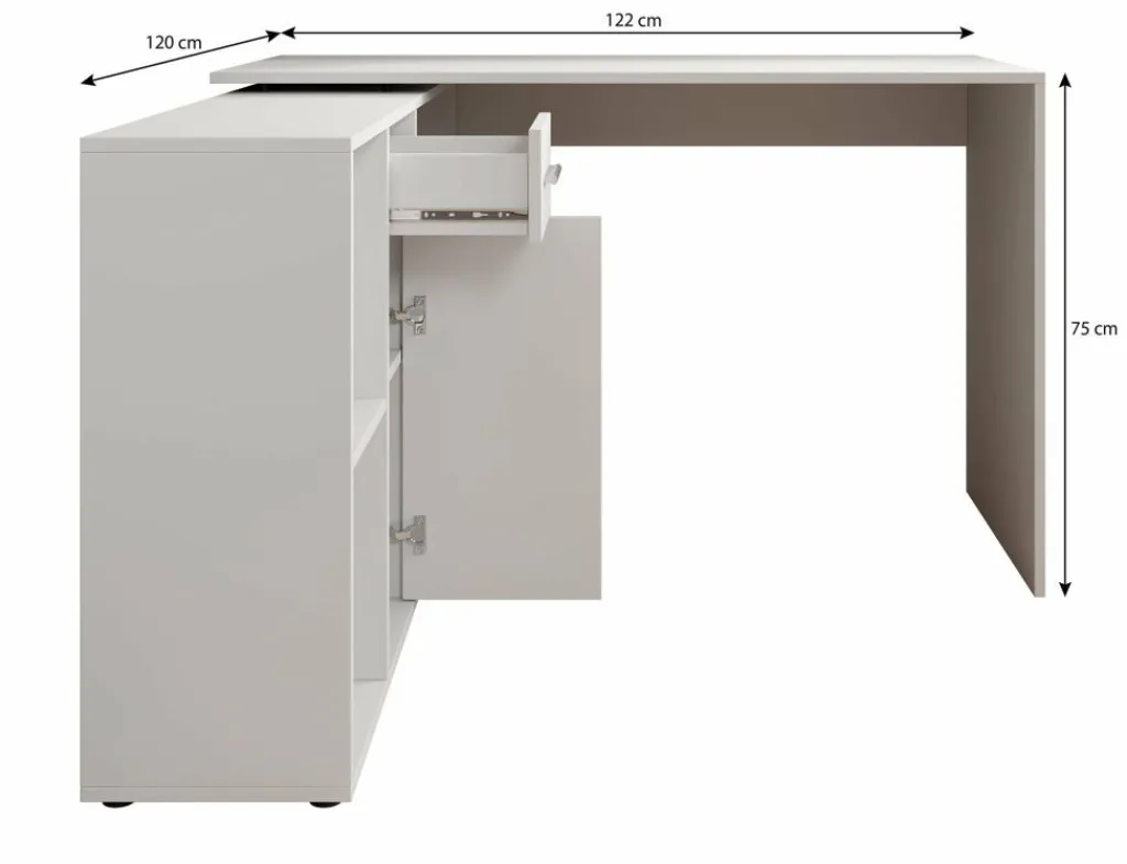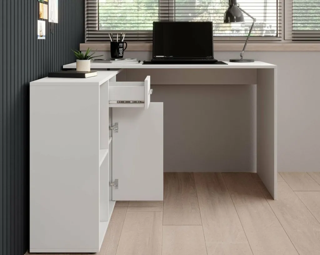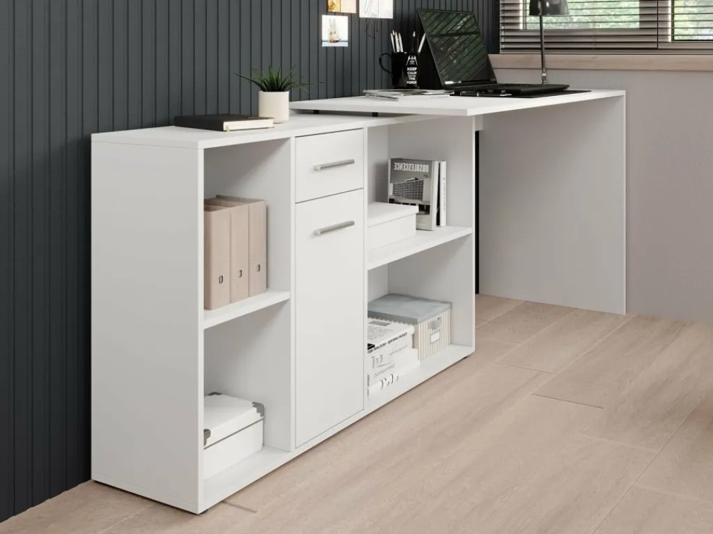 Het bureau beschikt over 1 lade en 1 deur, die je opent met grijze handgrepen. Daarnaast bevinden zich 4 open vakken. De module met opbergkasten is van positie te veranderen: plaats deze recht naast het blad, of schuin voor een hoekbureau.