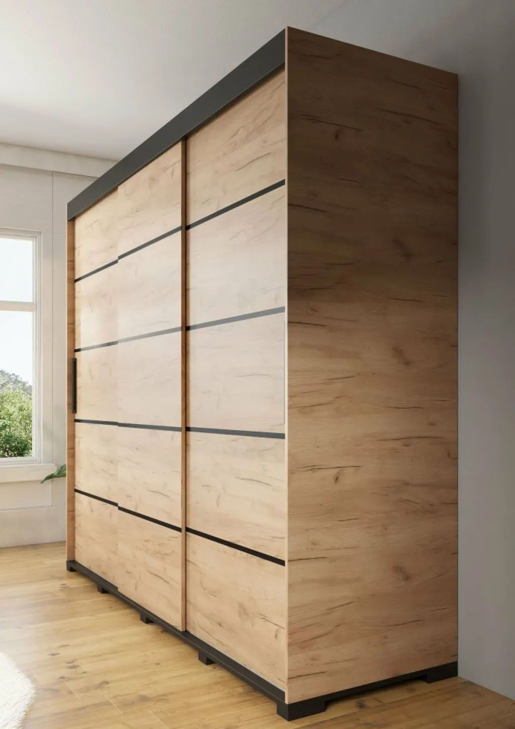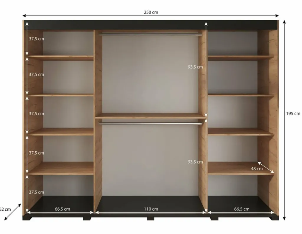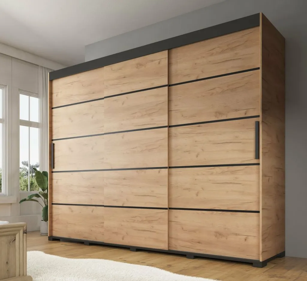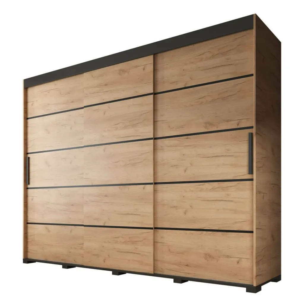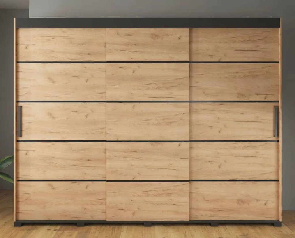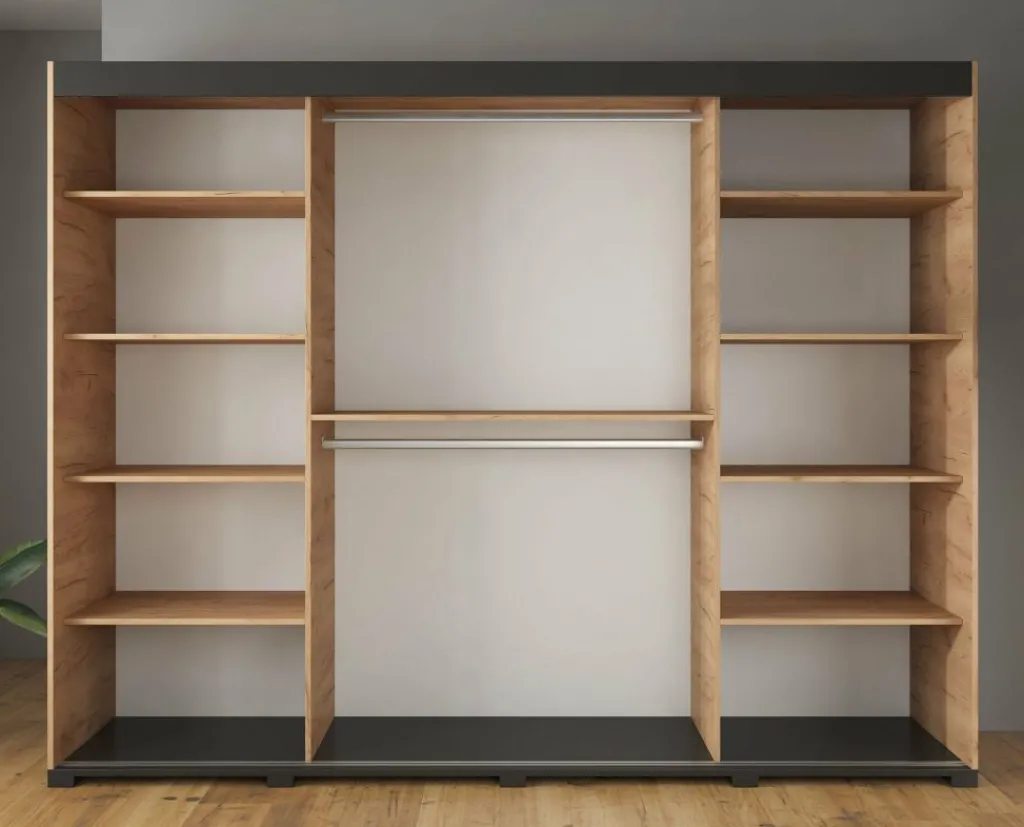 Garderobekast Crown is een praktische kast uitgevoerd in eiken kleur. De kledingkast beschikt over drie schuifdeuren. De deuren zijn te schuiven door middel van een grote zwarte handgreep. Het binnenwerk bestaat uit twee metalen stangen om kleding aan op te hangen en tien opbergvakken. De kast staat op zwarte pootjes.