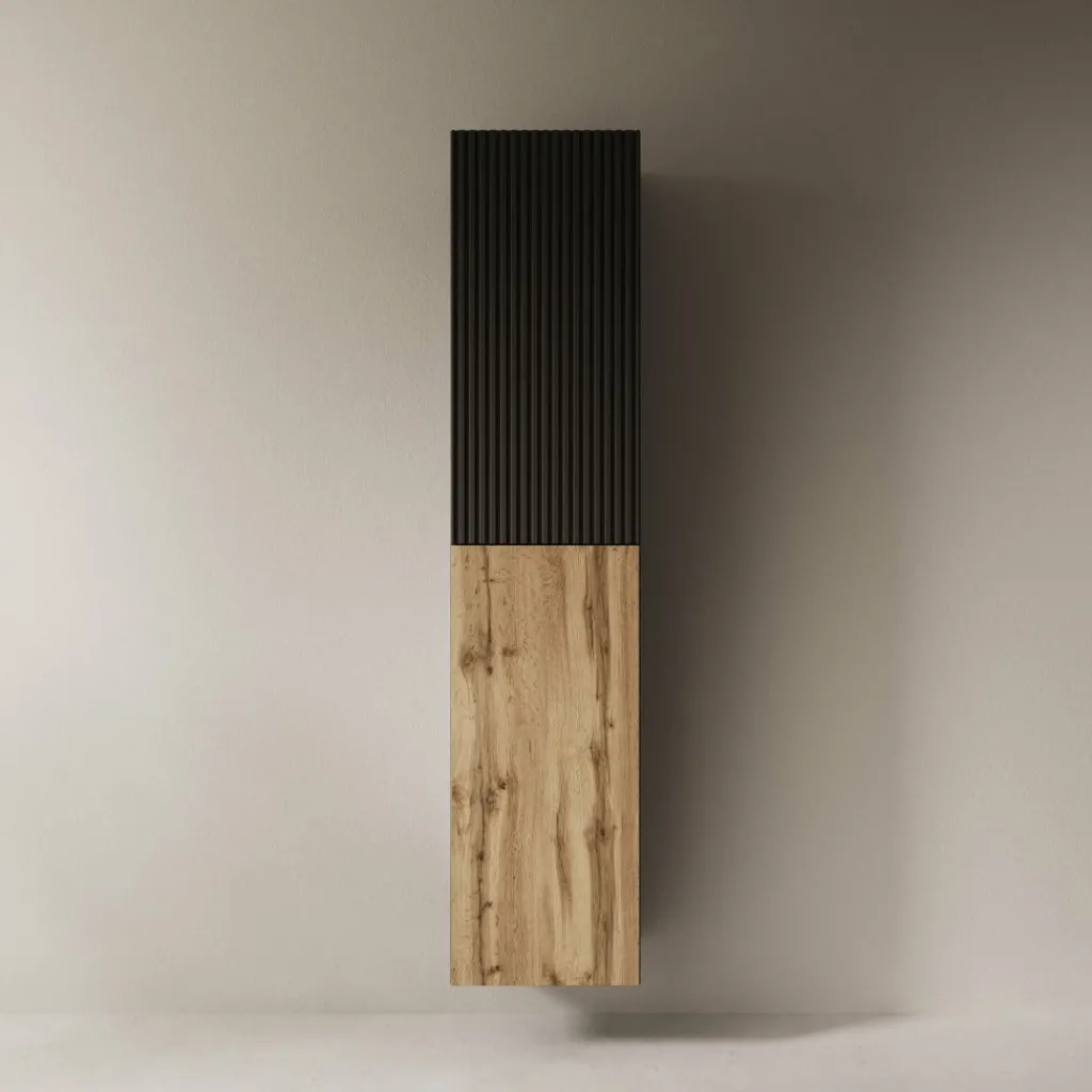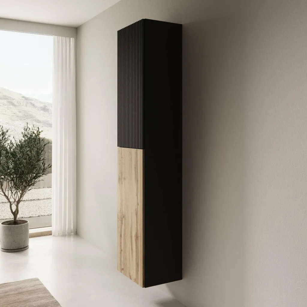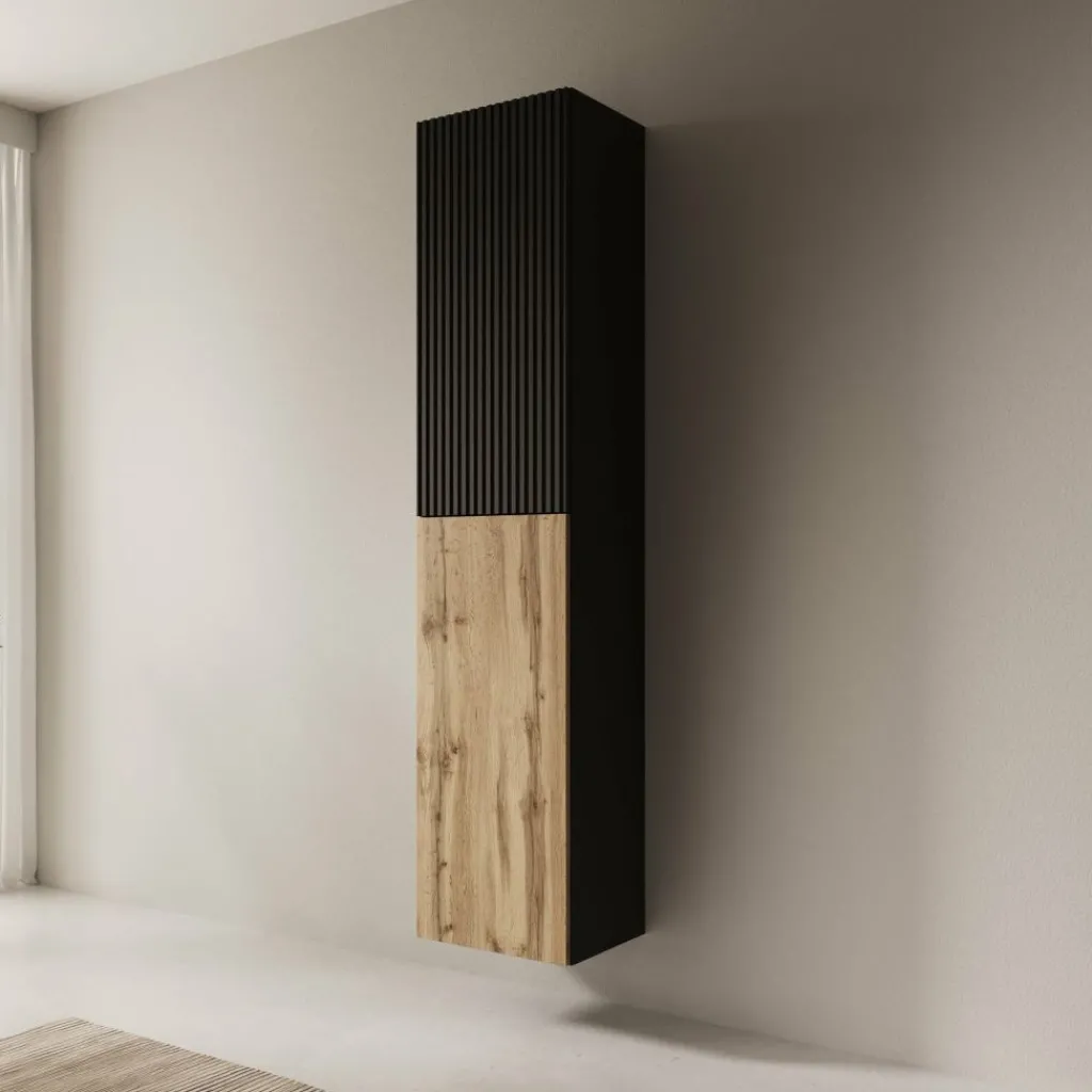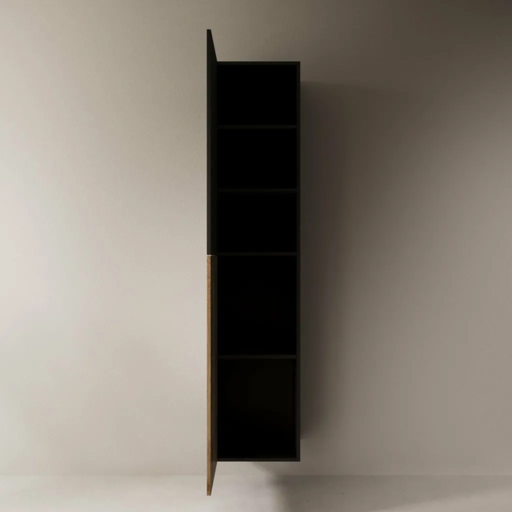 De combinatie van een zwarte basis met eikenaccenten sluit goed aan bij moderne, Scandinavische en eigentijdse interieurs. De vitrinekast is geschikt voor handdoeken, dagelijkse benodigdheden of decoratieve items en kan worden toegepast in zowel woon- als badkameromgevingen.