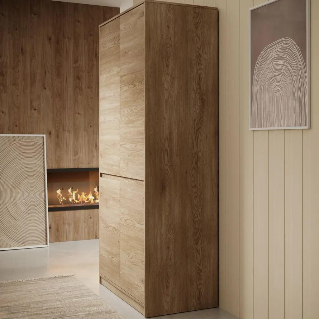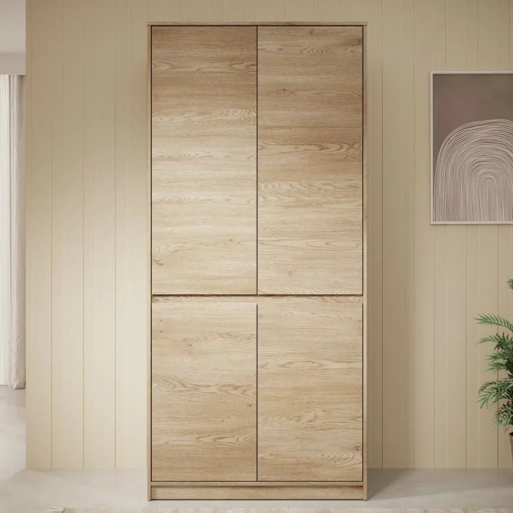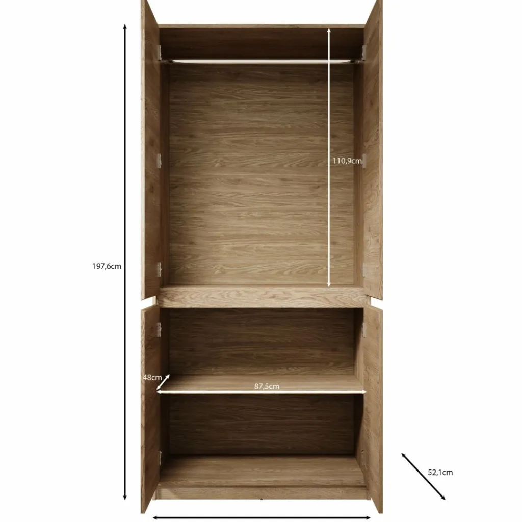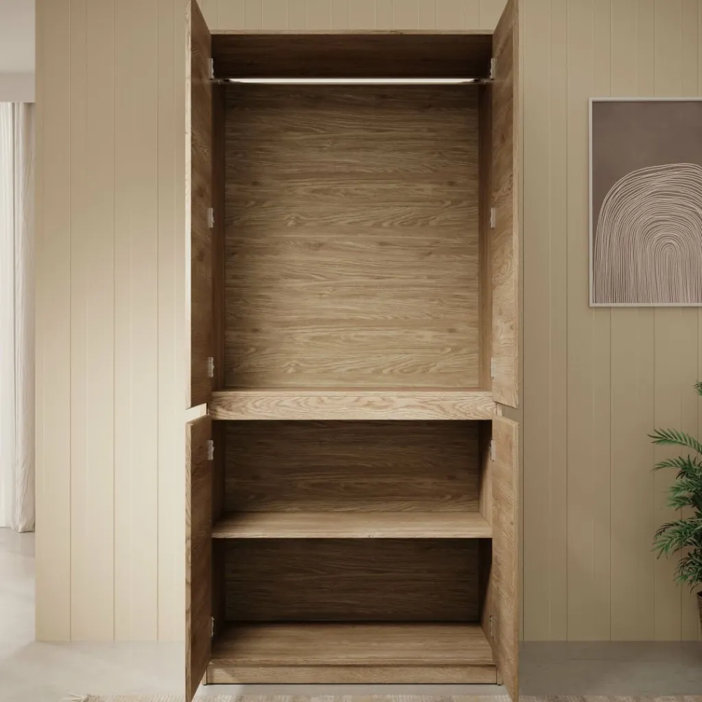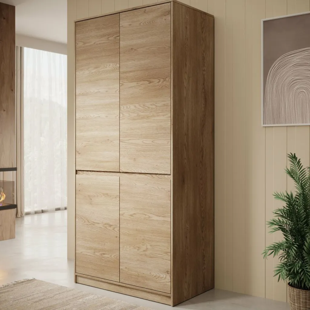 De Cuarto kledingkast is een praktische en stijlvolle opbergoplossing voor de slaapkamer, uitgevoerd in een warme eikenhout-look. Met zijn 4 deuren biedt deze kast een overzichtelijke indeling: een ruim hanggedeelte bovenin voor kleding aan hangers en een gescheiden opbergvak onderin met legplank voor opgevouwen kleding, schoenen of accessoires.