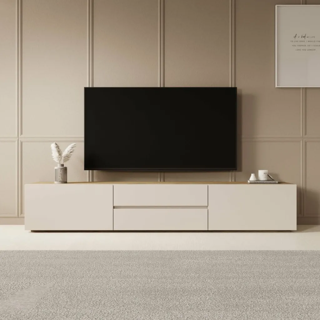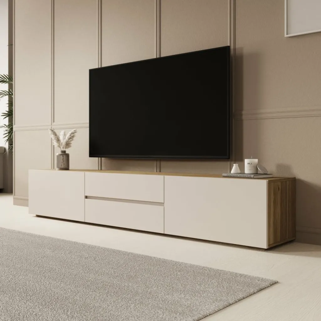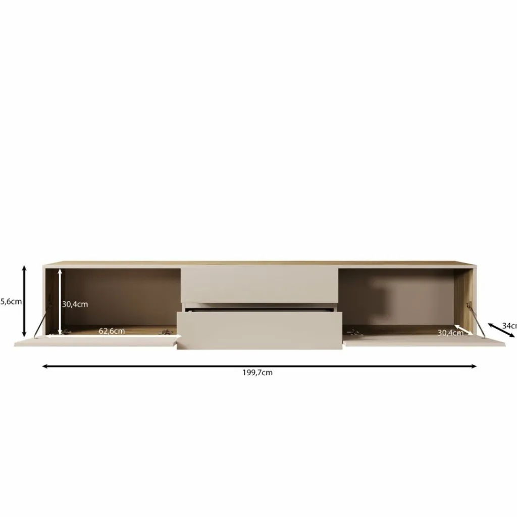 Dit tv-meubel heeft een strak en laag ontwerp en is uitgevoerd in beige met een eikenpatroon aan de bovenzijde en zijkanten. Met een breedte van 200 cm biedt het voldoende ruimte voor een televisie en bijbehorende apparatuur, terwijl de diepte van 34 cm zorgt voor een slank profiel tegen de wand.