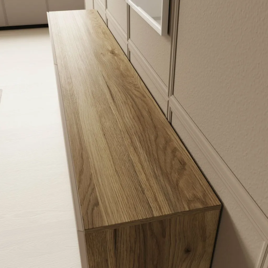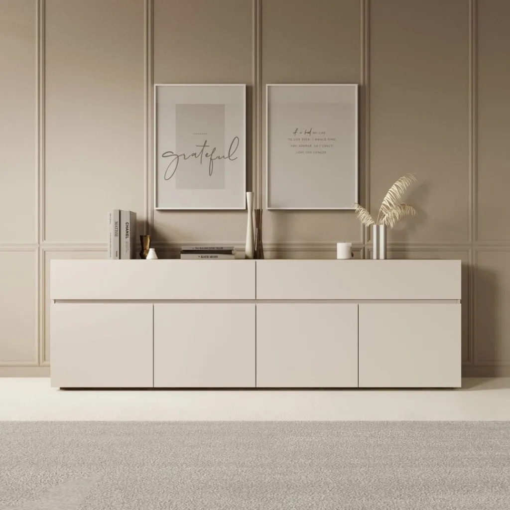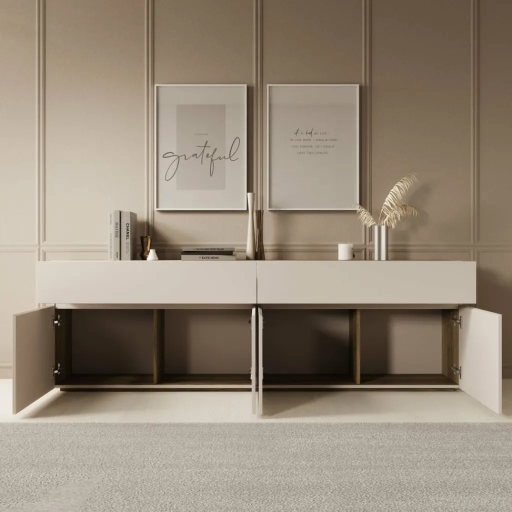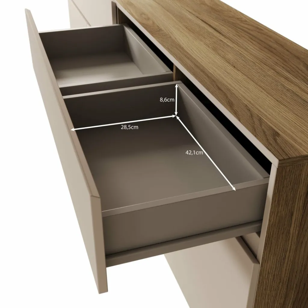 Het Cumi dressoir is uitgevoerd in een combinatie van beige en eikenpatroon. De beige fronten zorgen voor een strak geheel, terwijl het eikenpatroon aan de zijkanten en het bovenblad een duidelijk houtaccent toevoegt.