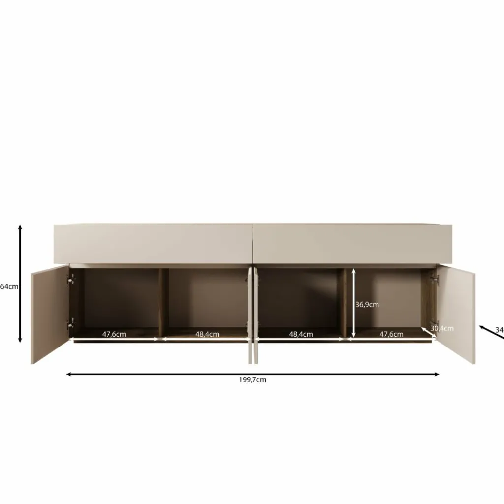 Met een breedte van 200 cm, een diepte van 34 cm en een hoogte van 64 cm biedt dit dressoir ruime opbergmogelijkheden in een slank formaat. Het maximale draaggewicht van het meubel bedraagt 20 kg.