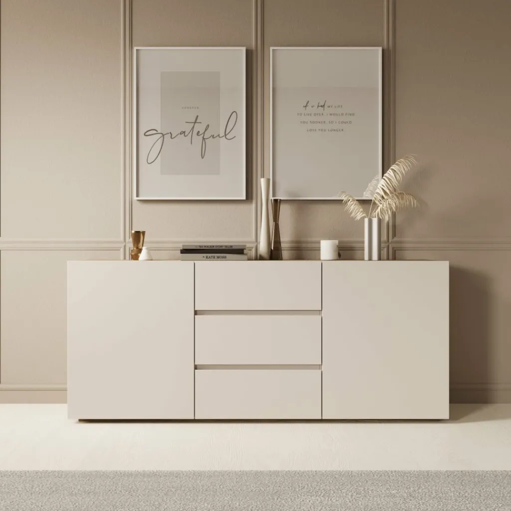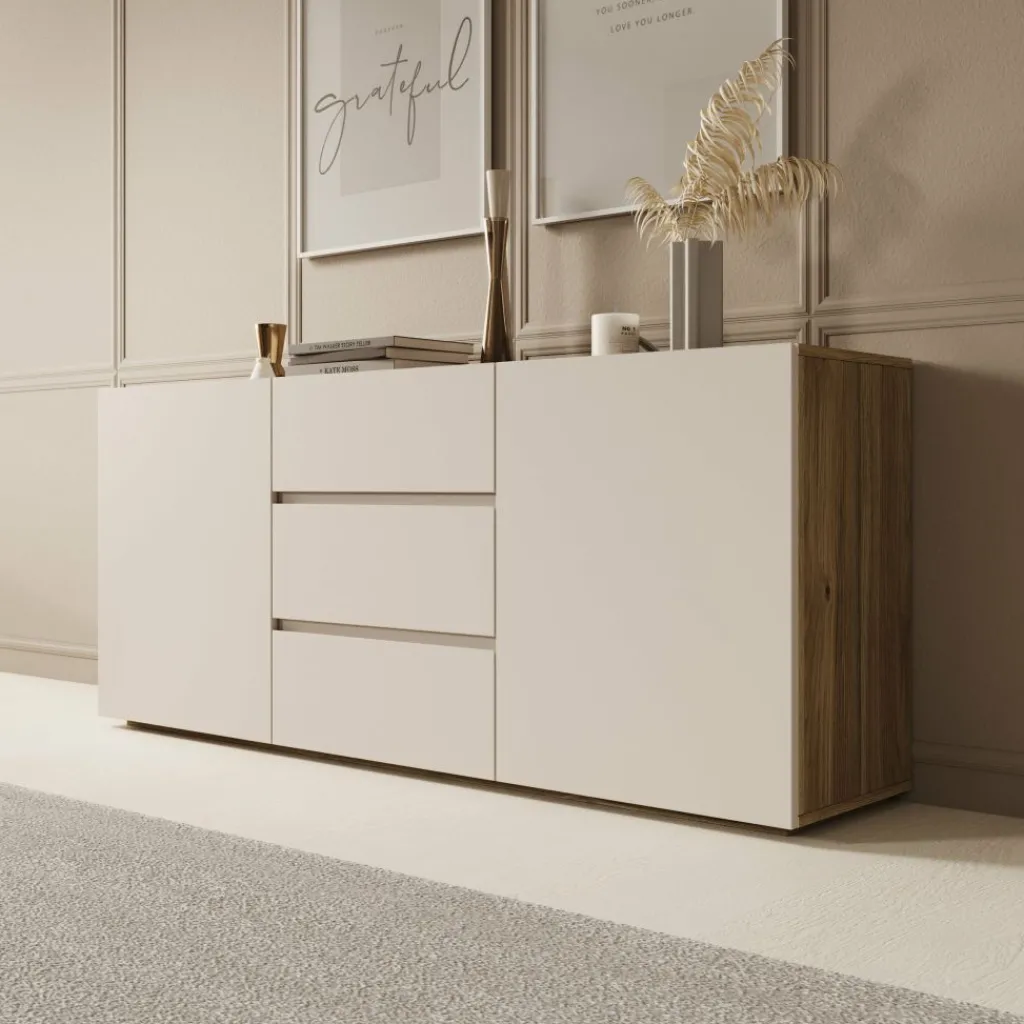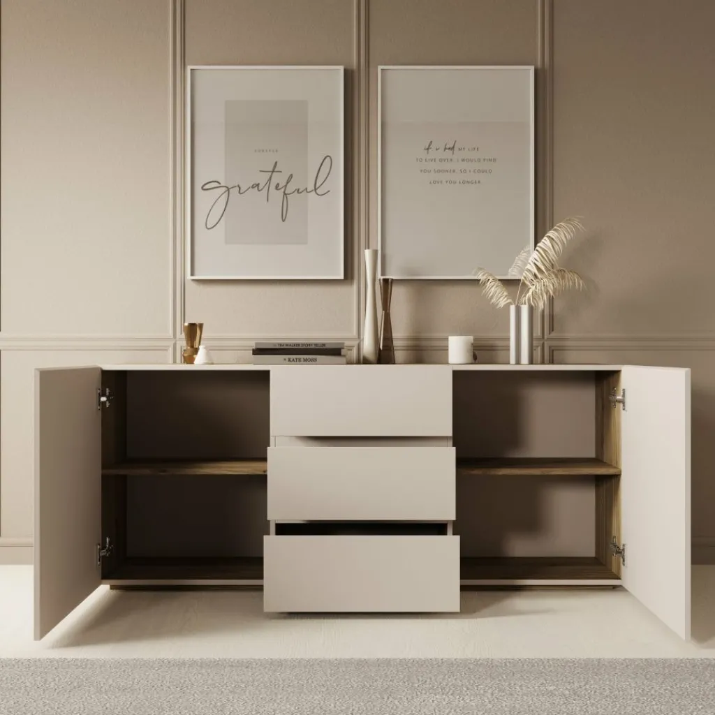 Het dressoir is voorzien van twee ruime kastdelen met legplanken en drie centrale lades. Hierdoor kun je eenvoudig afwisselen tussen gesloten opbergruimte en overzichtelijke lade-opslag. Servies, documenten of andere spullen berg je netjes uit het zicht op, terwijl het bovenblad geschikt is voor decoratie of dagelijkse items.
