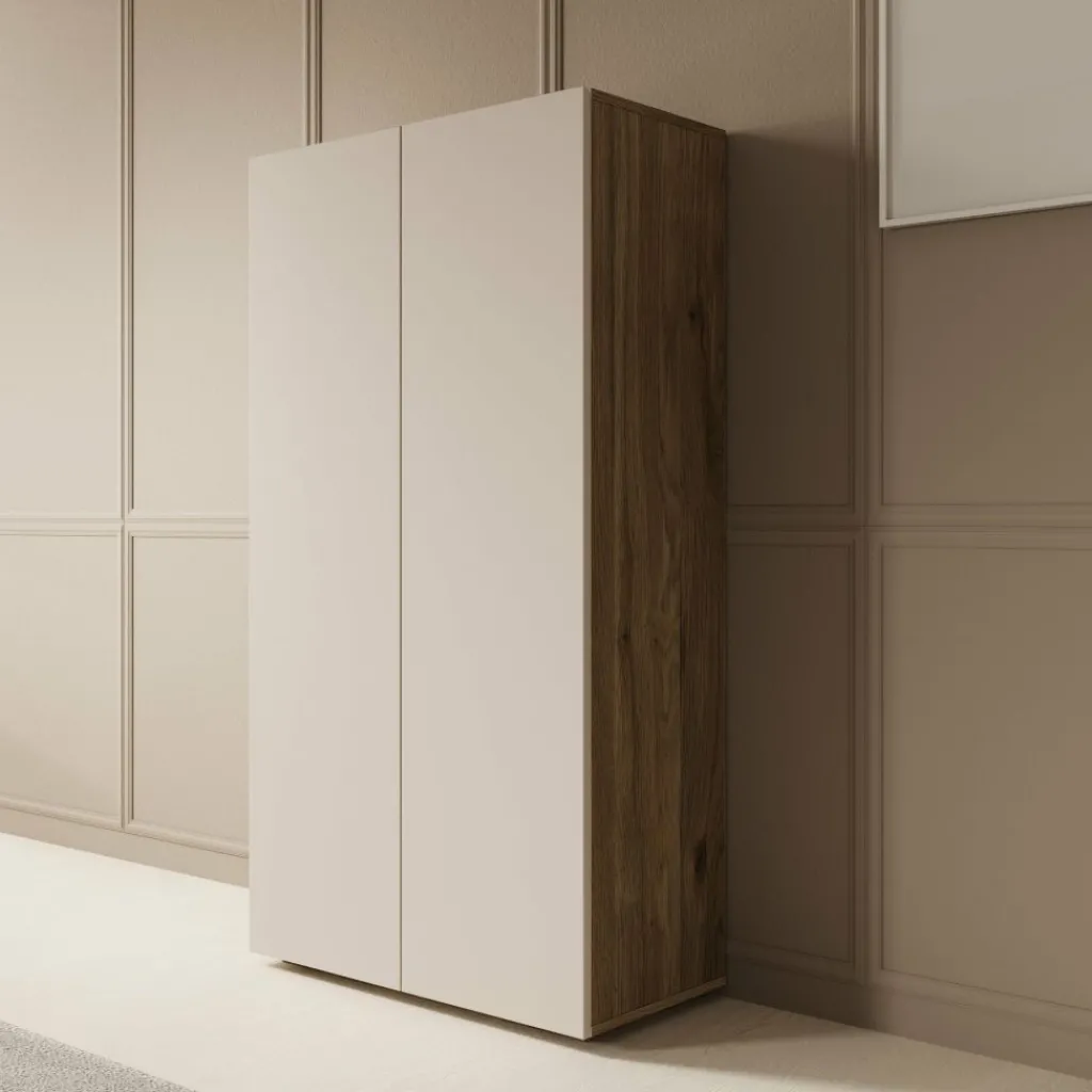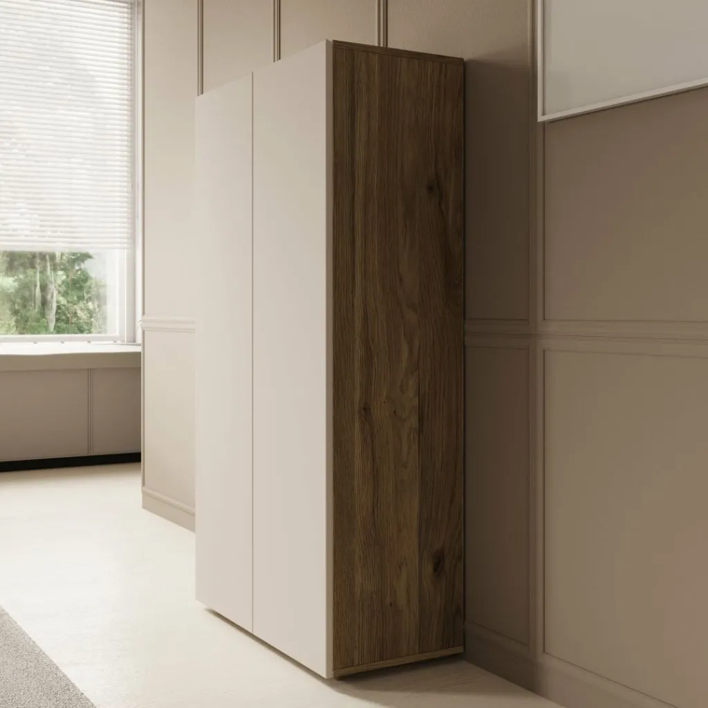 De Cumi schoenenkast in beige met eikenpatroon is een praktische oplossing voor het netjes opbergen van schoenen in hal of gang. De strakke beige fronten zorgen voor een rustige uitstraling, terwijl het eikenpatroon aan de zijkant een duidelijk houtaccent toevoegt.
