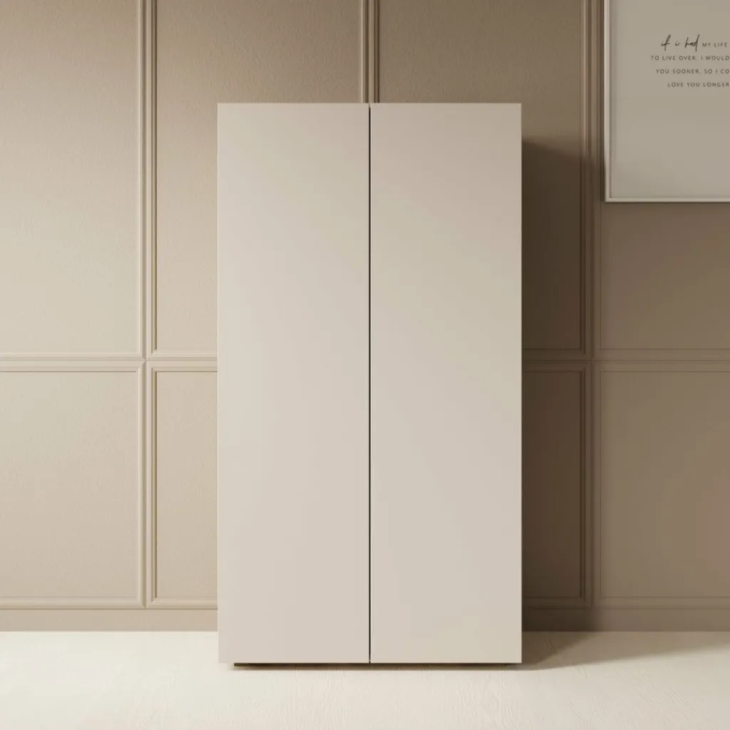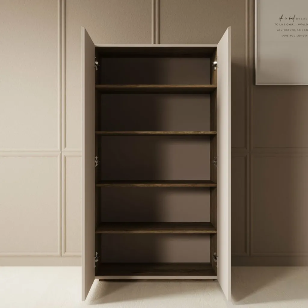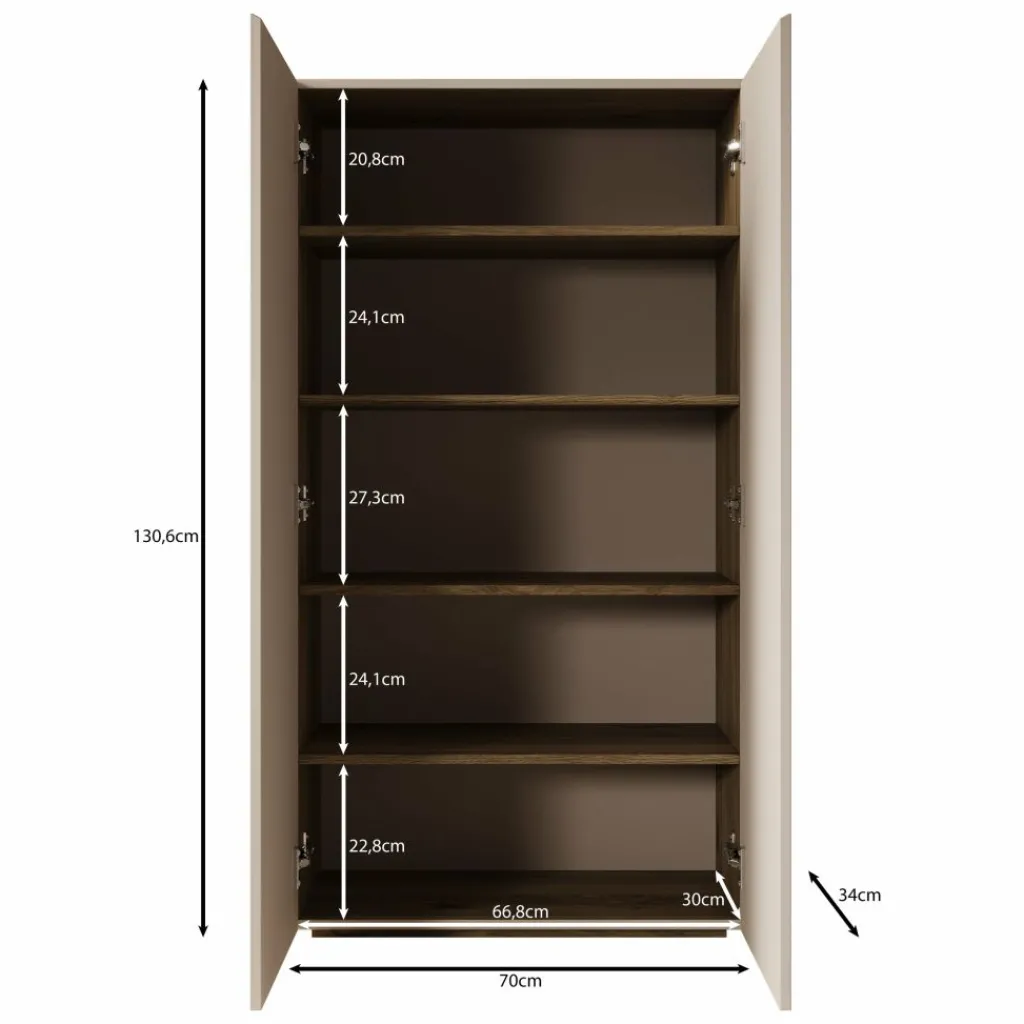 Achter de twee deuren bevinden zich meerdere legplanken, verdeeld over verschillende niveaus. Hierdoor kun je je schoenen overzichtelijk plaatsen en gescheiden houden. Met een breedte van 70 cm en een diepte van 34 cm is dit model compact genoeg voor kleinere ruimtes, terwijl de hoogte van 130 cm toch voldoende opbergruimte biedt.