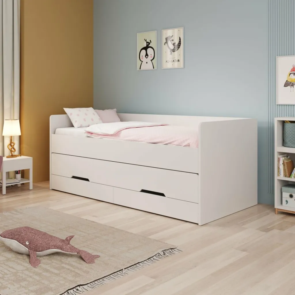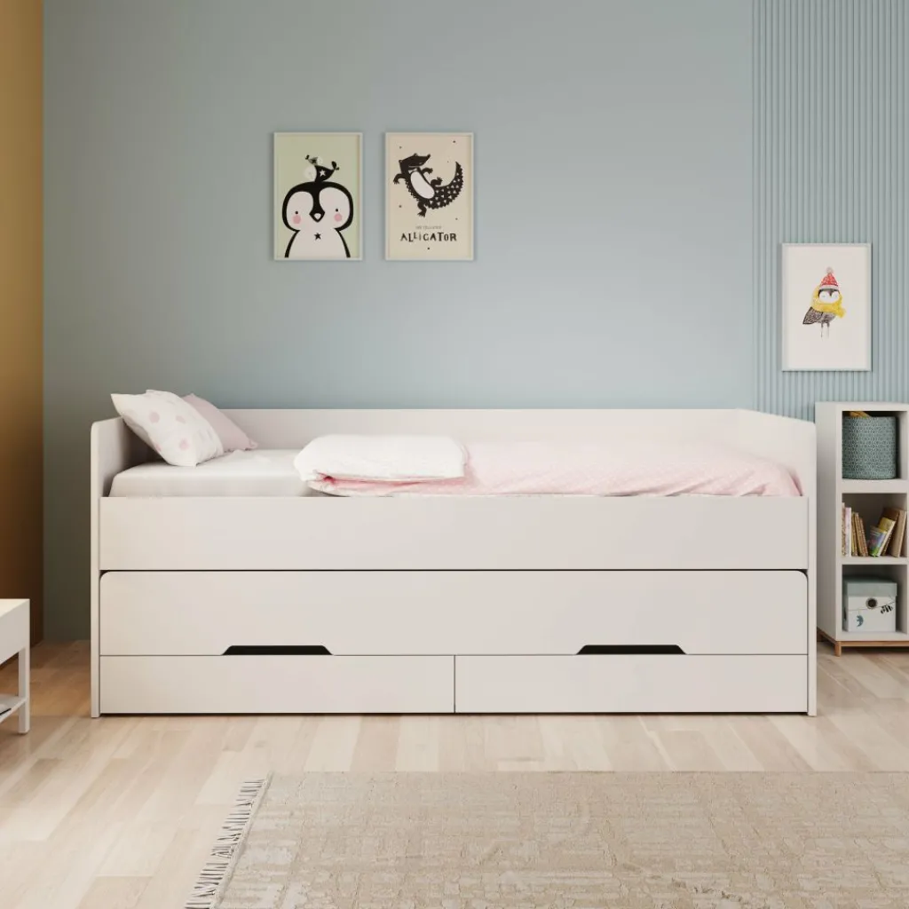 Het Daiquiri kinderbed is een praktische slaapoplossing met een strak, wit ontwerp dat goed past in zowel moderne als speelse kinderkamers. Het bed heeft een rechte omlijsting met verhoogde zijpanelen, waardoor je kind veilig en comfortabel ligt.