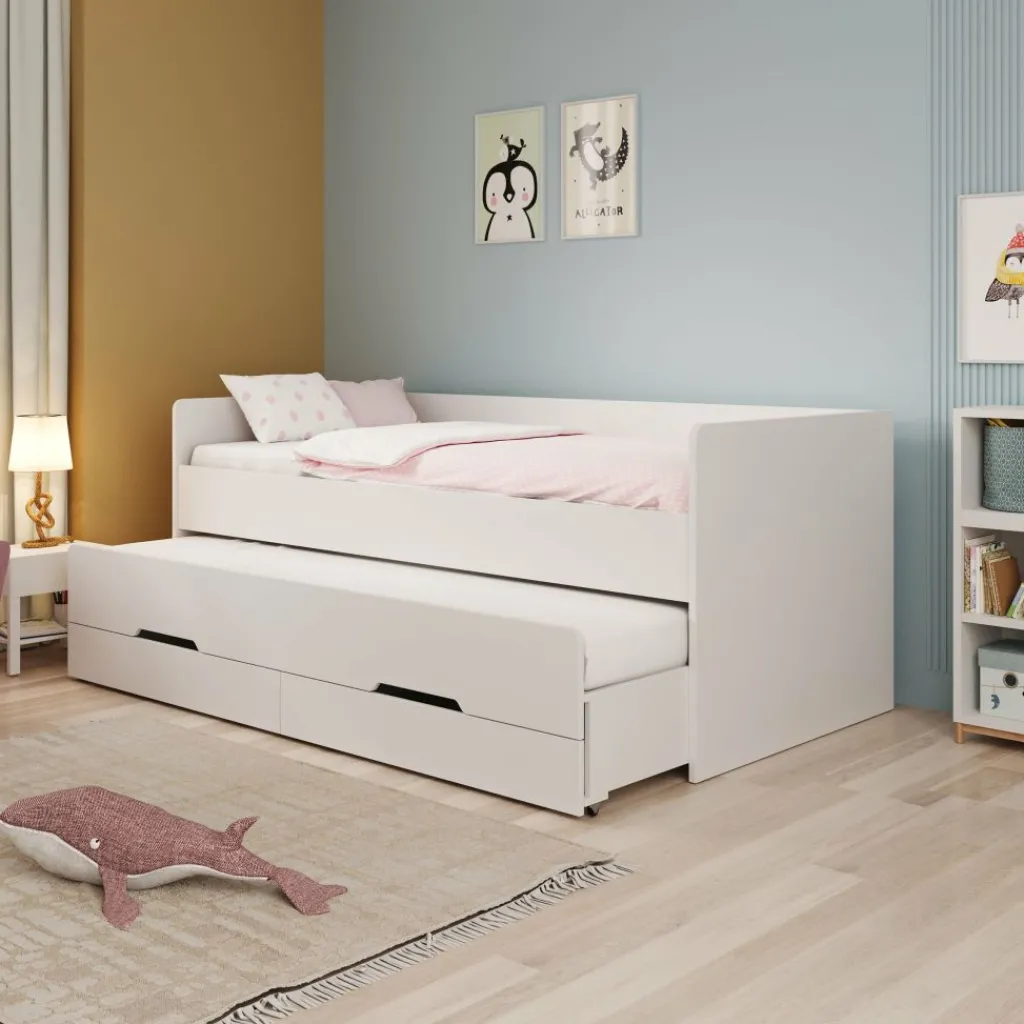 Onder het bed bevindt zich een uitschuifbaar logeerbed op wieltjes. Hiermee creëer je in één beweging een extra slaapplek, ideaal voor logeerpartijtjes. Daarnaast zijn er twee geïntegreerde lades voor extra opbergruimte, handig voor speelgoed, beddengoed of kleding.