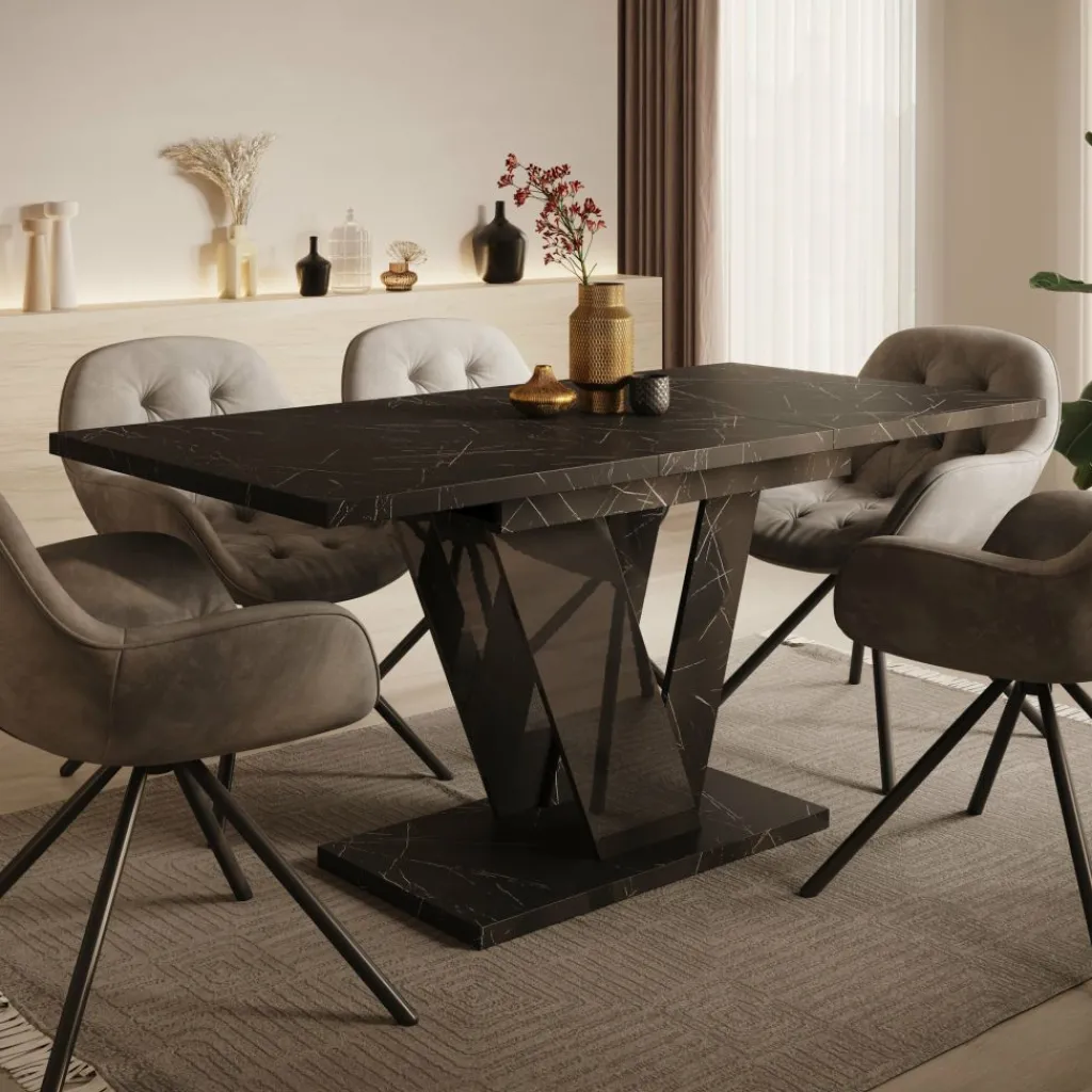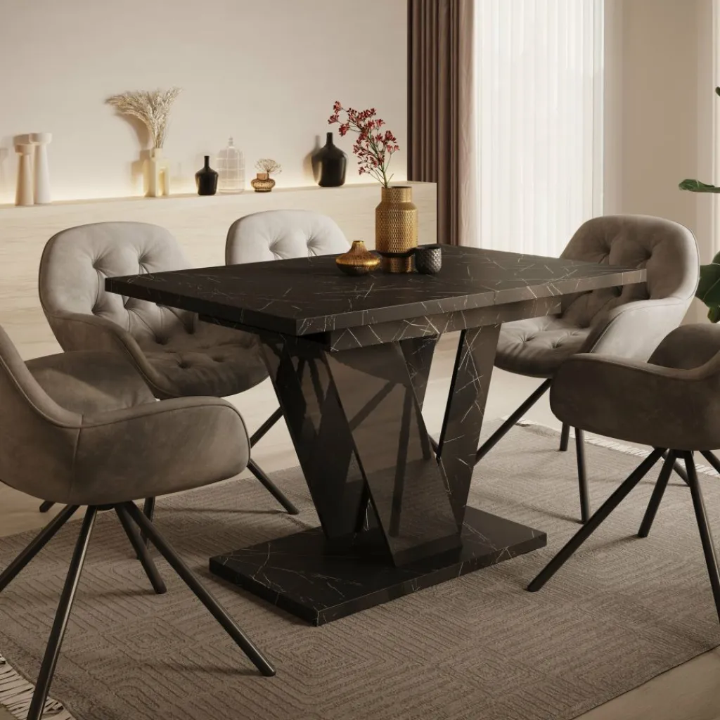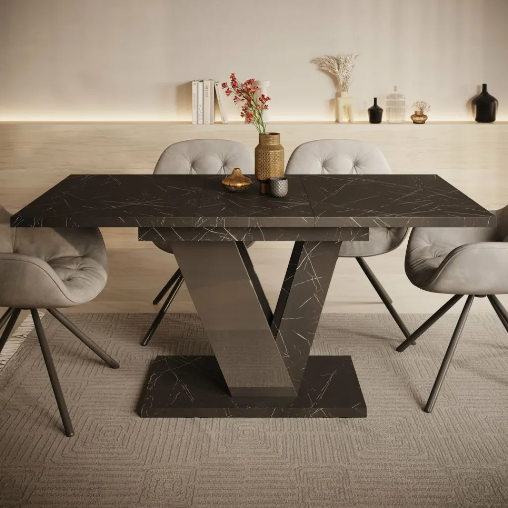 De eetkamertafel Dayman combineert moderne stijl met praktische functionaliteit. Het zwarte marmerlook blad zorgt voor een luxe uitstraling, terwijl het opvallende V-vormige onderstel zorgt voor een krachtig designstatement in je eethoek.