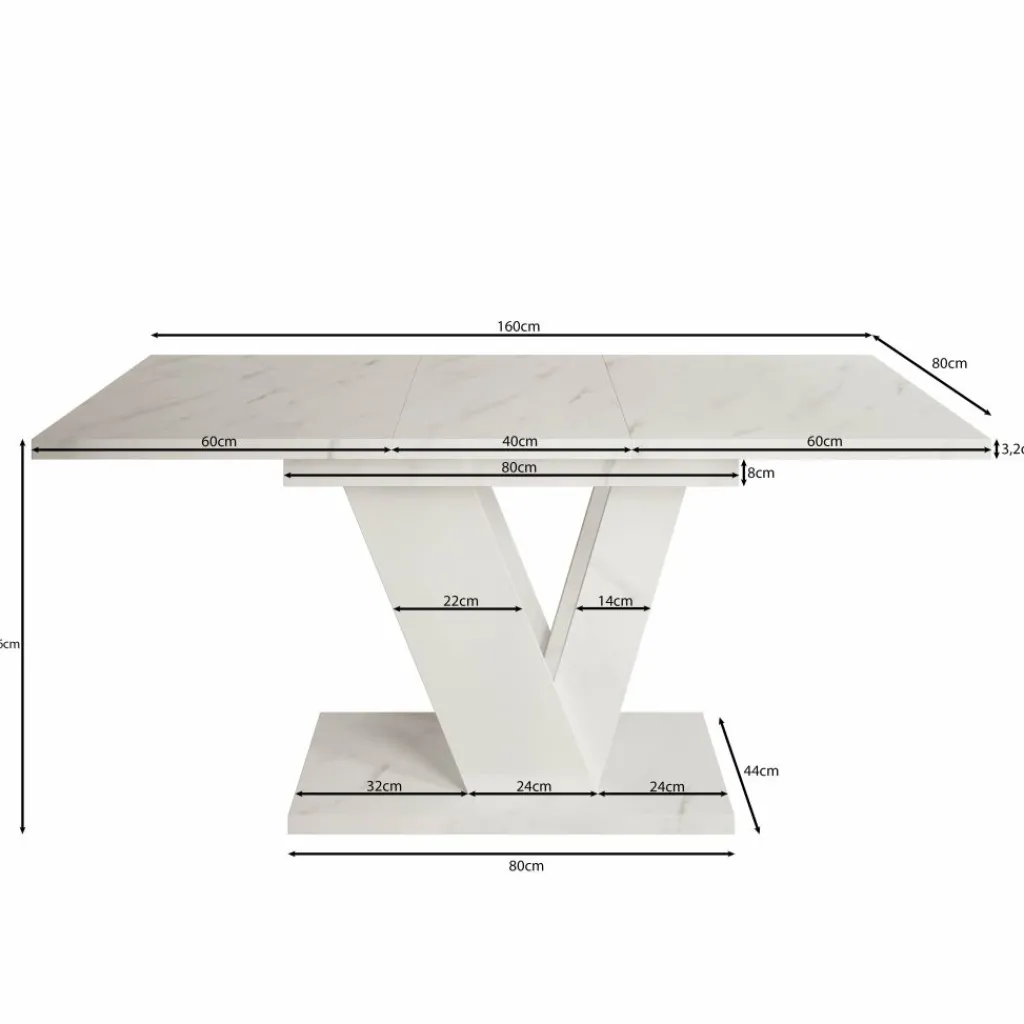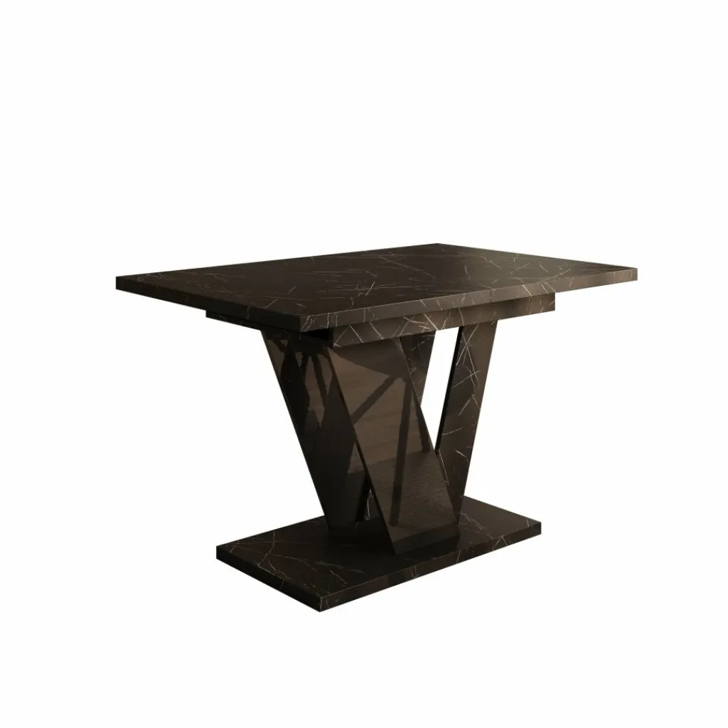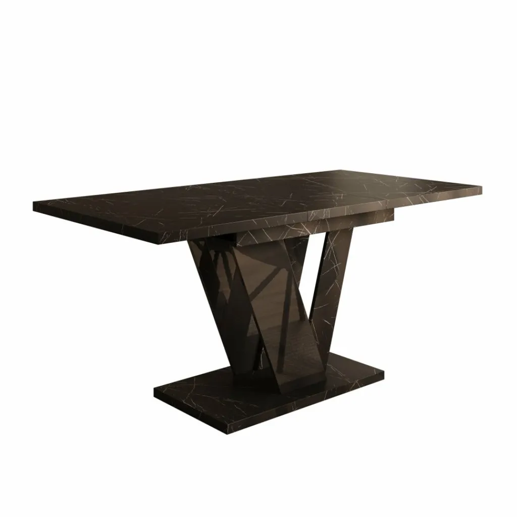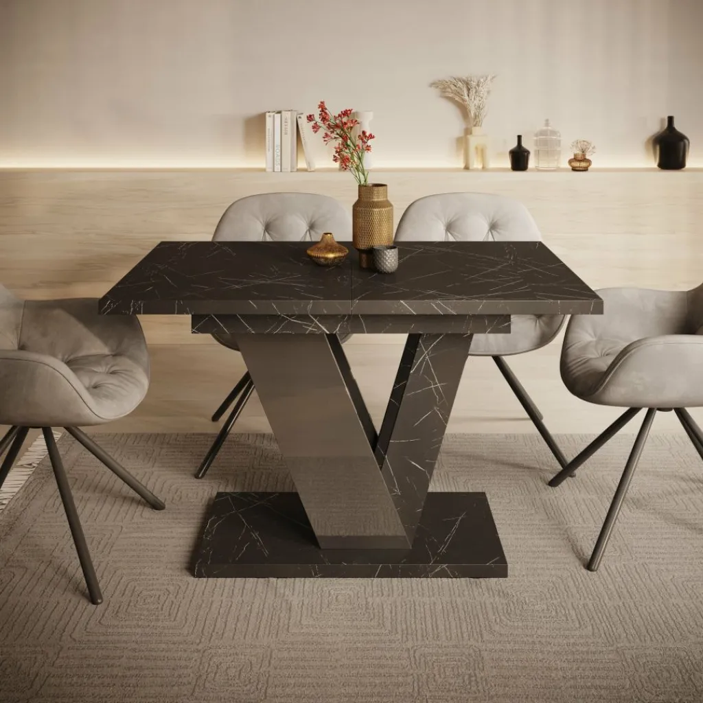 De eetkamertafel Dayman combineert moderne stijl met praktische functionaliteit. Het zwarte marmerlook blad zorgt voor een luxe uitstraling, terwijl het opvallende V-vormige onderstel zorgt voor een krachtig designstatement in je eethoek.