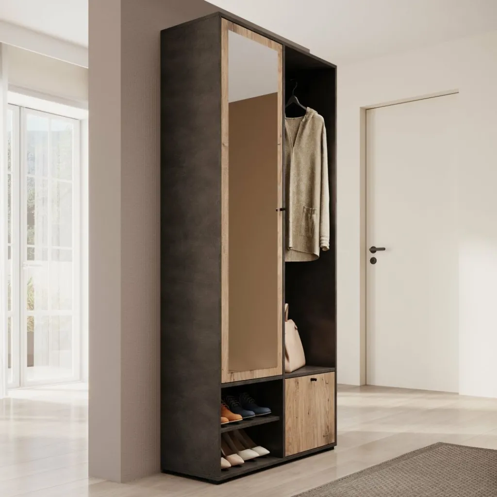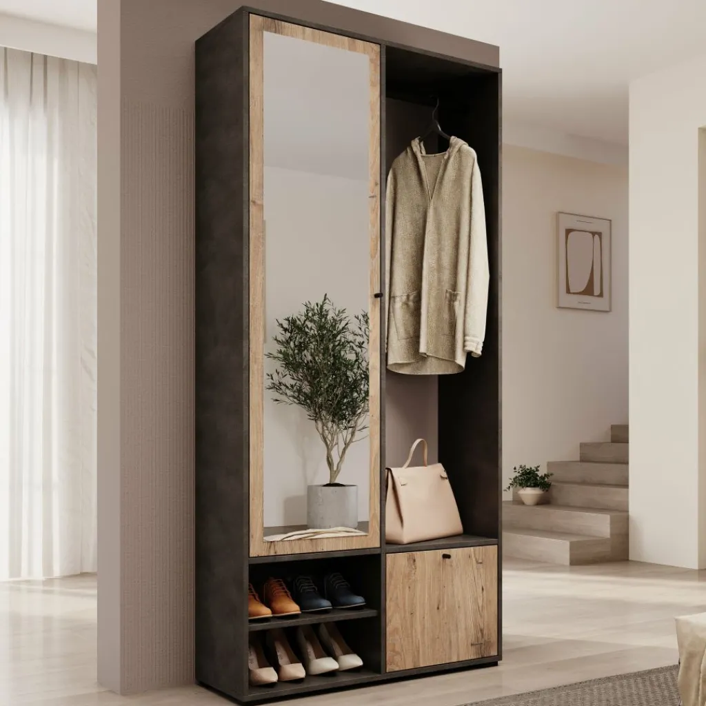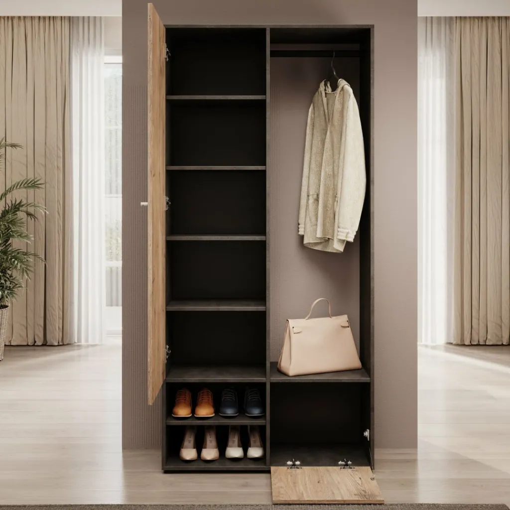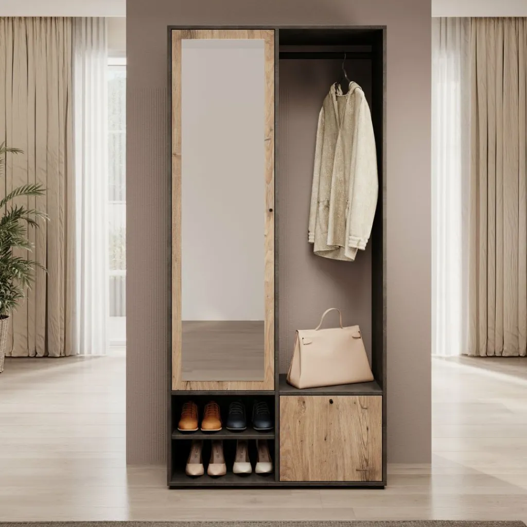 De combinatie van grijs en eiken geeft het meubel een moderne, natuurlijke uitstraling die goed past in verschillende interieurs. Het compacte formaat maakt de kast geschikt voor zowel kleine als grotere hallen.