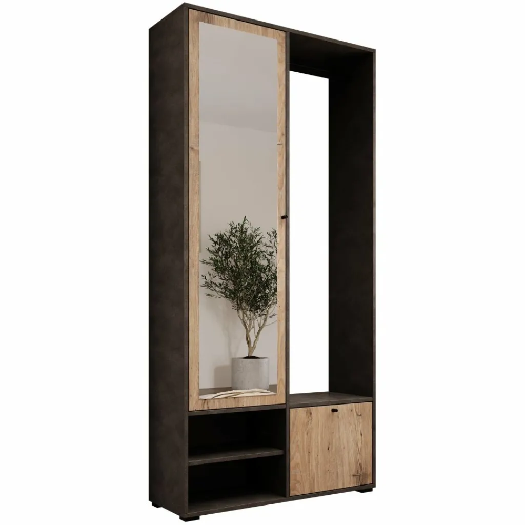 De Deacon halkast in grijs en eiken heeft een praktisch ontwerp met voldoende opbergruimte voor jassen, schoenen en accessoires. De kast beschikt over een spiegeldeur met legplanken erachter, een open kapstokgedeelte met roede en onderin een klepdeur met extra vakken.