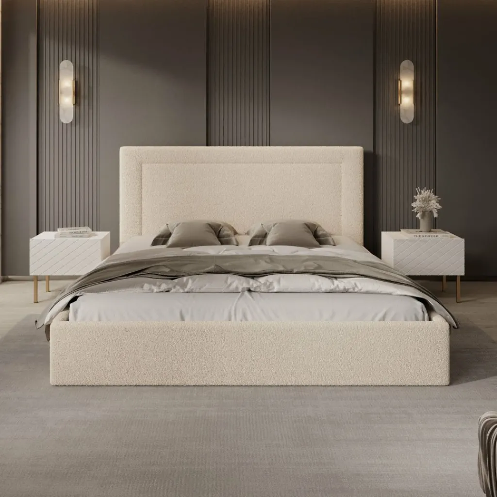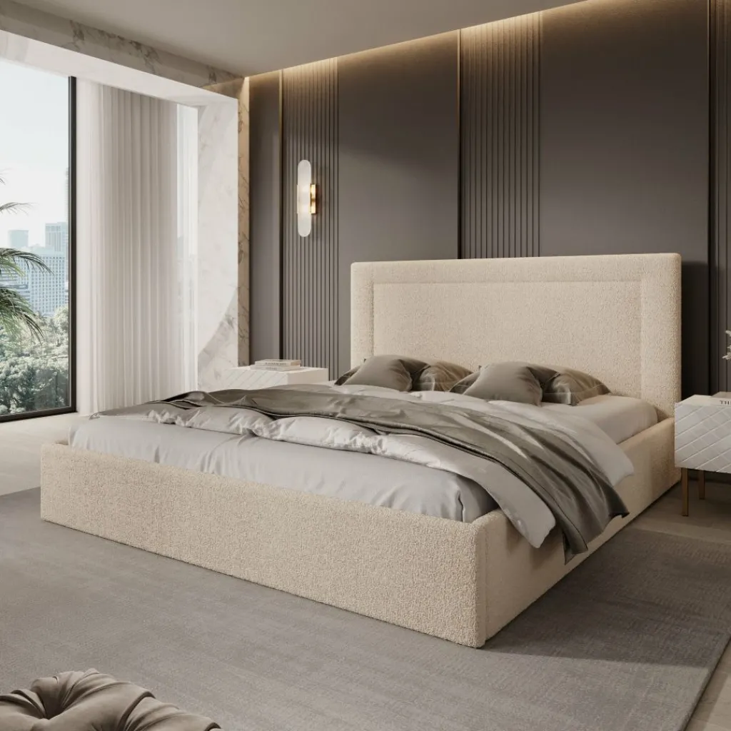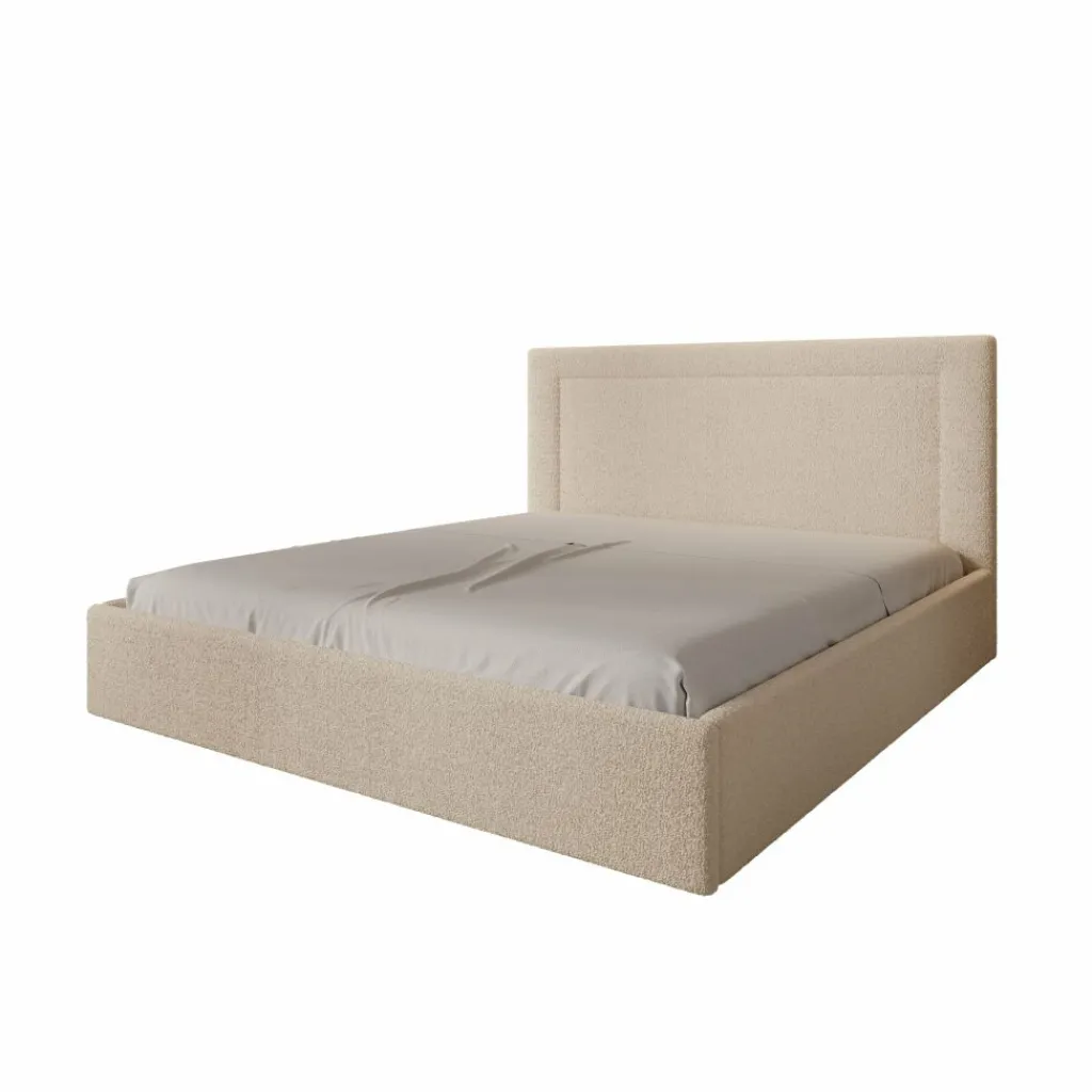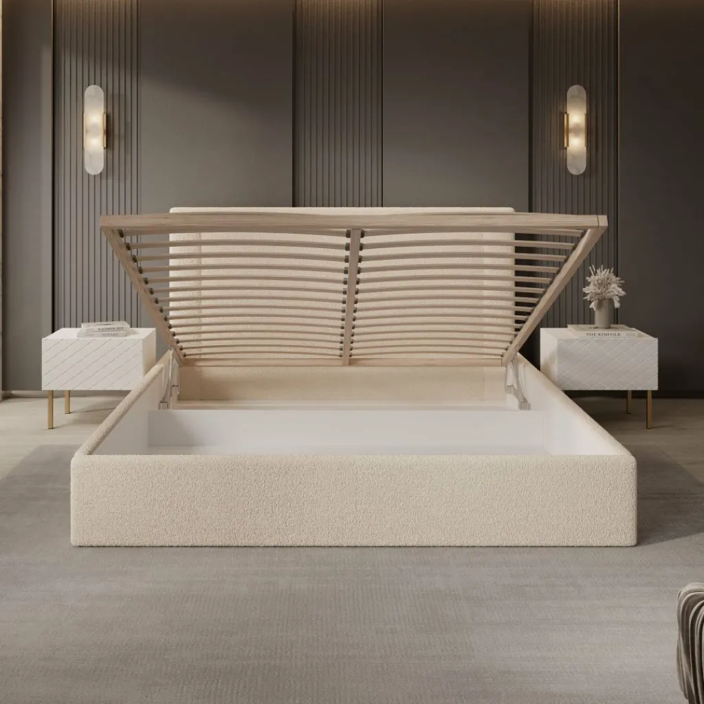 De 180×200 cm variant van het Dejada-bed biedt extra breedte en is volledig bekleed in dezelfde beige teddystof. Het model heeft een stevig hoofdbord en een geïntegreerde opbergruimte onder het bed. Het frame klapt omhoog om de volledige opbergruimte toegankelijk te maken. Handig voor het opbergen van seizoensspullen of reservebeddengoed. Het bed wordt zonder matras geleverd.