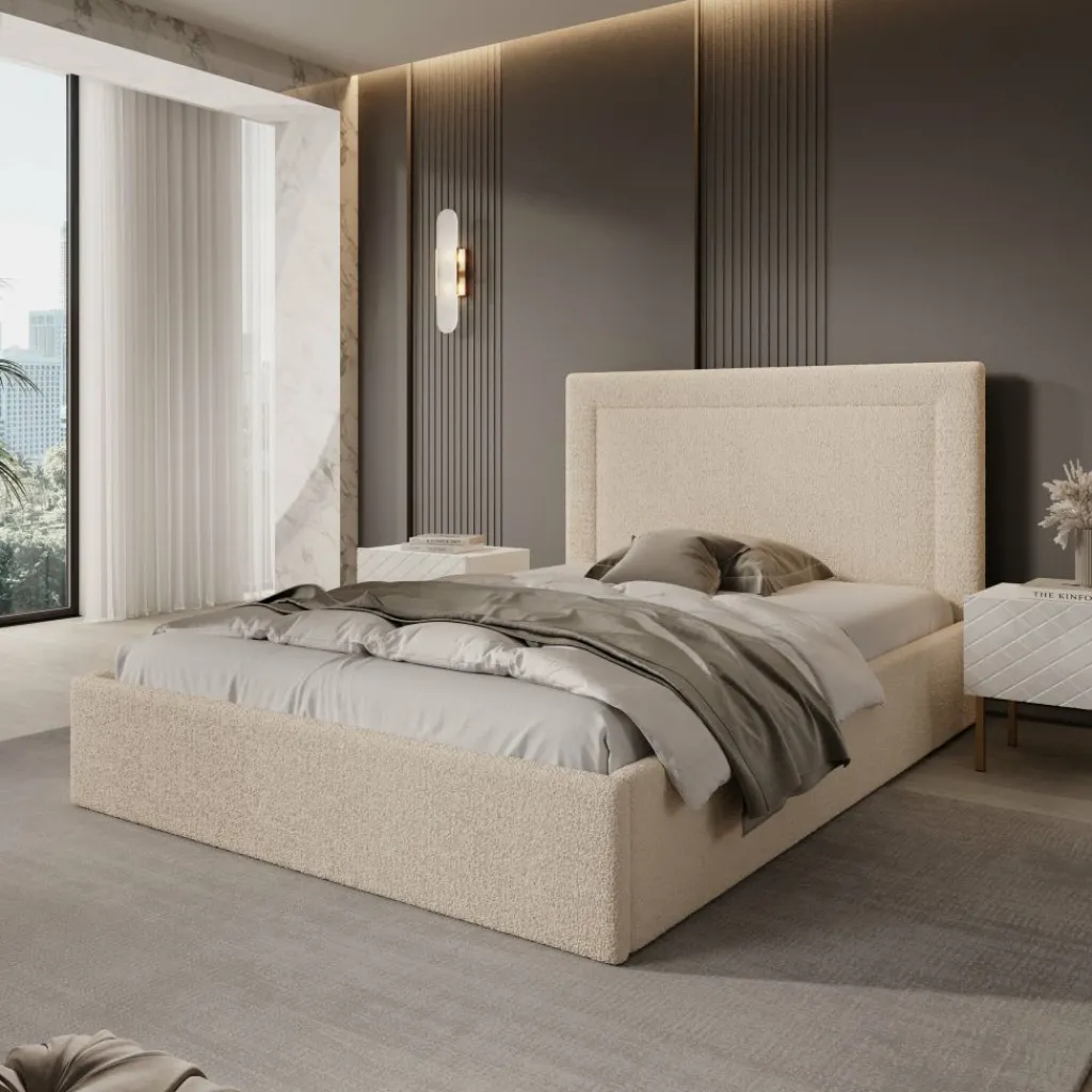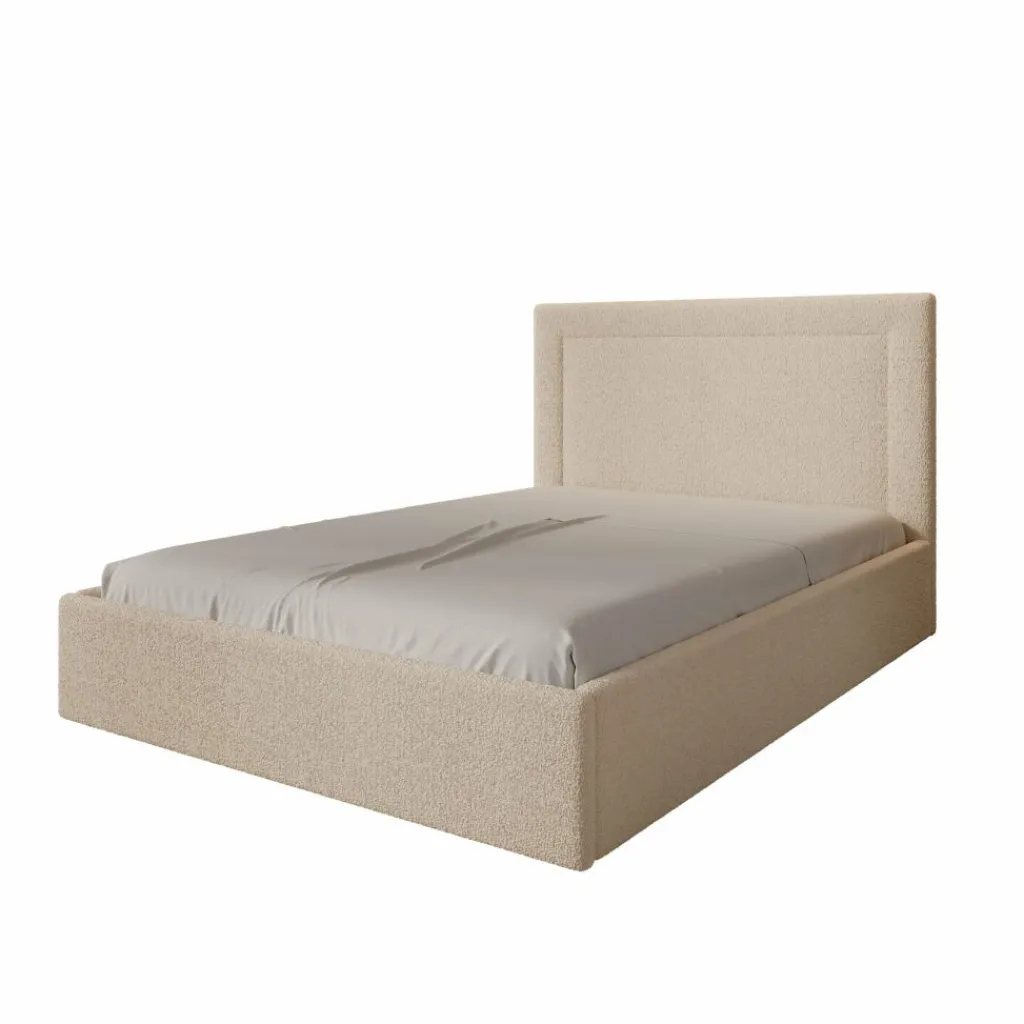 Het Dejada-bed heeft een recht ontwerp met een beklede omranding en een hoog hoofdbord. De bekleding is uitgevoerd in beige teddystof. Onder het bed zit een opbergruimte die toegankelijk is via het omhoogklapbare frame. Dit biedt extra ruimte voor bijvoorbeeld beddengoed of overige spullen. Het bed wordt zonder matras geleverd.