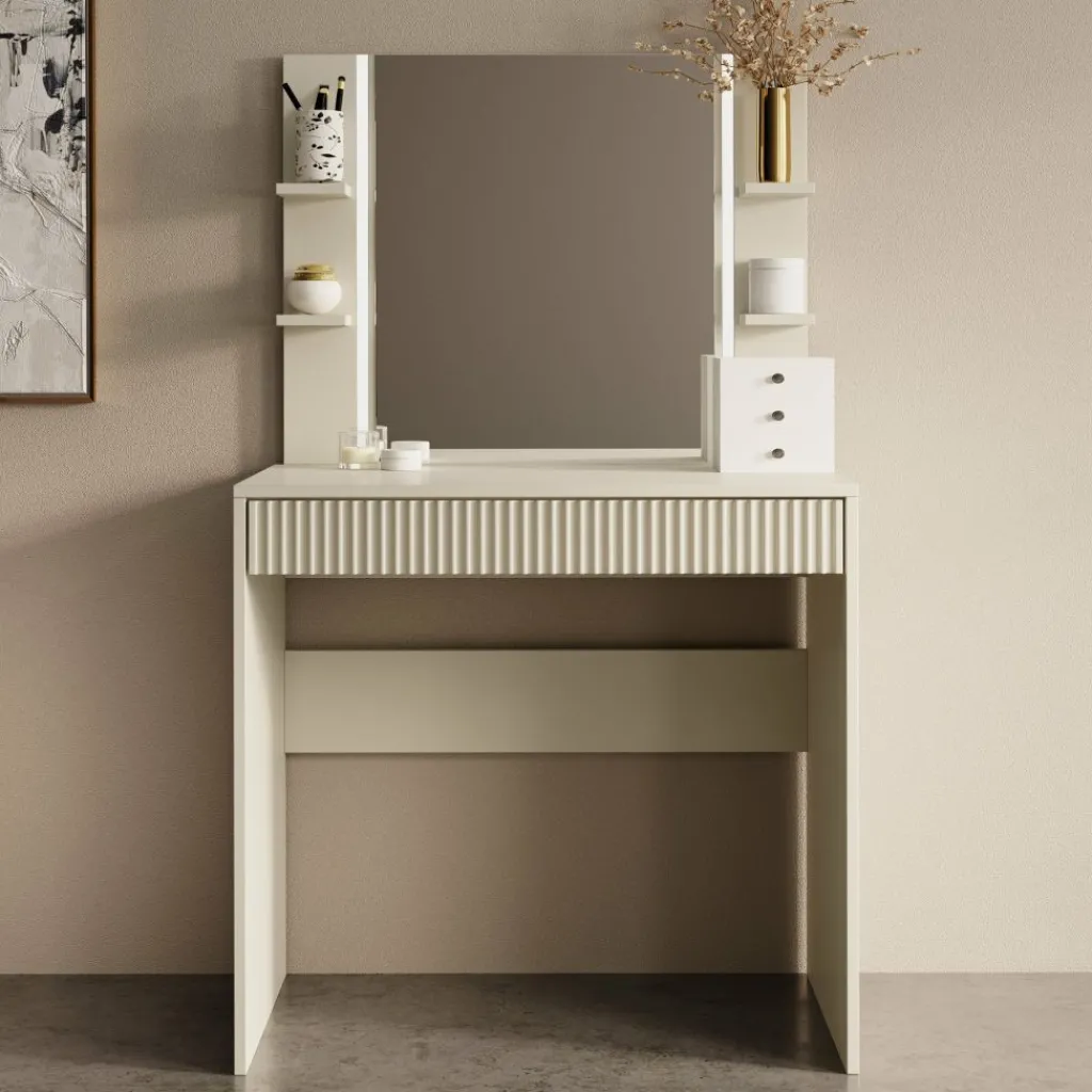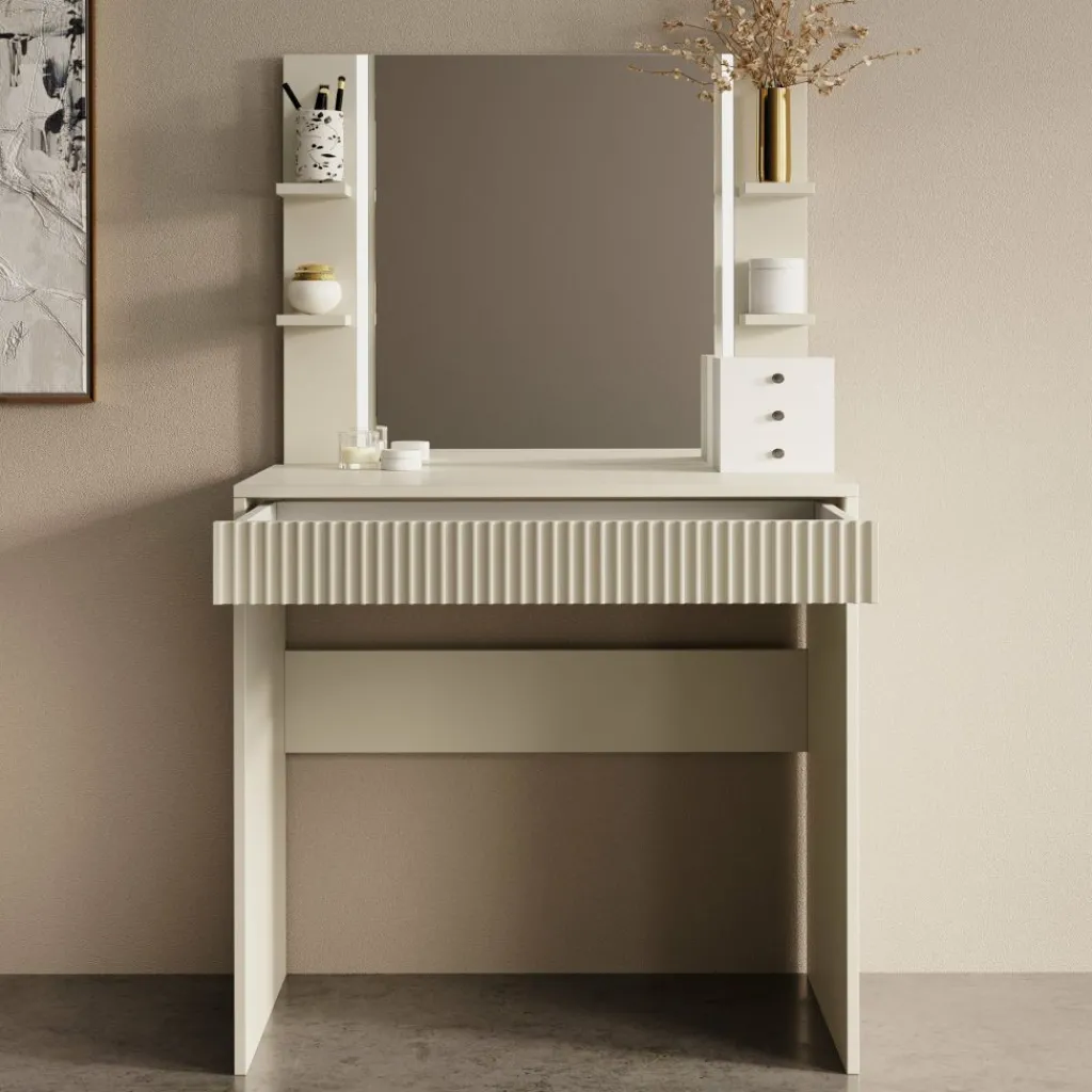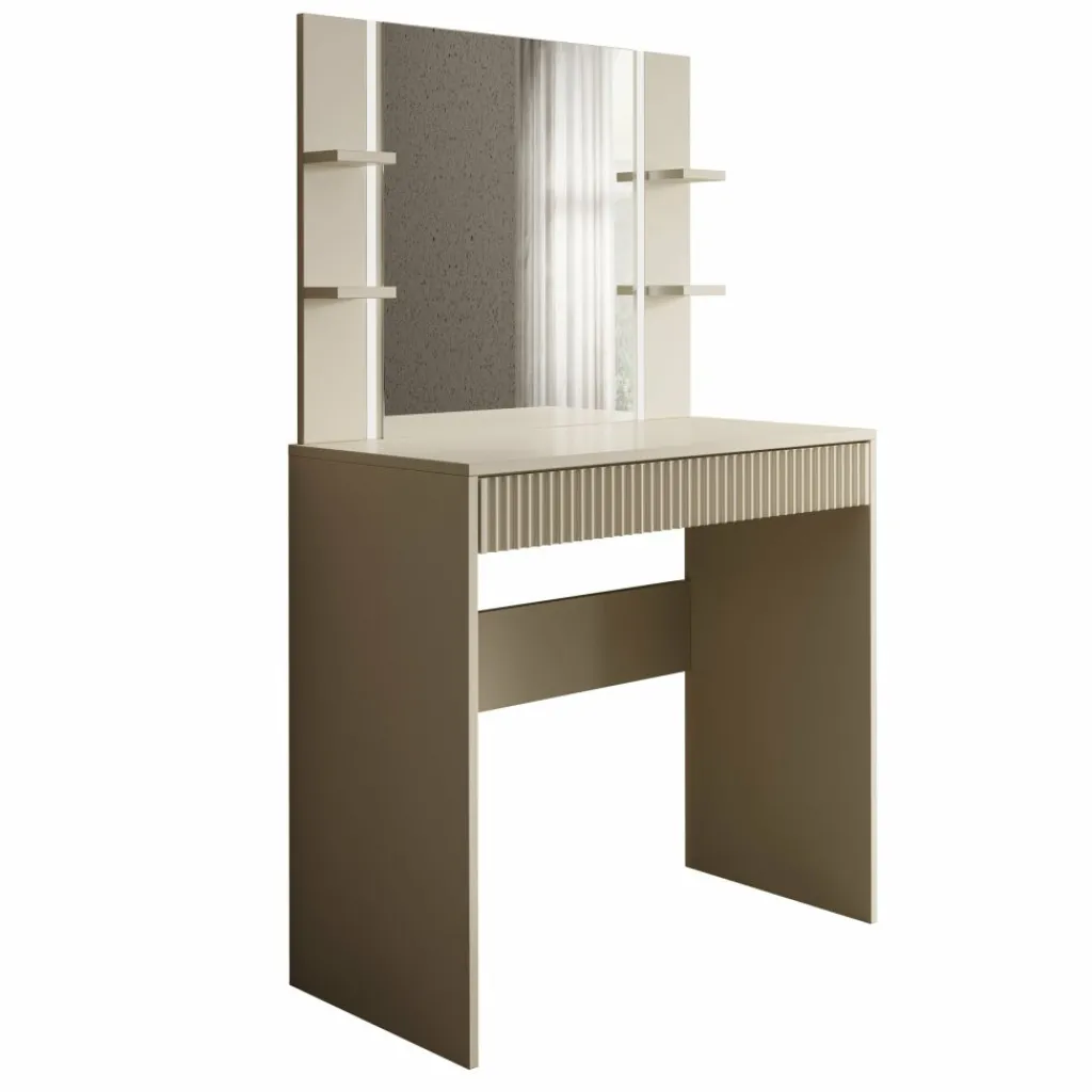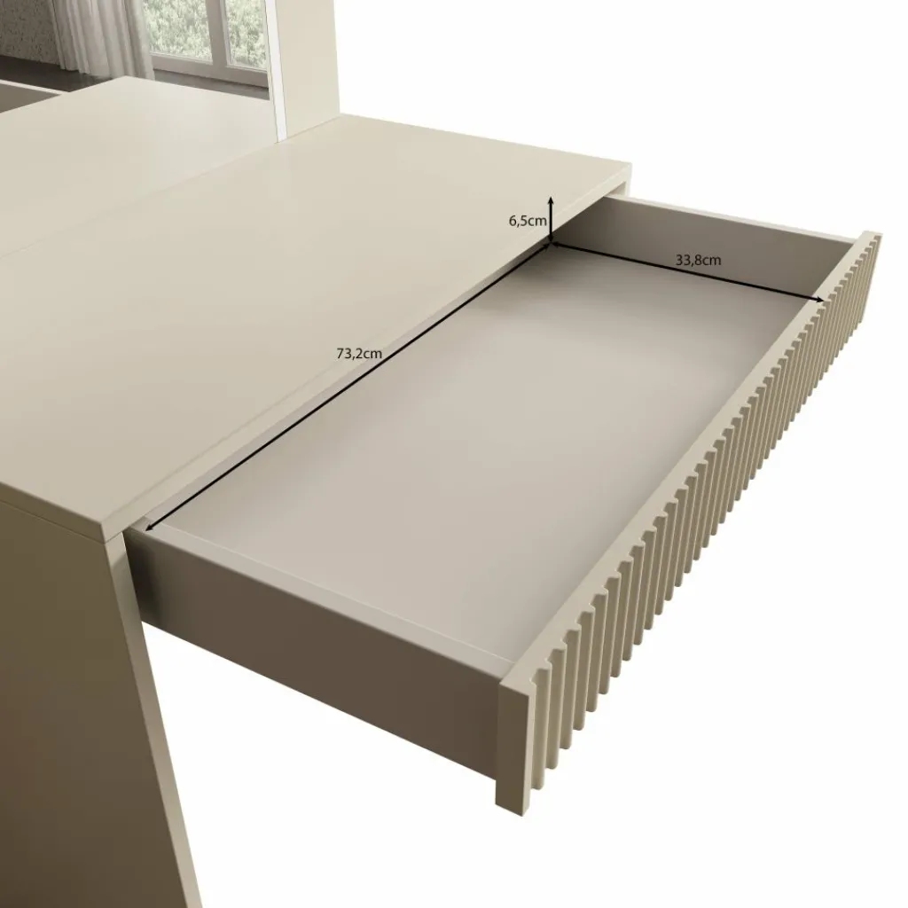 De kaptafel beschikt over één brede lade, volledig greeploos voor een strak en modern uiterlijk. De voorkant van de lade is voorzien van een verticaal lattenpatroon, wat zorgt voor een subtiele maar luxe uitstraling.