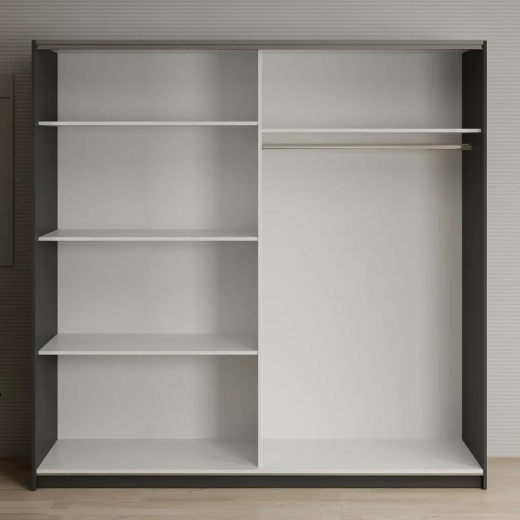 De binnenzijde van de kast is overzichtelijk en functioneel ingedeeld. Aan de rechterzijde bevindt zich een kledingroede, geschikt voor het ophangen van kledingstukken zoals jassen, overhemden of jurken. Daarnaast beschikt de kast over 5 legplanken voor het opbergen van bijvoorbeeld tassen, opgevouwen kleding of beddengoed.