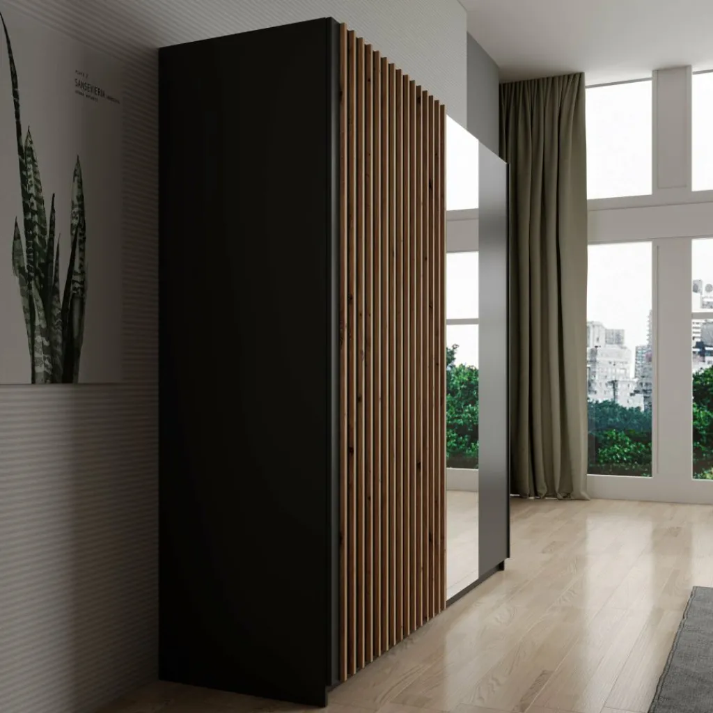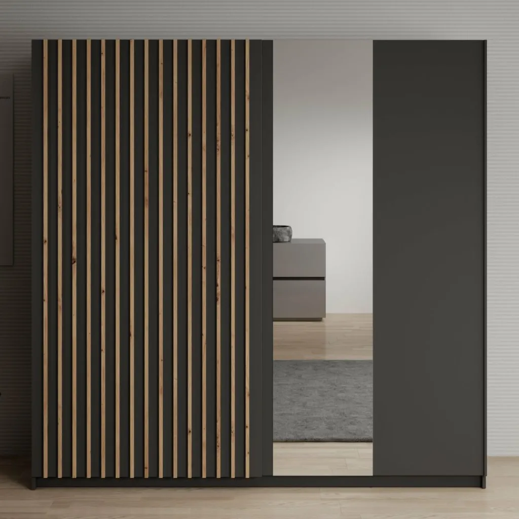 Kledingkast Deliryon is een moderne garderobekast in mat zwarte kleur. De kast is voorzien van twee schuifdeuren zonder grepen voor een minimalistische uitstraling. Eén van de deuren is afgewerkt met een grote spiegel, ideaal om snel je outfit te checken en tegelijkertijd extra licht en ruimtelijkheid in de slaapkamer te brengen. De andere deur beschikt over een trendy latten paneel.