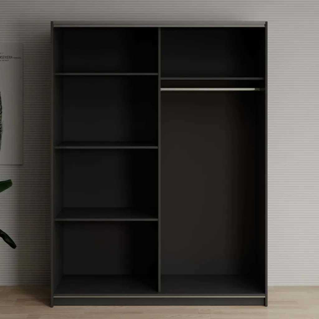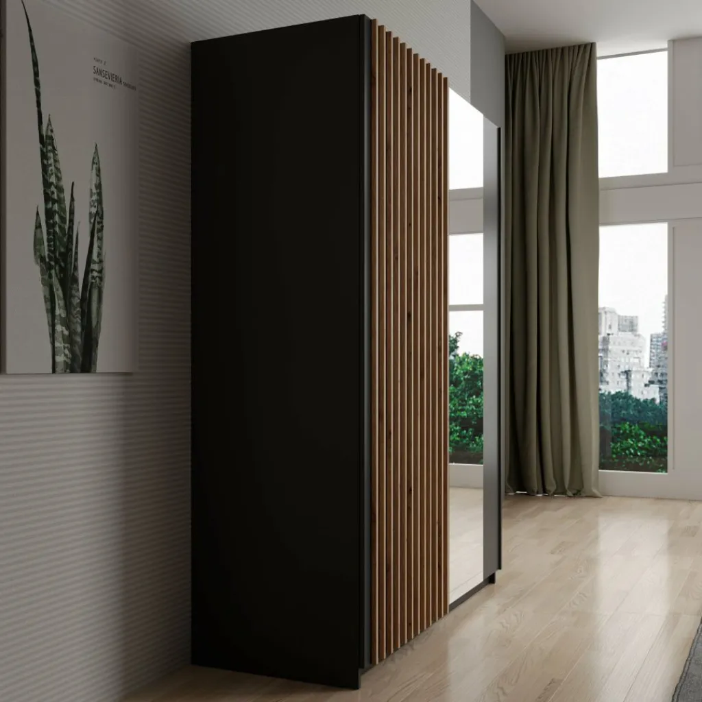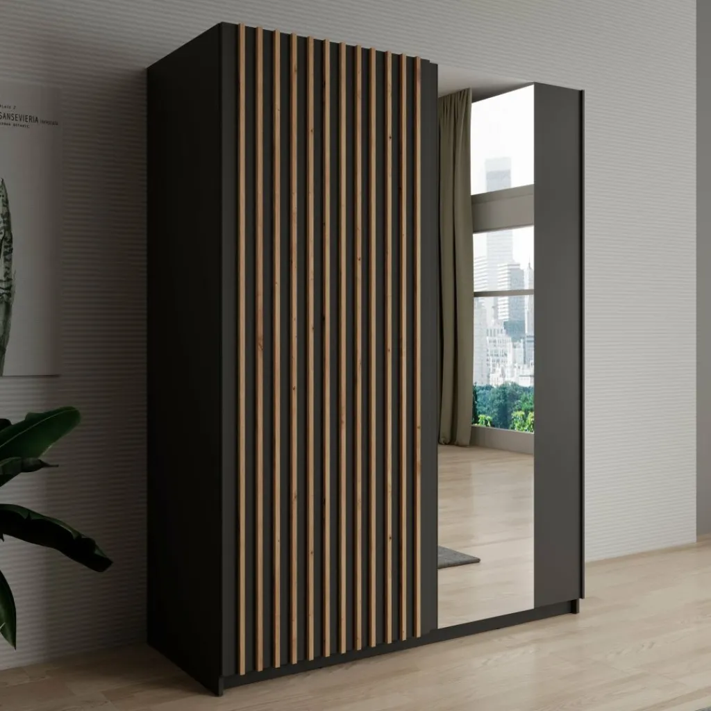 Kledingkast Deliryon is een moderne garderobekast in mat zwarte kleur. De kast is voorzien van twee schuifdeuren zonder grepen voor een minimalistische uitstraling. Eén van de deuren is afgewerkt met een grote spiegel, ideaal om snel je outfit te checken en tegelijkertijd extra licht en ruimtelijkheid in de slaapkamer te brengen. De andere deur beschikt over een trendy latten paneel.