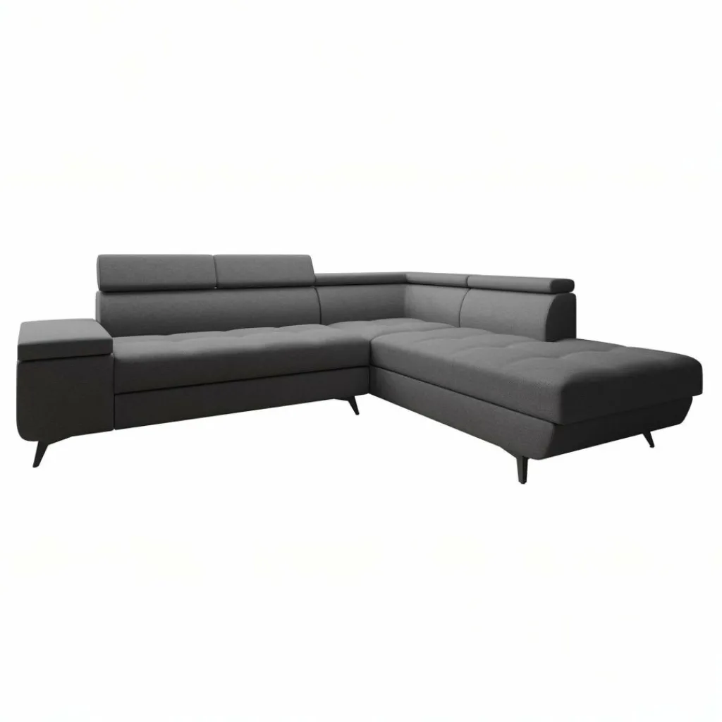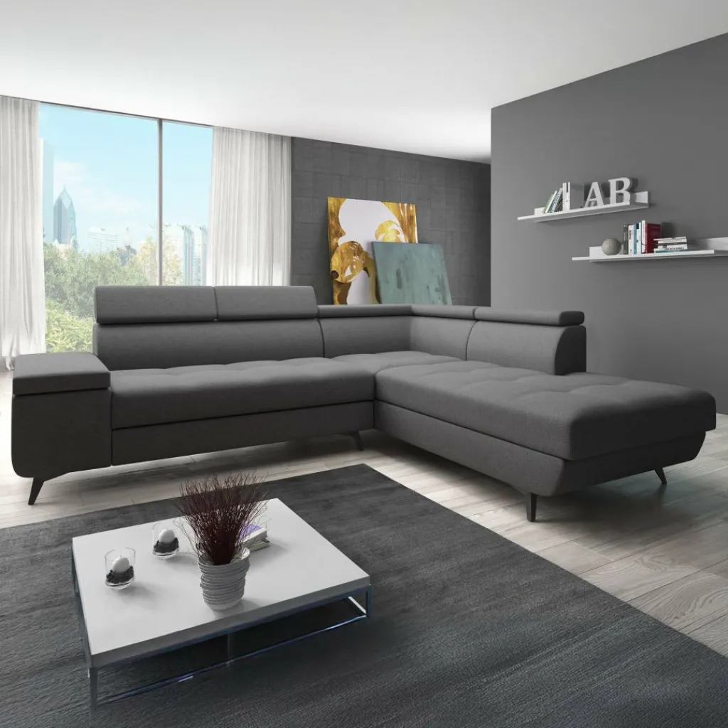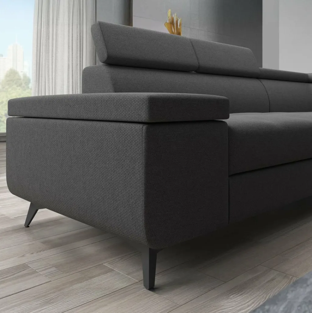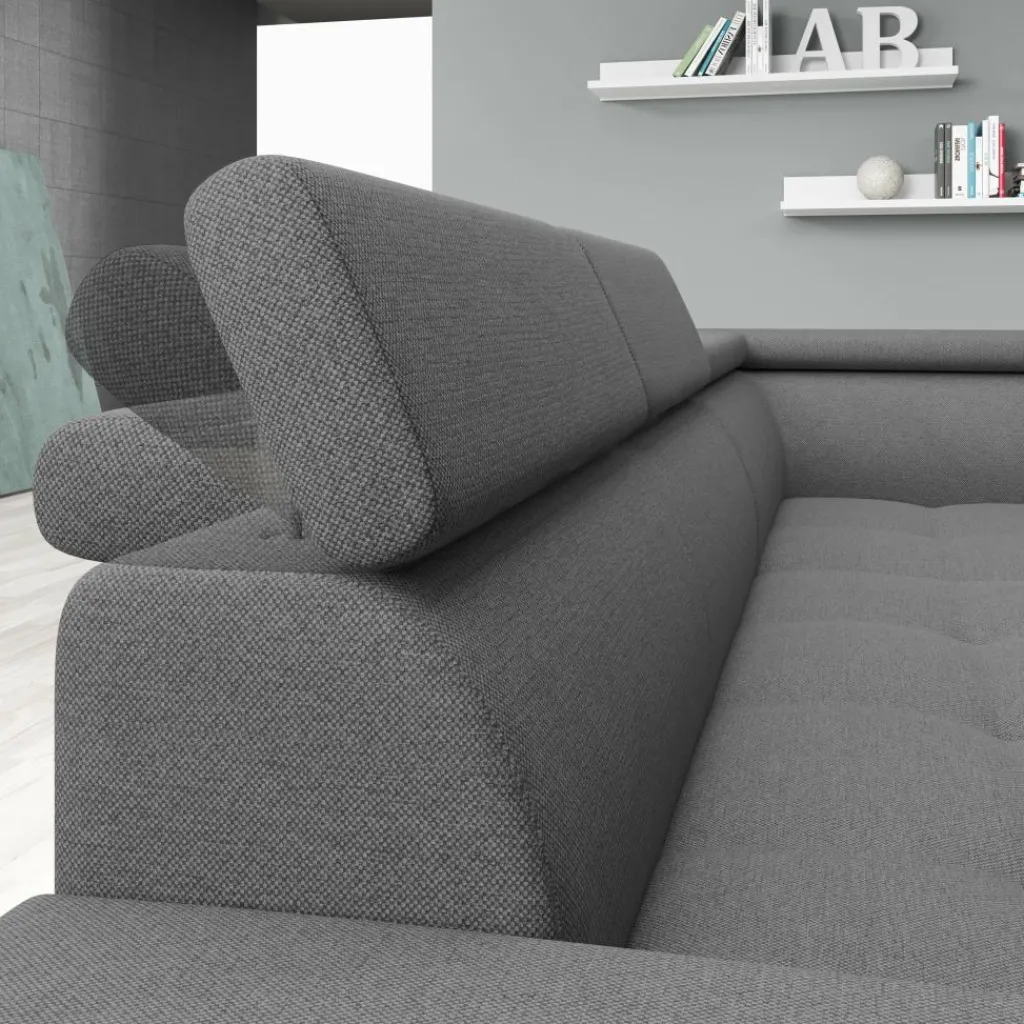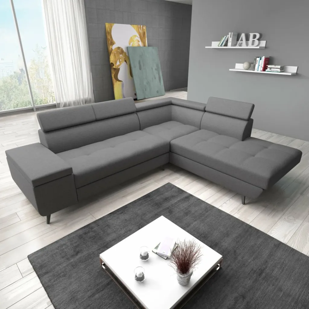 Hoekbank Destiny combineert moderne stijl met praktische opties. De grijze bekleding in stevige, onderhoudsvriendelijke stof geeft de bank een strakke en tijdloze uitstraling, terwijl de zachte vulling zorgt voor een comfortabele zitervaring.