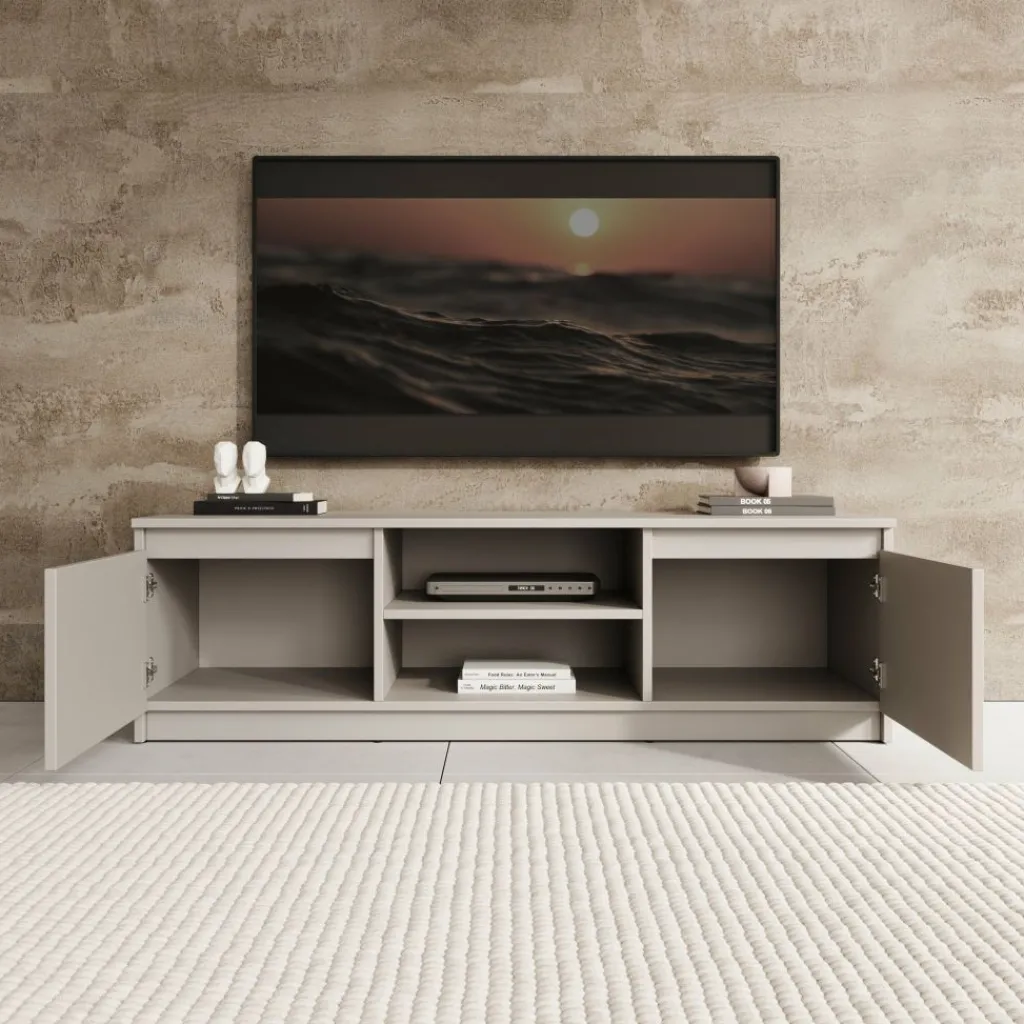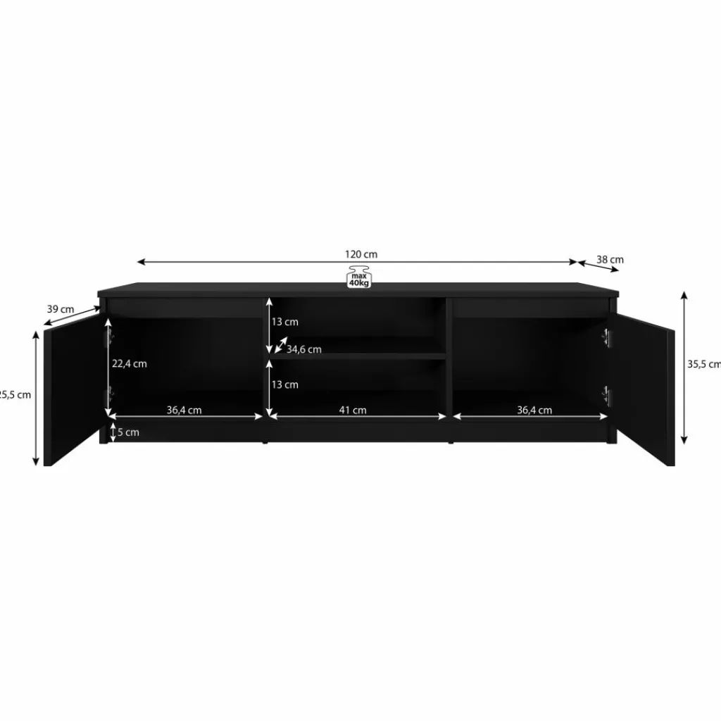 Het model beschikt over 2 deuren die greeploos zijn en via de bovenkant openen. In het midden bevinden zich 2 open vakken die ruimte bieden voor apparatuur of accessoires. Aan de achterzijde van het meubel zit een uitsparing om bekabeling netjes weg te werken.