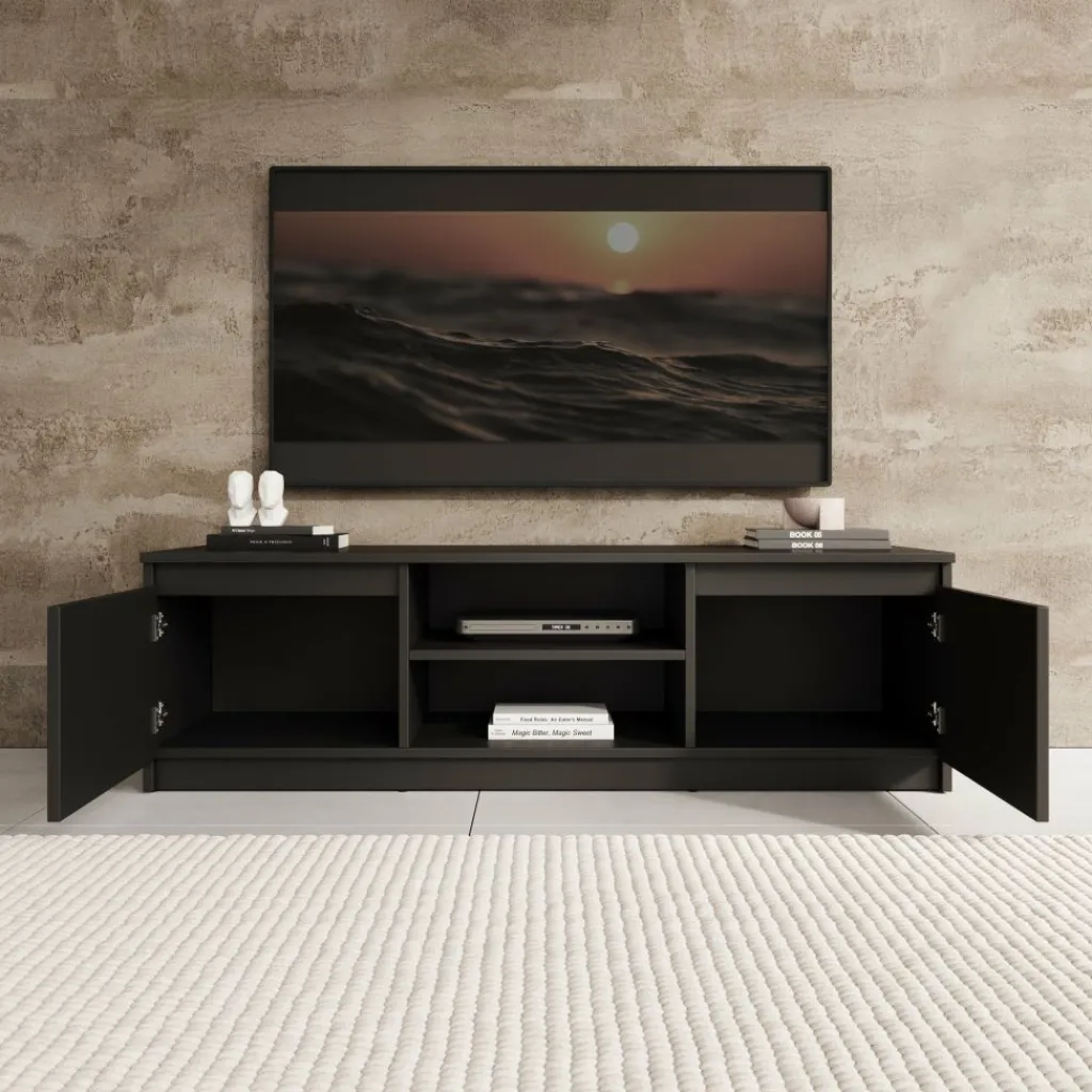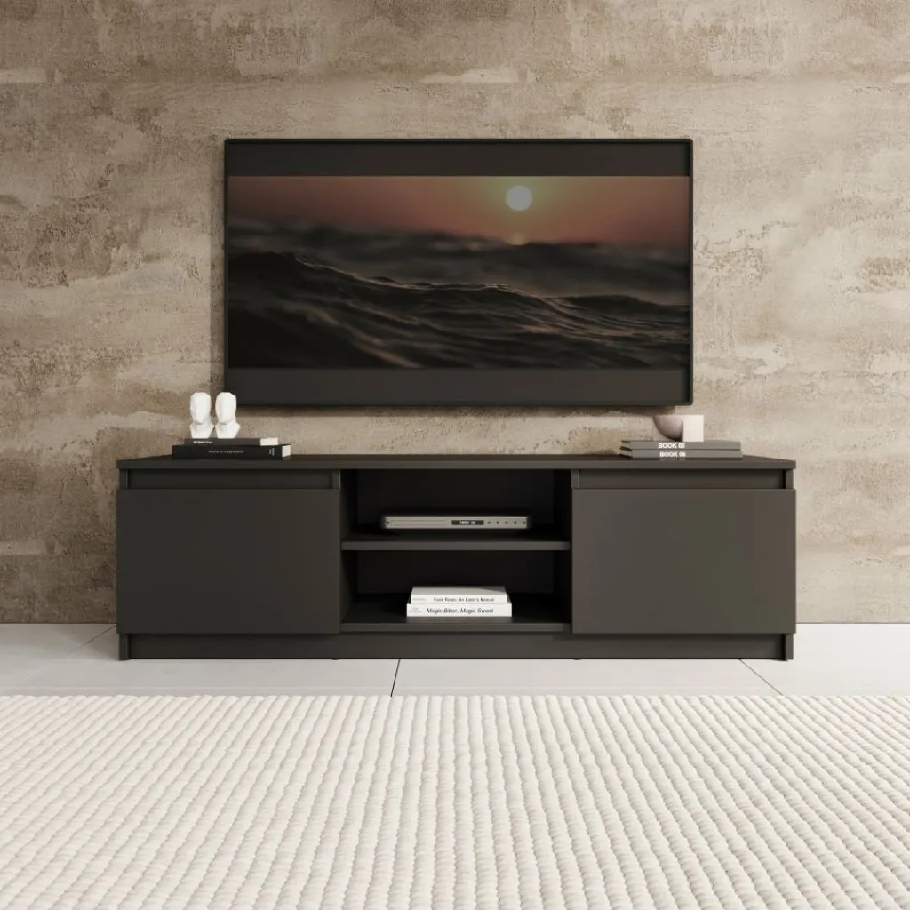 Aan de voorzijde is het tv-meubel voorzien van twee dichte deuren aan de linker- en rechterzijde. In het midden bevindt zich een open vak met een extra legplank, geschikt voor het plaatsen van media-apparatuur zoals een decoder, spelconsole of receiver. De open indeling maakt apparatuur direct toegankelijk.