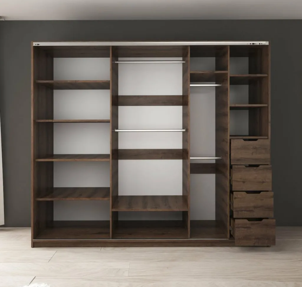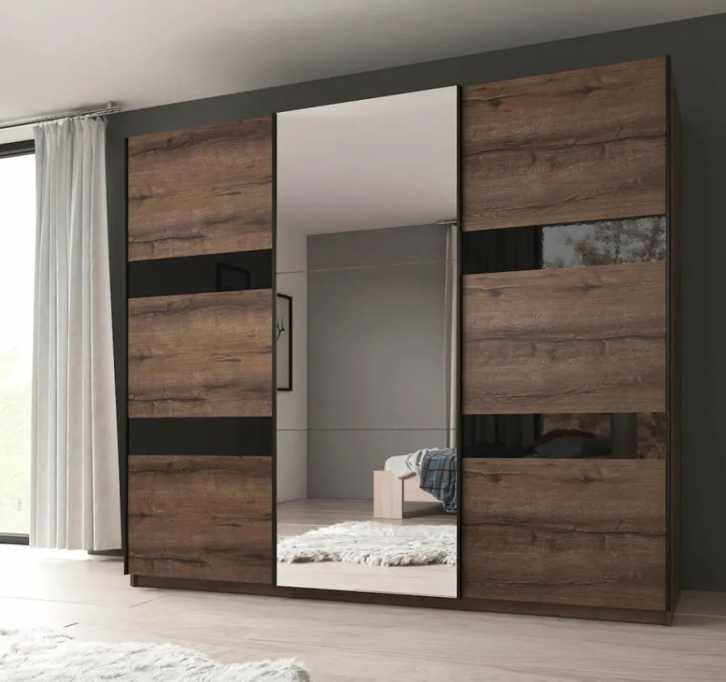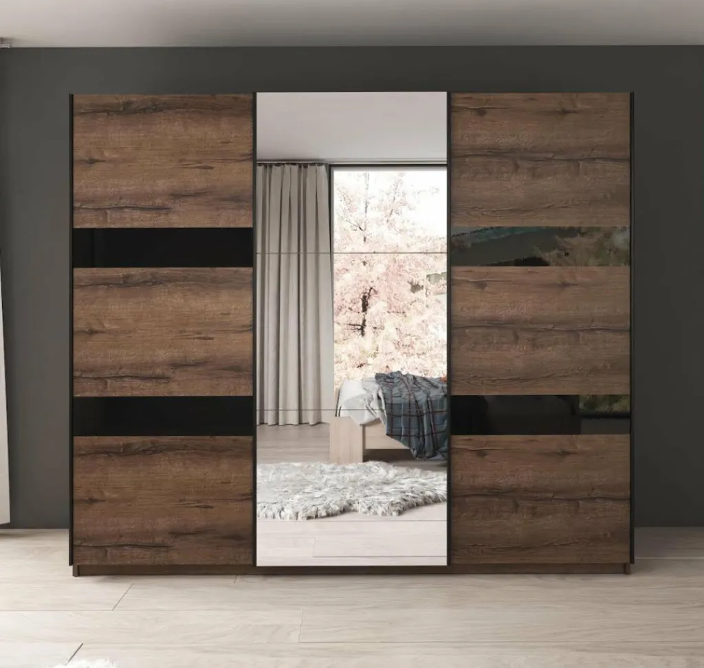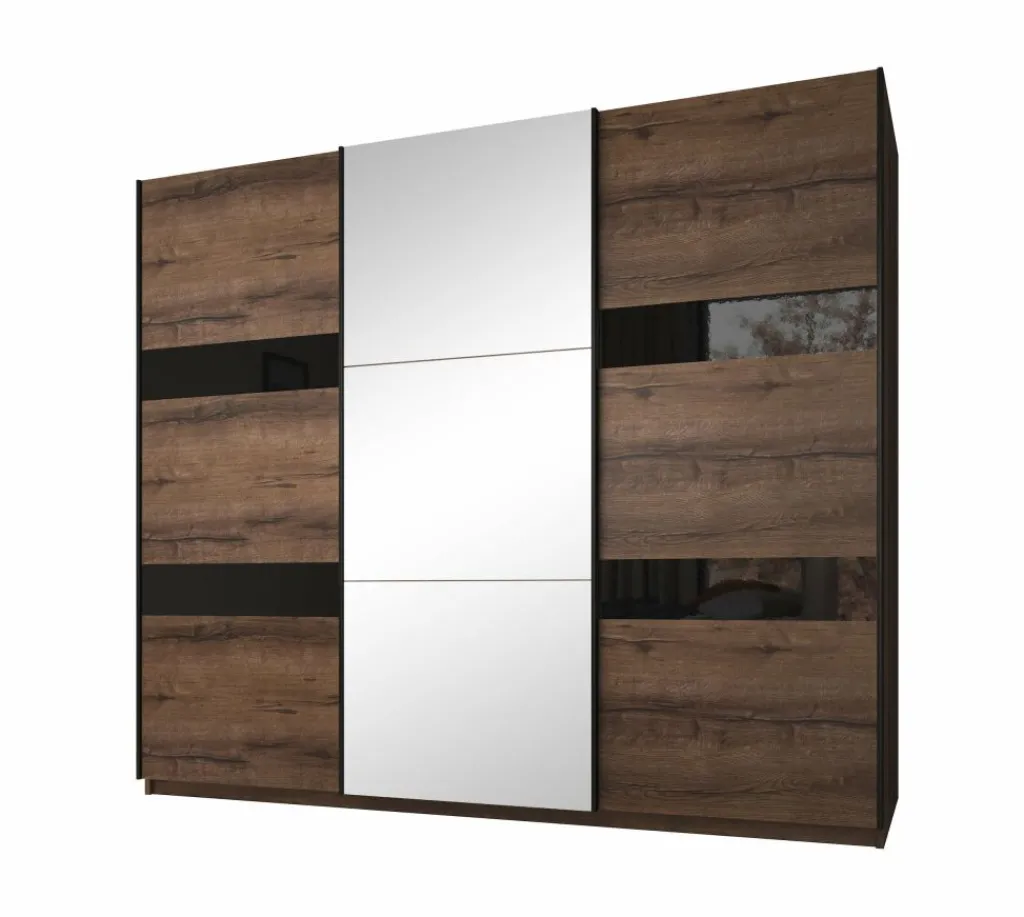 Garderobekast Diplo is een grote, praktische kledingkast uitgevoerd in eiken. De kledingkast beschikt over 3 schuifdeuren waardoor ruimte wordt bespaard. De middelste schuifdeur is een grote spiegel. Het binnenwerk beschikt over veel opbergruimte met 4 metalen stangen om kleding aan om te hangen. In de kast zitten ook 4 handige opberglades.