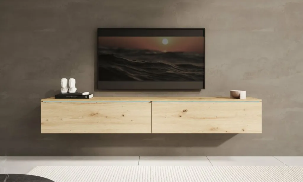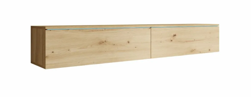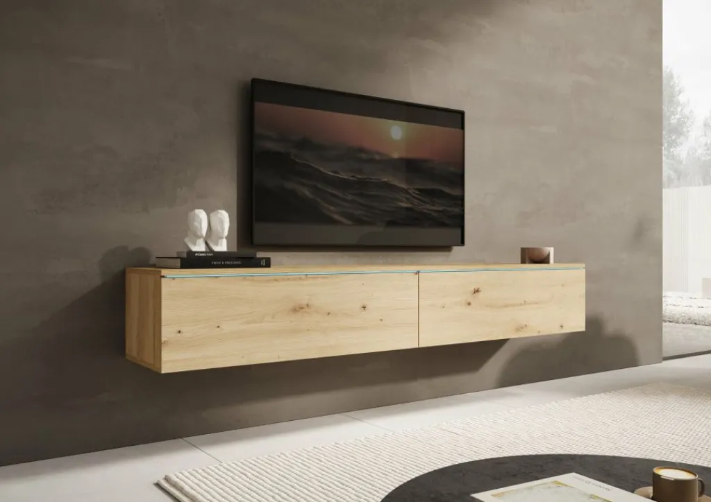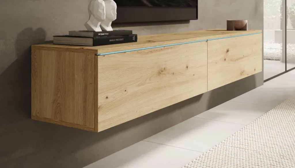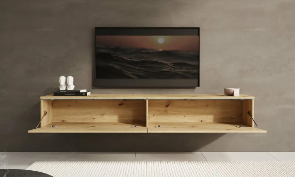 Achter de kleppen bevinden zich twee ruime compartimenten, ideaal voor het opbergen van apparatuur, kabels of andere spullen. De kast is ontworpen als zwevend model en wordt standaard geleverd met een wandmontagesysteem. Wil je het meubel liever staand plaatsen? Gebruik dan de meegeleverde pootjes van 2 cm hoog in zilverkleur.