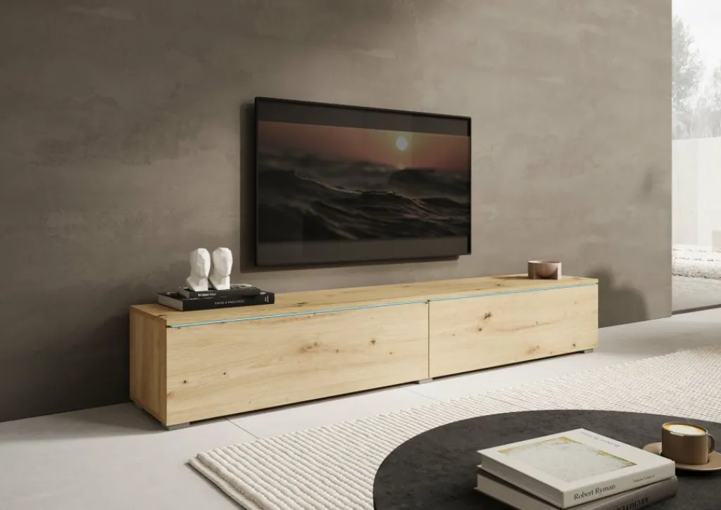 TV-meubel Dixon combineert een strak design met slimme opbergruimte. Met twee kleppen zonder grepen, voegt dit meubel een rustige, moderne uitstraling toe aan je interieur. De geïntegreerde LED-verlichting zorgt voor een subtiel accent en extra sfeer in de ruimte. Deze sluit je aan via een kabel.