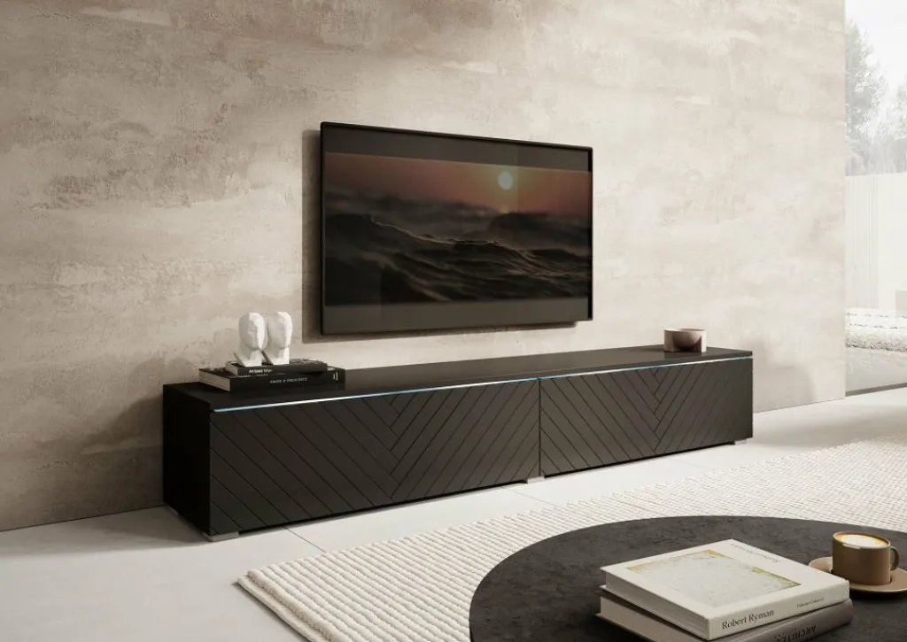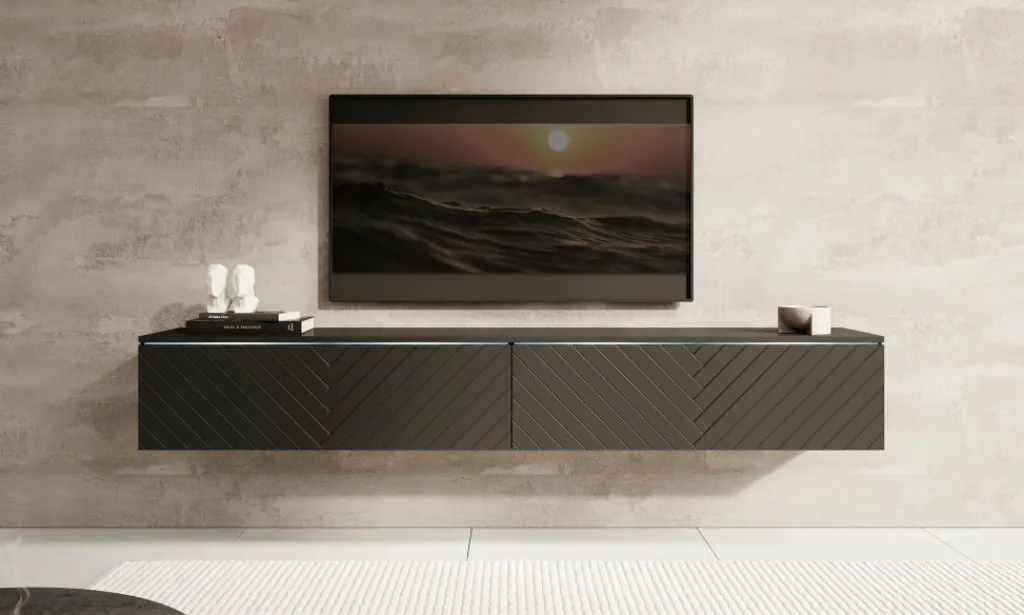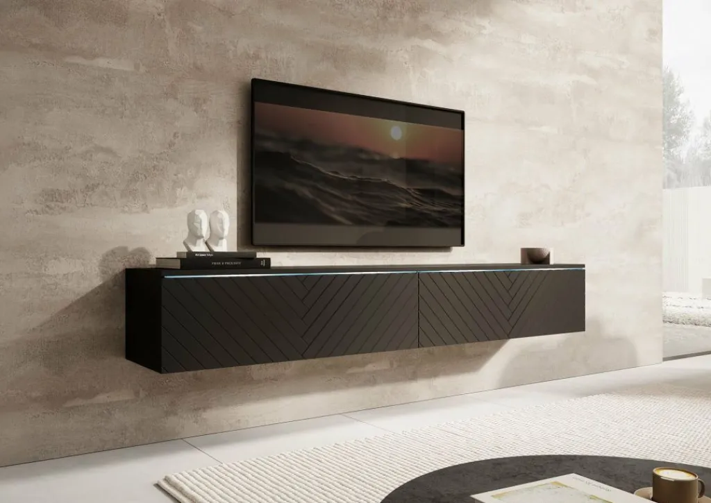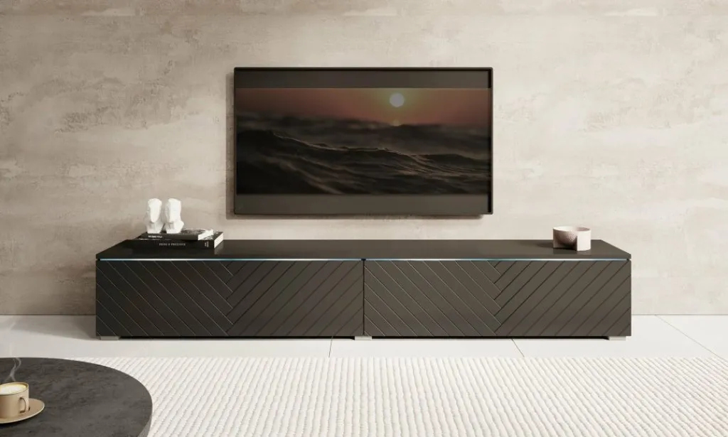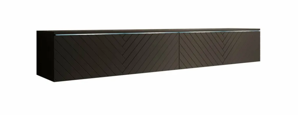 TV-meubel Dixon combineert een strak design met slimme opbergruimte. Met twee kleppen zonder grepen en een verfijnd visgraatpatroon op de fronten, voegt dit meubel een rustige, moderne uitstraling toe aan je interieur. De geïntegreerde LED-verlichting zorgt voor een subtiel accent en extra sfeer in de ruimte. Deze sluit je aan via een kabel.