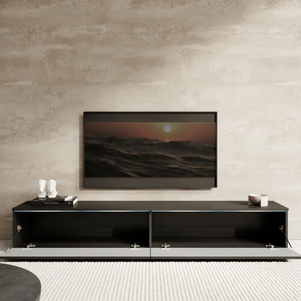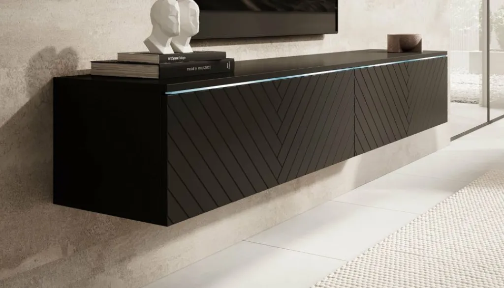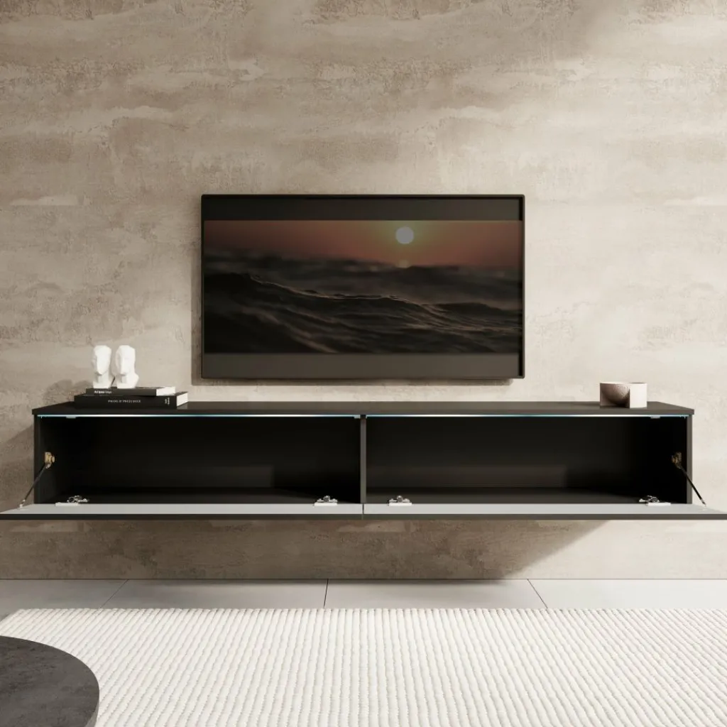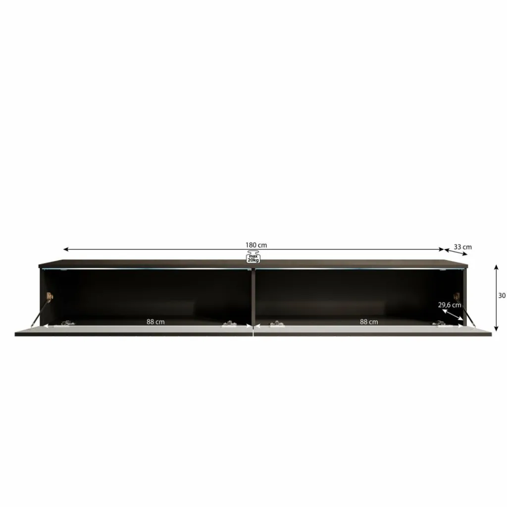 Achter de kleppen bevinden zich twee ruime compartimenten, ideaal voor het opbergen van apparatuur, kabels of andere spullen. De kast is ontworpen als zwevend model en wordt standaard geleverd met een wandmontagesysteem. Wil je het meubel liever staand plaatsen? Gebruik dan de meegeleverde pootjes van 2 cm hoog in zilverkleur.