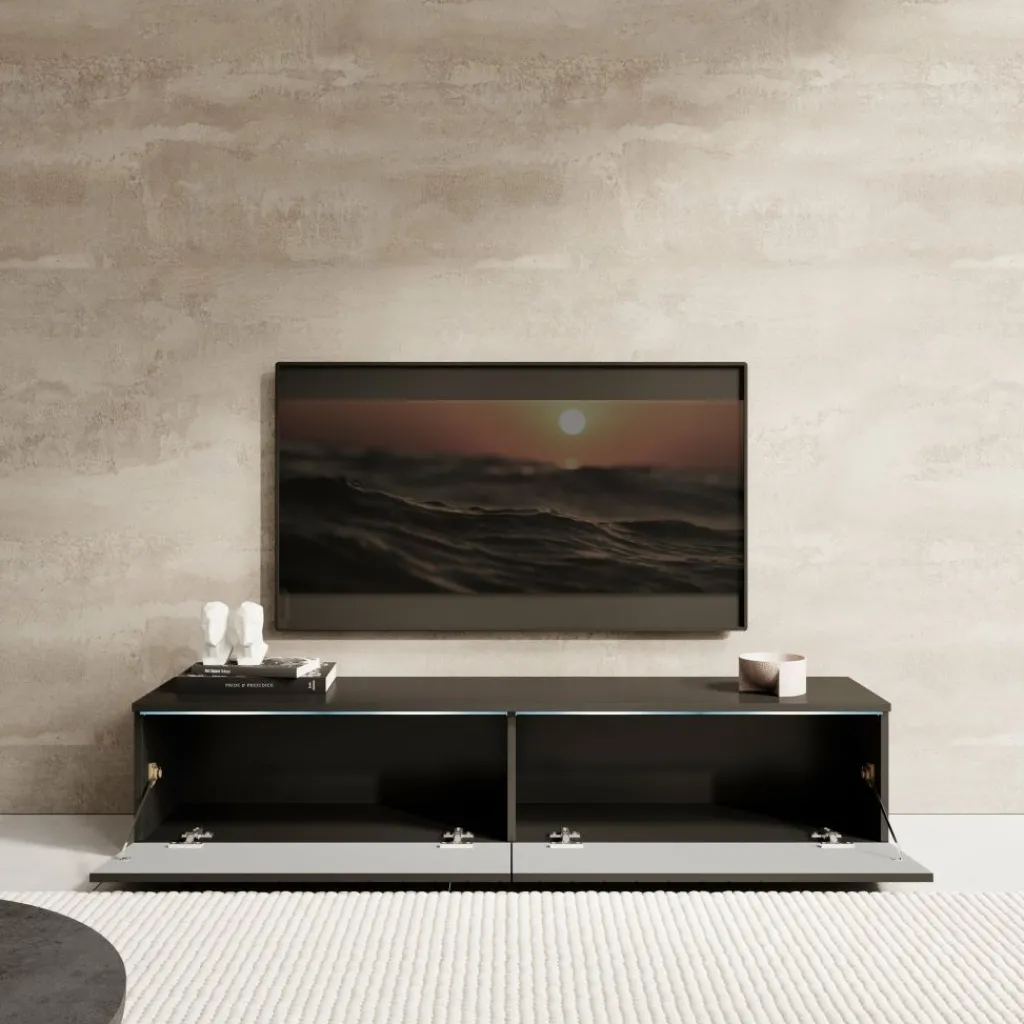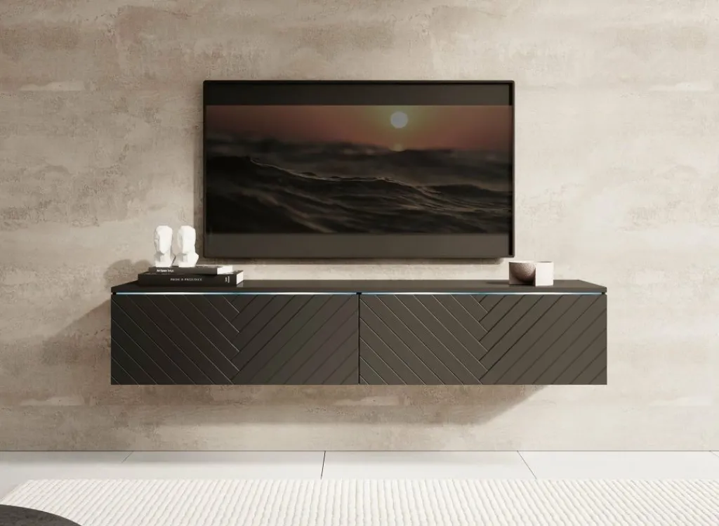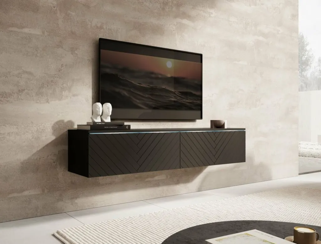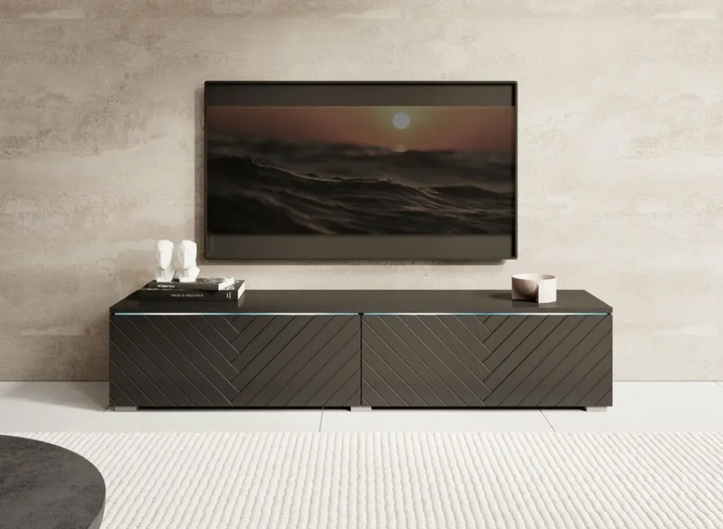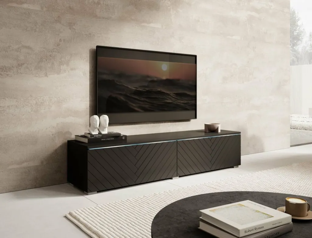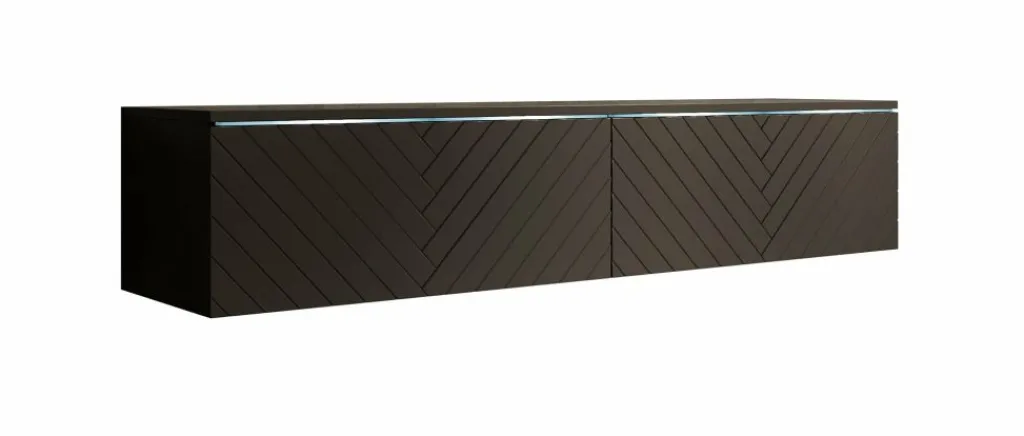 TV-Meubel Dixon is een modern meubelstuk met een strak design en veel praktische opbergruimte. Het meubel is uitgerust met subtiele LED-verlichting en beschikt over twee greeploze kleppen. De fronten zijn afgewerkt met een stijlvol visgraatpatroon, wat zorgt voor een chique en eigentijdse uitstraling.