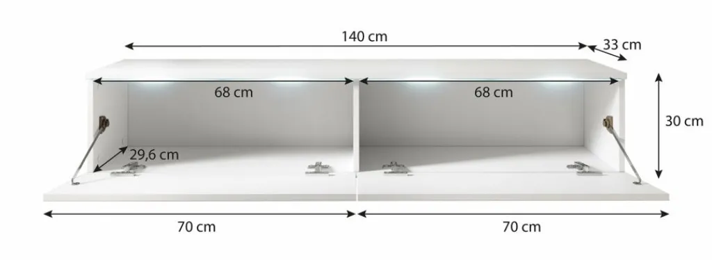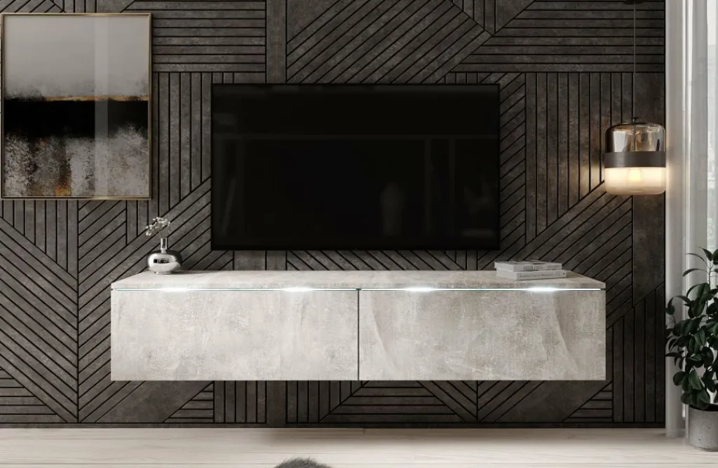 Het tv-meubel is aan de muur op te hangen. Toch liever een staand model? Dat kan ook, door eenvoudig de bijgeleverde pootjes te monteren onder het meubel. De pootjes zijn zilverkleurig, gemaakt van kunststof en hebben een hoogte van 2 cm.