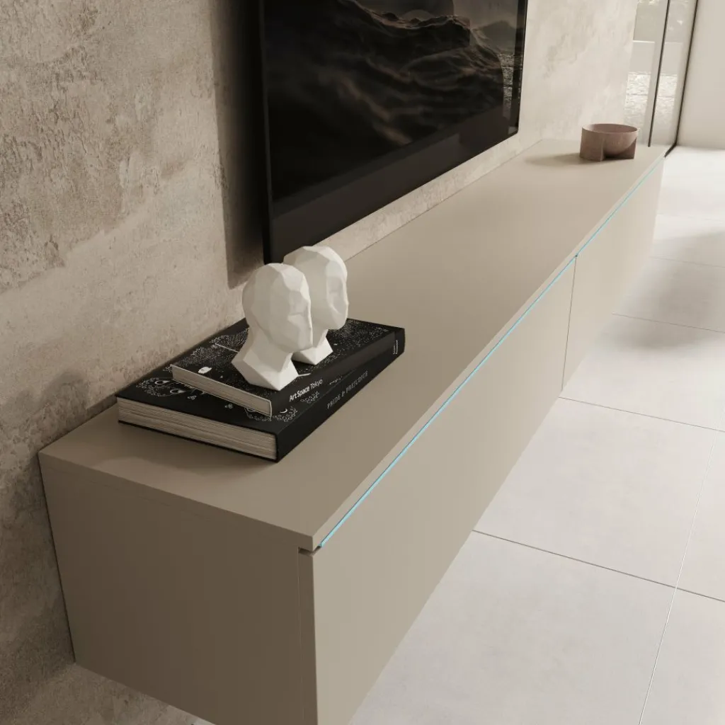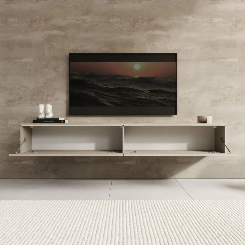 Het Dixon TV-meubel in beige heeft een strak en modern ontwerp dat goed aansluit bij verschillende woonstijlen. Boven de kleppen is LED-verlichting geïntegreerd, die een zachte gloed op de muur geeft en het meubel extra laat opvallen.