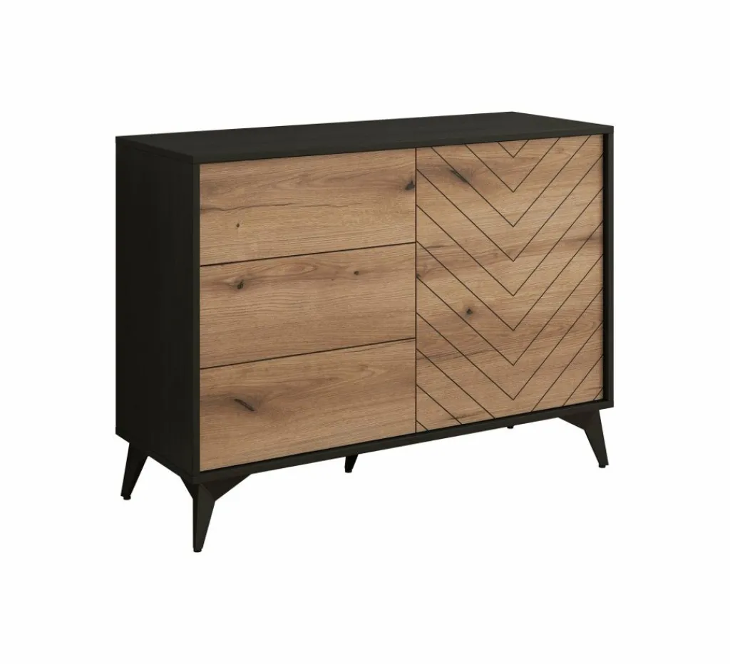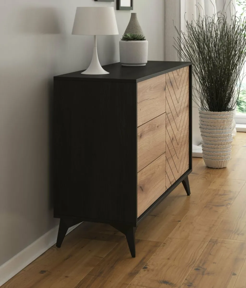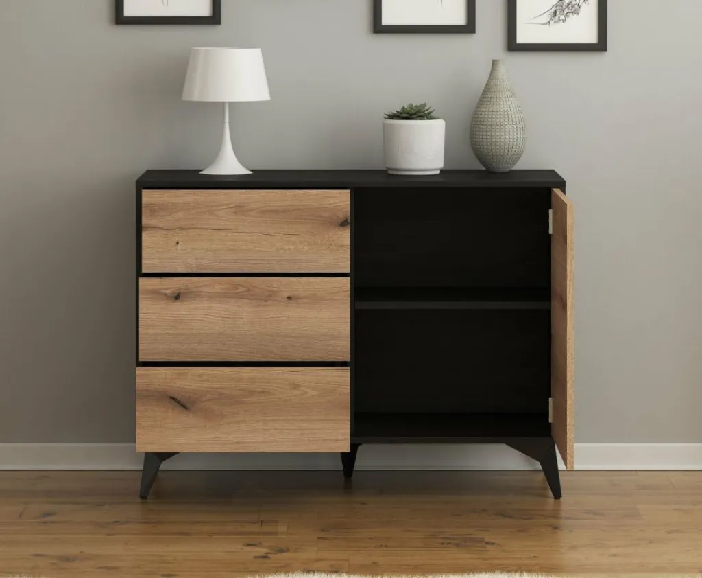 Dressoir Dolores is een moderne opbergkast, uitgevoerd in een eiken kleur met mat zwarte ombouw. De kast beschikt over 3 opberglades en een deur. De deur opent naar rechts, waarachter zich 2 opbergschappen bevinden. De kast staat op zwart metalen pootjes.