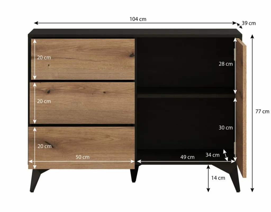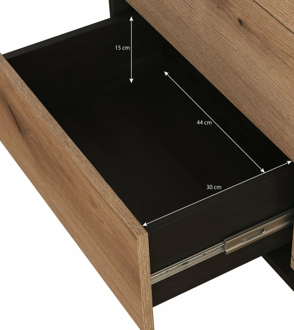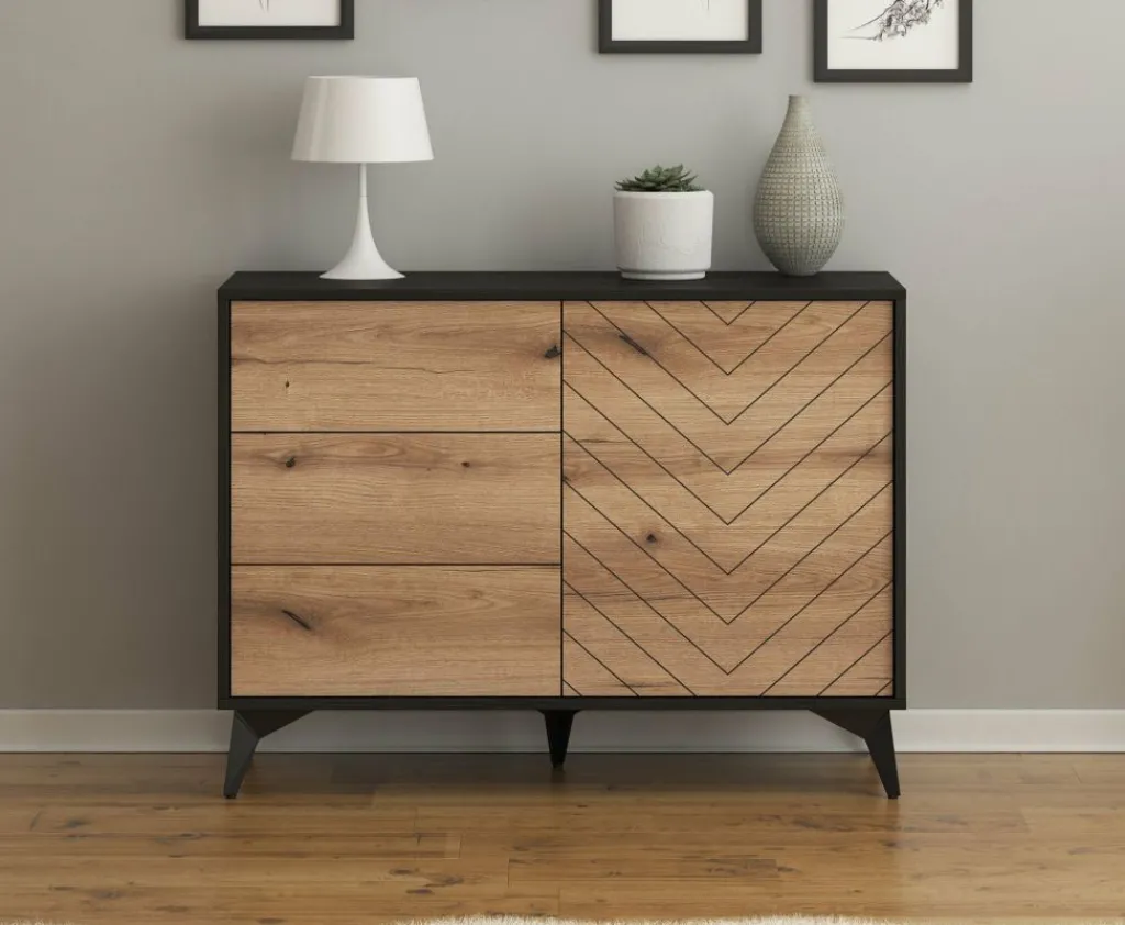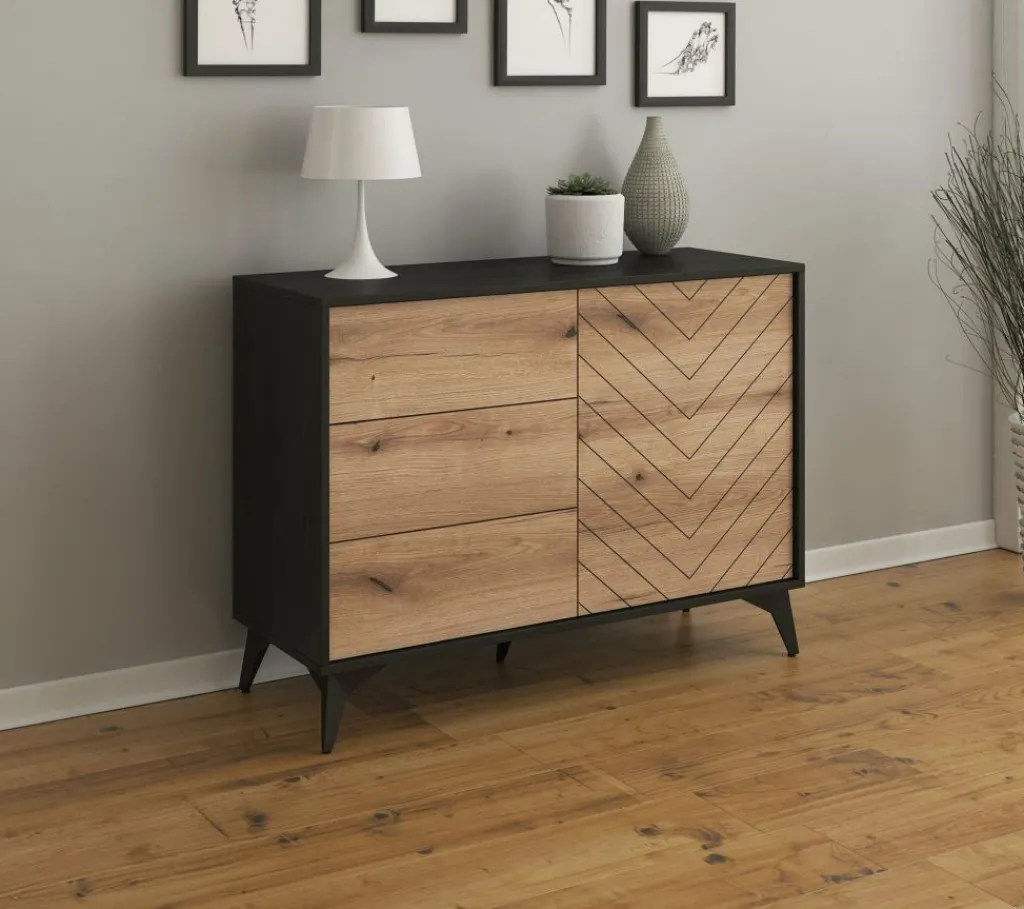Dressoir Dolores is een moderne opbergkast, uitgevoerd in een eiken kleur met mat zwarte ombouw. De kast beschikt over 3 opberglades en een deur. De deur opent naar rechts, waarachter zich 2 opbergschappen bevinden. De kast staat op zwart metalen pootjes.