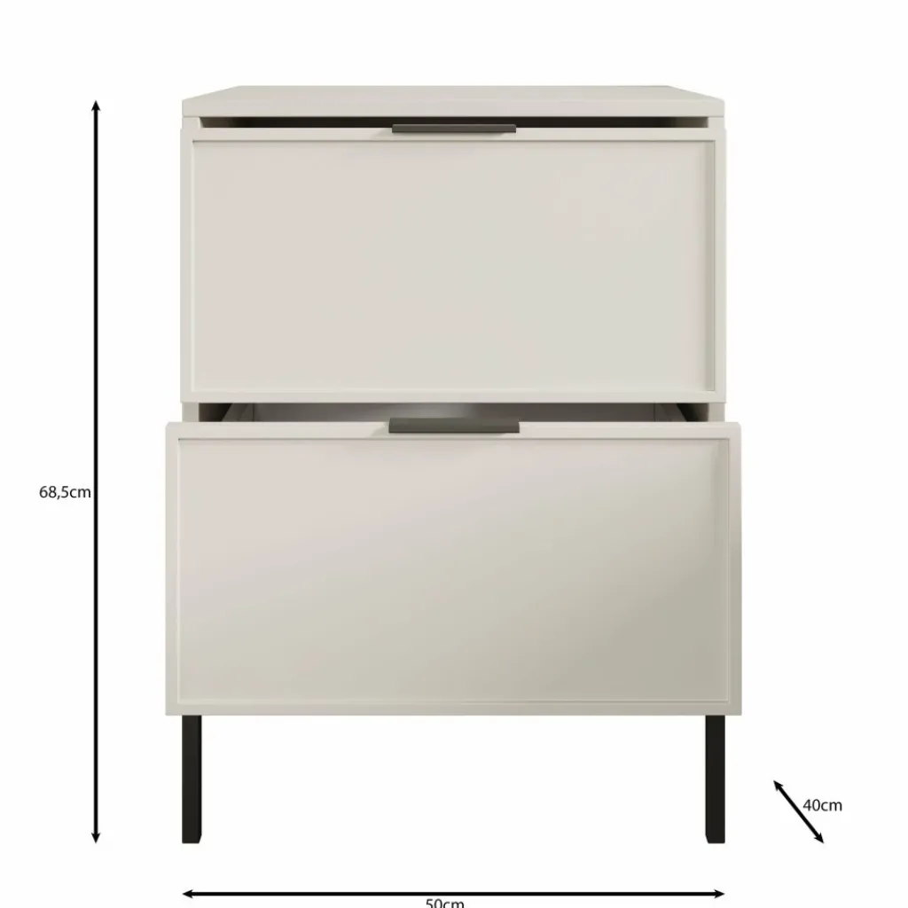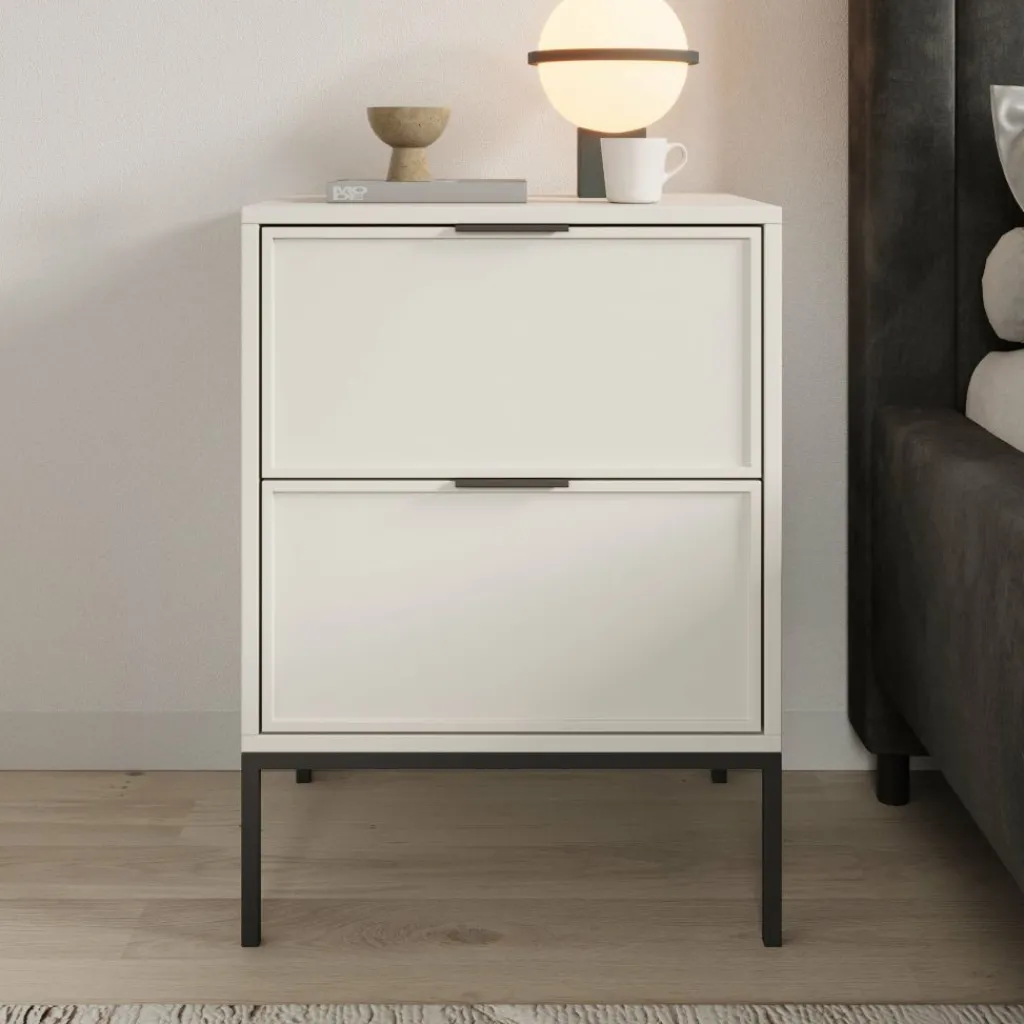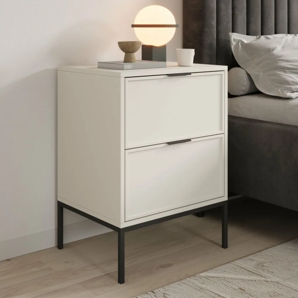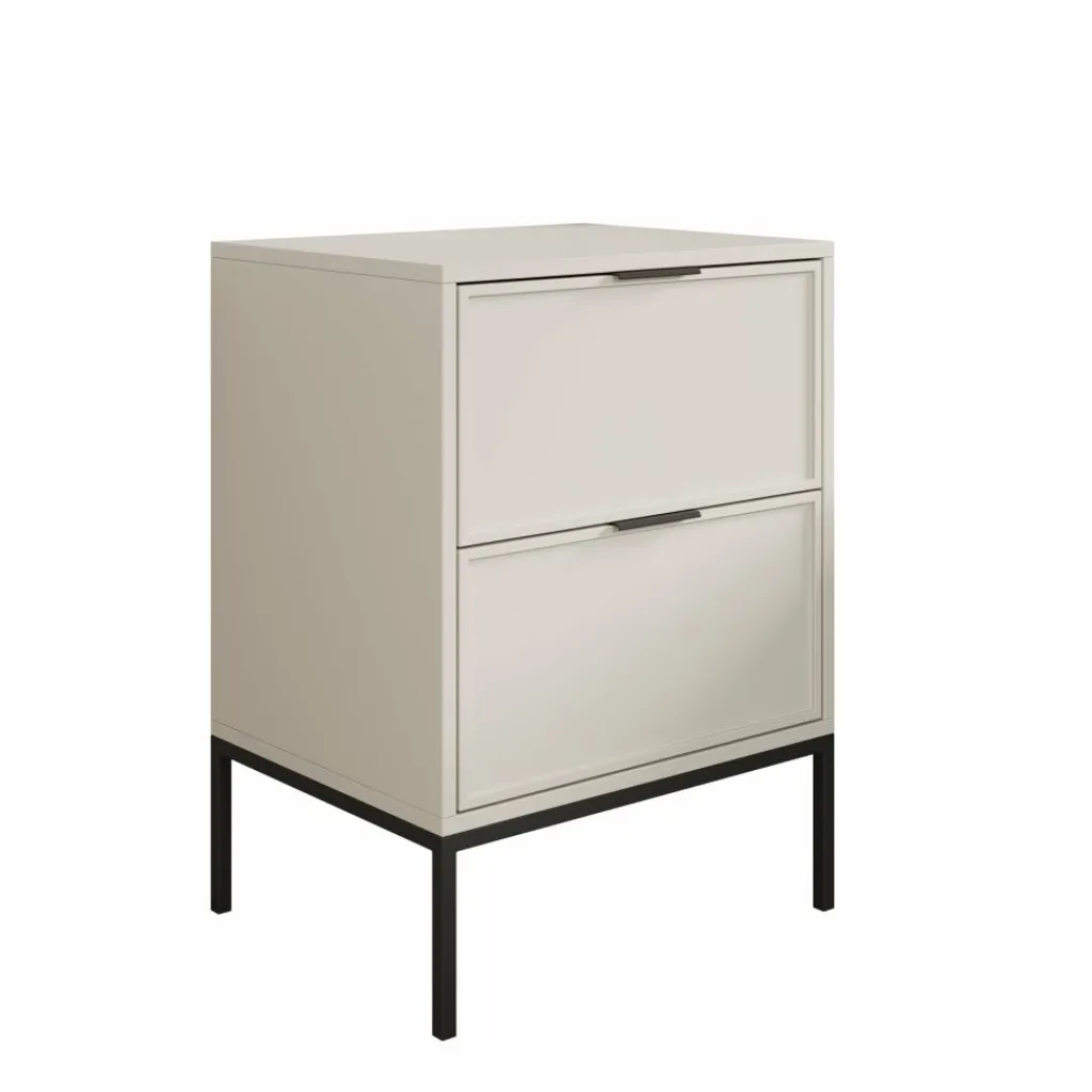 Het meubel is uitgevoerd in een beige kleur en staat op slanke metalen poten, wat zorgt voor een open en ruimtelijk effect in de slaapkamer. De fronten van de lades zijn gemaakt van MDF en zijn voorzien van metalen handgrepen. De lades sluiten soepel dankzij het softclose systeem, waardoor ze gecontroleerd en stil dichtgaan.