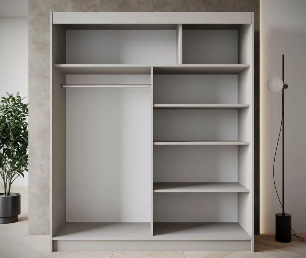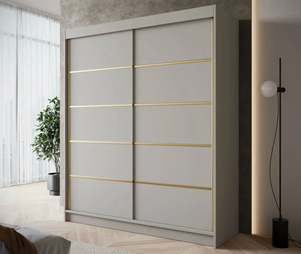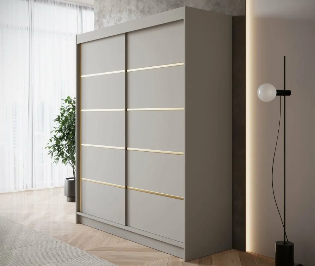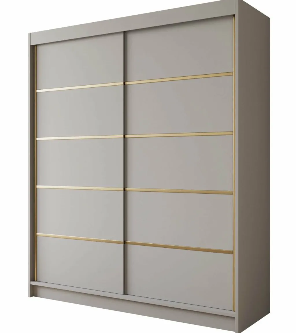 Kledingkast Eagle is een moderne garderobekast met ruime opbergmogelijkheden. Dit model is voorzien van 2 schuifdeuren. Deze hebben op de voorkant goudkleurige strepen. Verder is het meubel volledig uitgevoerd in beige. De binnenkant van de kast bestaat uit 6 opbergvakken en 1 kledingroede.