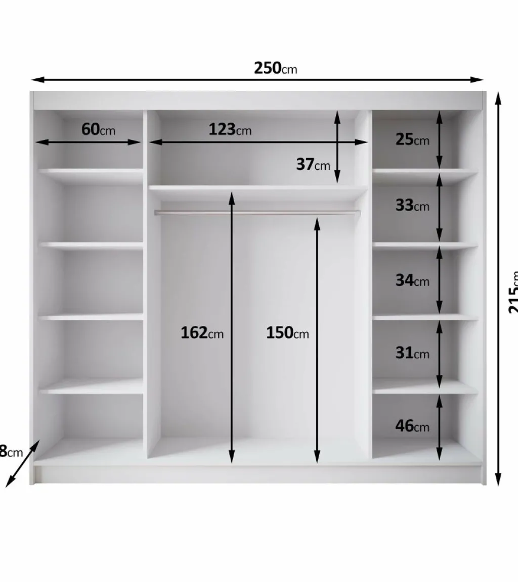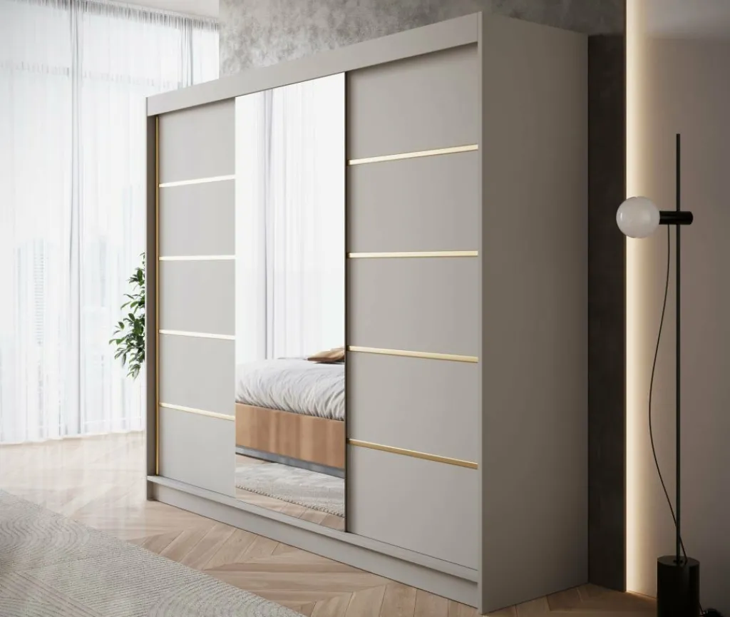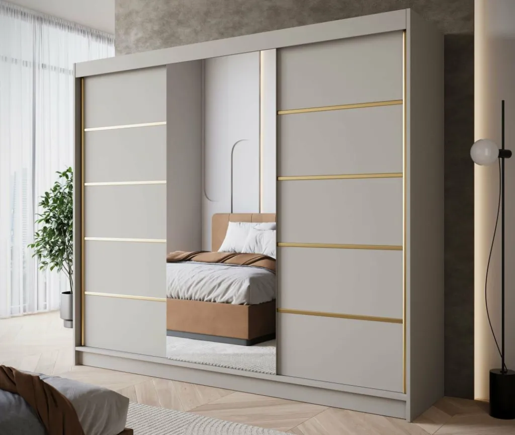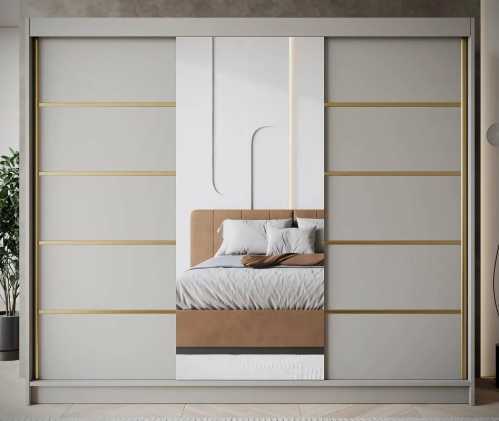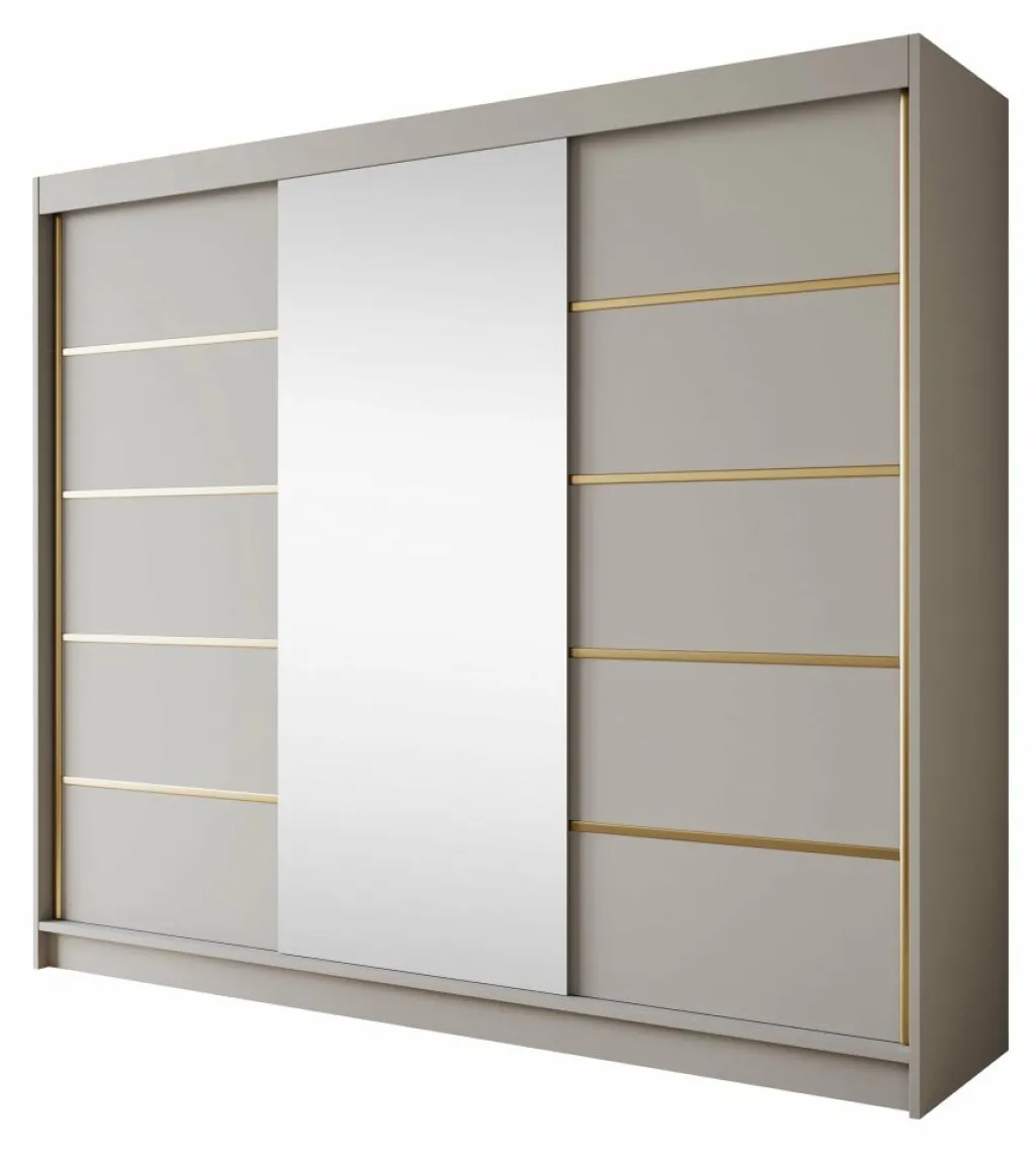 Kledingkast Eagle is een moderne garderobekast met ruime opbergmogelijkheden. Dit model is voorzien van 3 schuifdeuren waarvan de middelste een grote spiegel heeft. De linker- en rechter deur hebben goudkleurige strepen op de voorkant. Verder is het meubel volledig uitgevoerd in beige. De binnenkant van de kast bestaat uit 11 opbergvakken en 1 kledingroede.