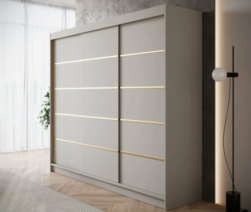 Kledingkast Eagle is een moderne garderobekast met ruime opbergmogelijkheden. Dit model is voorzien van 3 schuifdeuren. Deze hebben op de voorkant goudkleurige strepen. Verder is het meubel volledig uitgevoerd in beige. De binnenkant van de kast bestaat uit 11 opbergvakken en 1 kledingroede.
