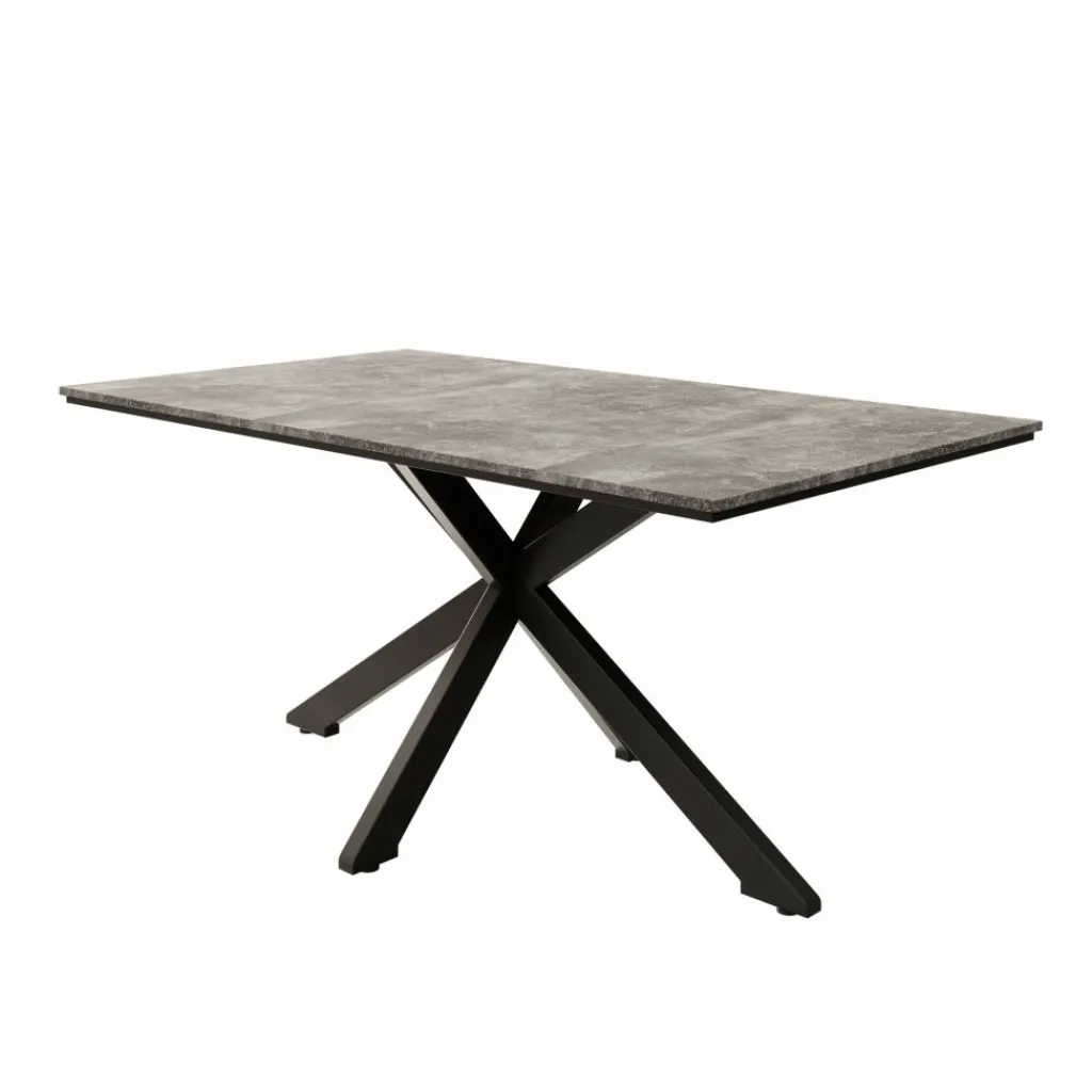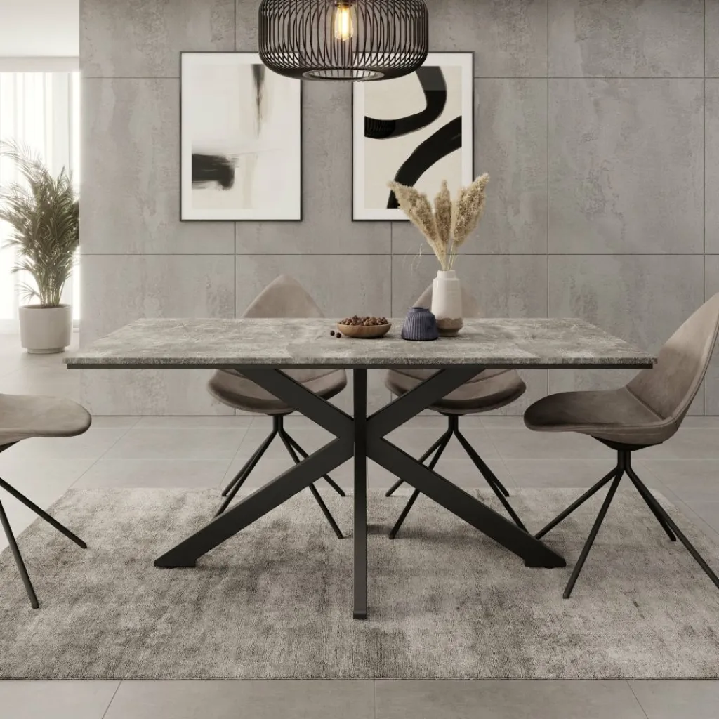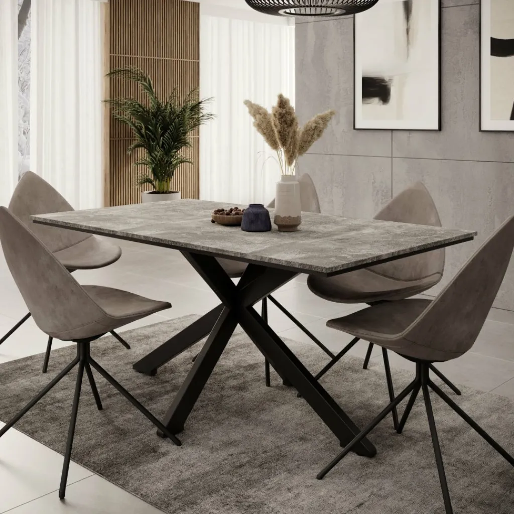 De eetkamertafel Wabe heeft een tafelblad in betonlook dat zorgt voor een moderne en rustige uitstraling. Het blad heeft een mat, egaal oppervlak en is gecombineerd met een stevig metalen kruisonderstel voor goede stabiliteit. Met een afmeting van 160×90 cm biedt de tafel voldoende ruimte voor dagelijks gebruik en voor meerdere zitplaatsen.