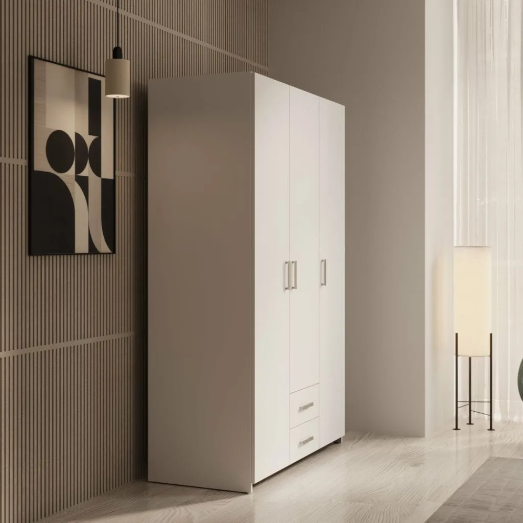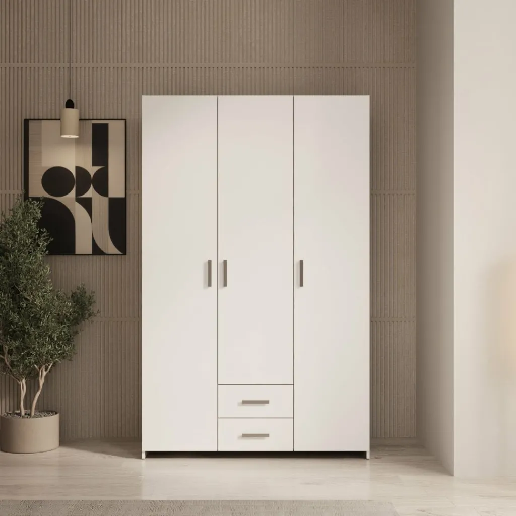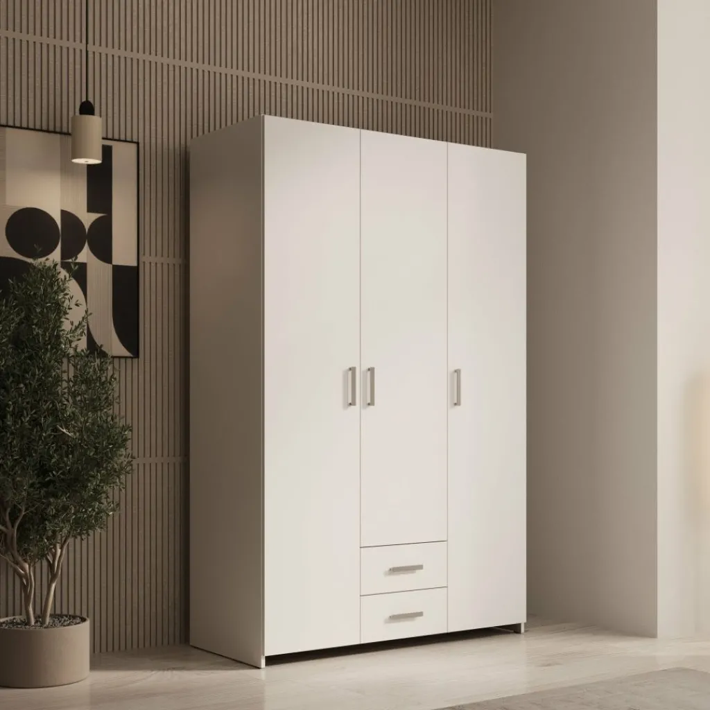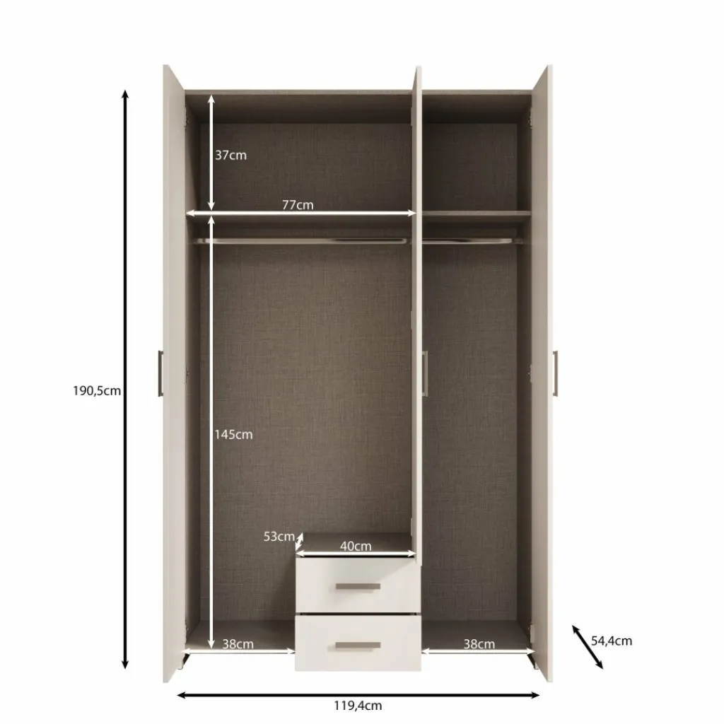 Elario kledingkast is een staande 3-deurs kledingkast met lades, uitgevoerd in wit. De kast heeft een breedte van 119 cm, een diepte van 54 cm en een hoogte van 191 cm en biedt ruime en overzichtelijke opbergmogelijkheden voor kleding en accessoires.