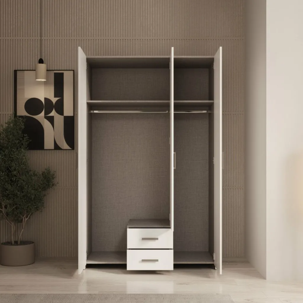 Achter de deuren bevinden zich twee hanggedeeltes met roedes, geschikt voor jassen, overhemden en jurken. Bovenin is extra opbergruimte aanwezig voor opgevouwen kleding, beddengoed of tassen. In het midden zijn twee lades geplaatst, handig voor kleinere kledingstukken, accessoires of ondergoed. Deze indeling maakt de kast praktisch voor dagelijks gebruik en geschikt voor meerdere personen.