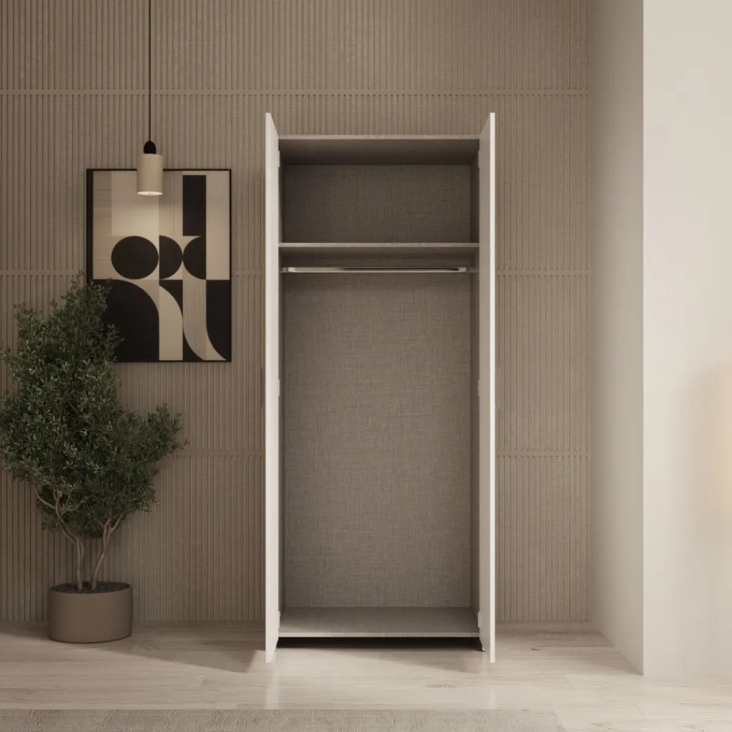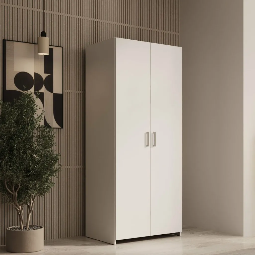 Elario kledingkast is een staande 2-deurs kast voor de slaapkamer of hal, uitgevoerd in wit. De kast heeft een breedte van 80 cm, een diepte van 54 cm en een hoogte van 191 cm en biedt een praktische opbergoplossing voor kleding en accessoires.