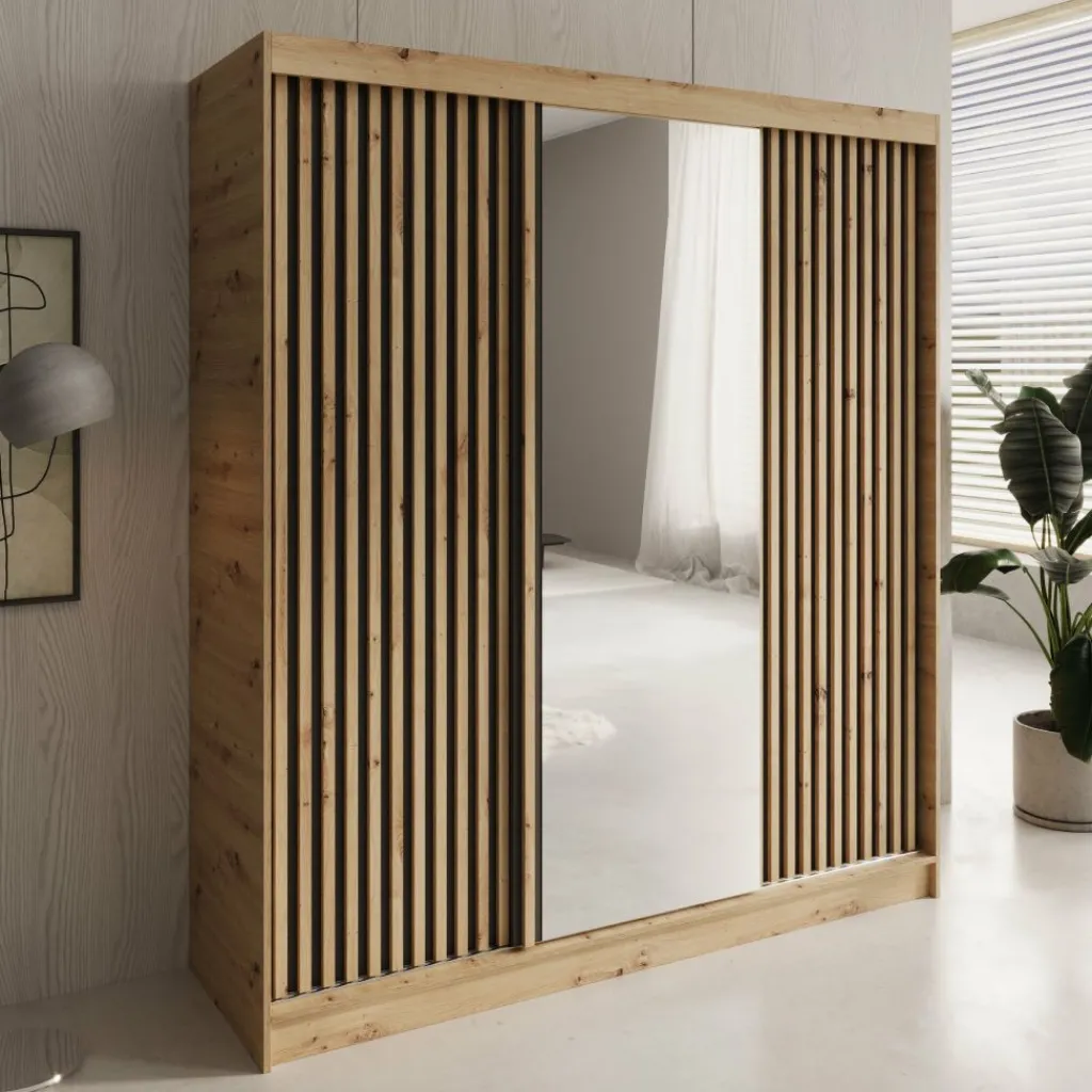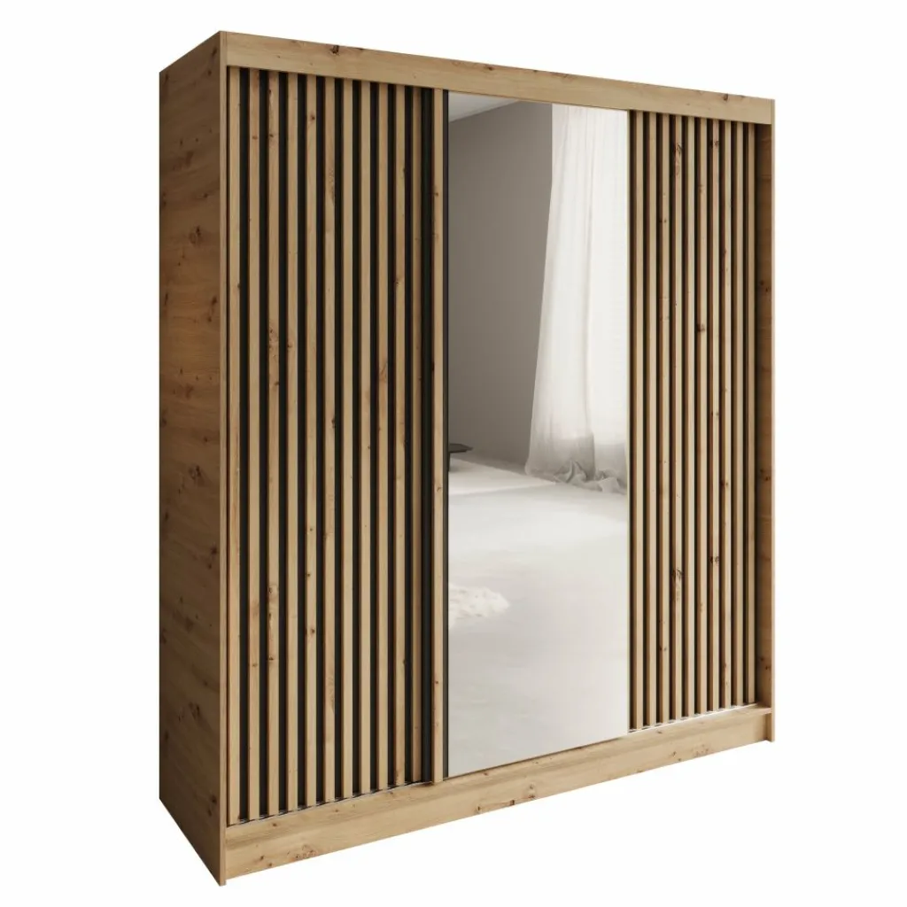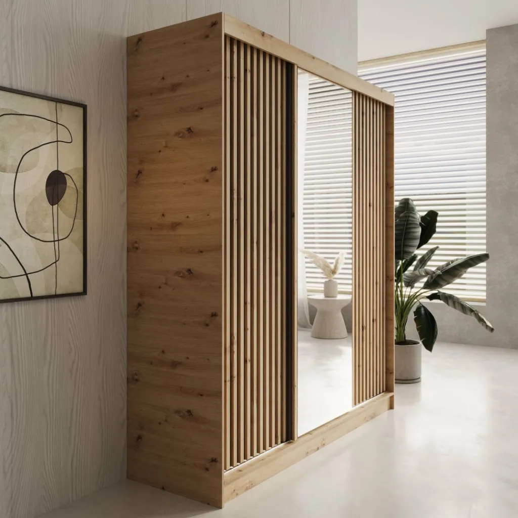 De Elles kledingkast met 3 schuifdeuren is een stijlvolle en praktische toevoeging aan elke slaapkamer. De warme eiken afwerking en verticale lattenstructuur geven het ontwerp een moderne, natuurlijke uitstraling, terwijl de spiegeldeur zorgt voor extra licht en een ruimtelijk gevoel in de kamer.