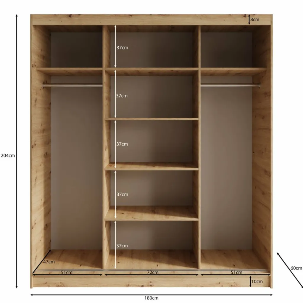 Dankzij de drie soepel schuivende deuren blijft de kast gemakkelijk toegankelijk, zelfs in kleinere ruimtes. Met een royale breedte van 180 cm biedt Elles volop opbergruimte voor kleding, schoenen en accessoires. De slimme indeling met legplanken en een kledingroede helpt je alles overzichtelijk en netjes op te bergen.
