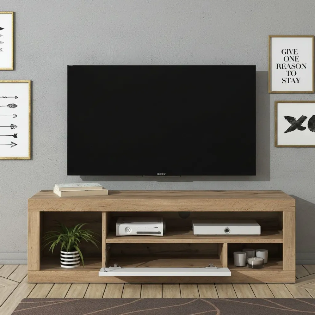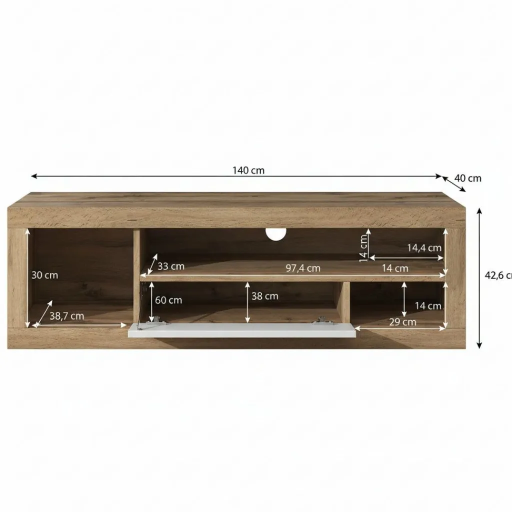 Overzichtelijke opbergruimte Het meubel heeft een groot open vak aan de linkerzijde en twee kleinere vakken rechts, ideaal voor een mediaspeler, spelconsole of decoratie. De witte valdeur in het midden verbergt extra opbergruimte netjes uit het zicht. Achter in het meubel zit een kabelgat zodat kabels netjes weggewerkt kunnen worden.
