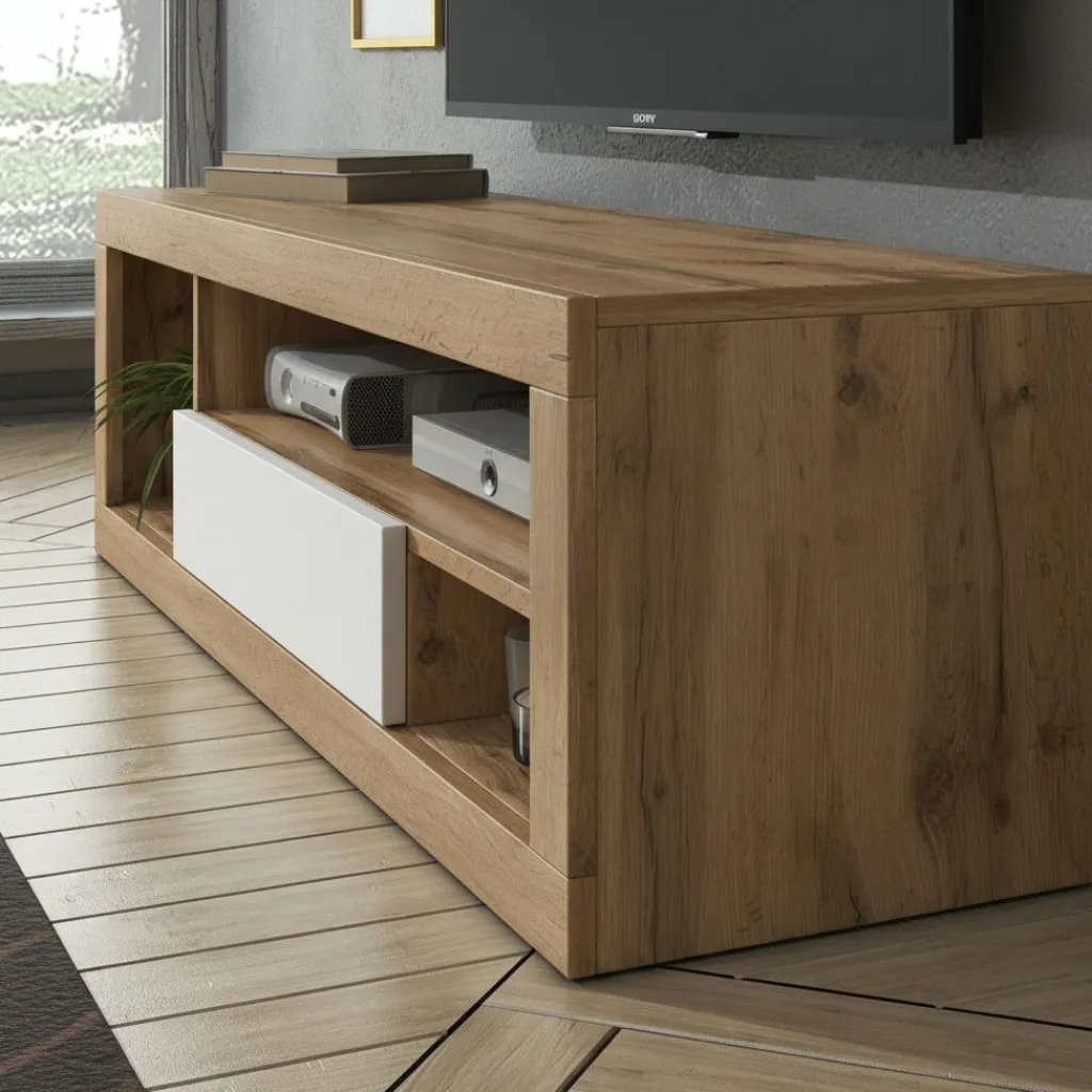 De Elyse is een strak TV-meubel dat de combinatie van eikenpatroon en wit op een rustige manier samenbrengt. Het warme eikenpatroon en de witte klap geven het meubel karakter zonder dat het te zwaar oogt.