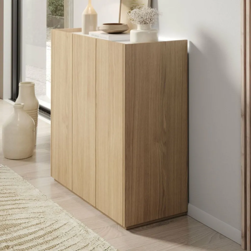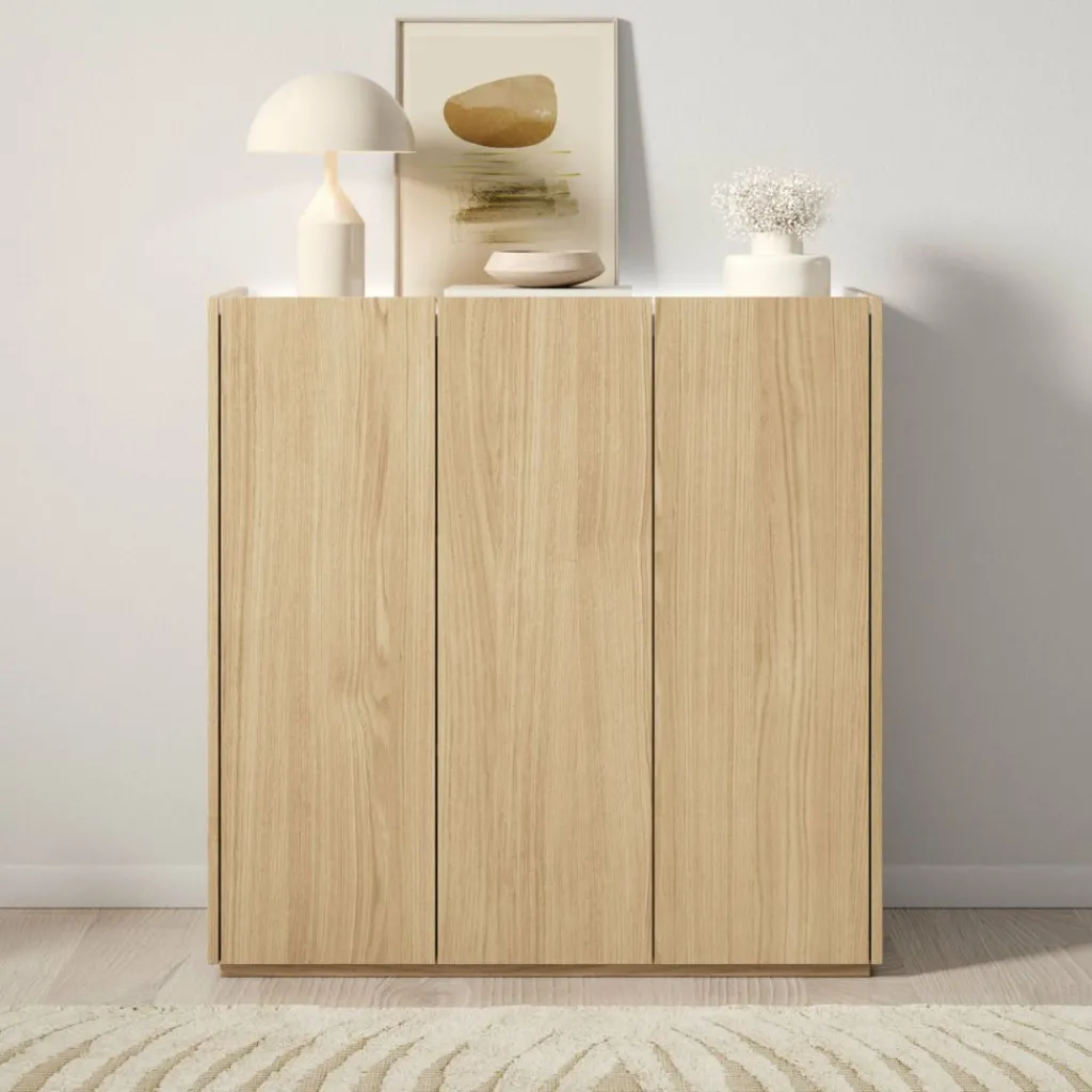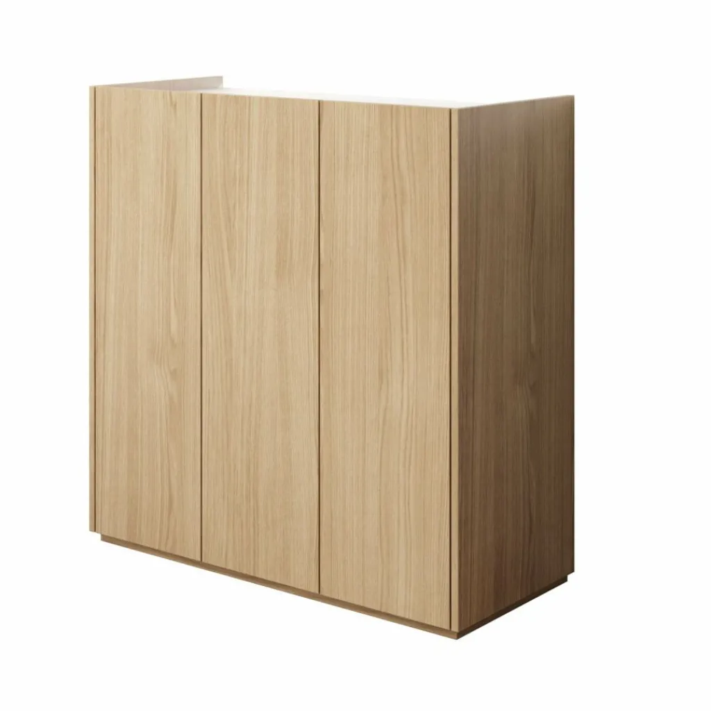 Schoenenkast Encore is een modern meubel die geschikt is voor het opbergen van je schoenen. De kast is voorzien van 3 greeploze deuren die te openen zijn via de bovenkant. Achter deze deuren zitten 6 opbergvakken. Aan de achterzijde aan de bovenkant kan je LED-verlichting plaatsen. Het meubel is uitgevoerd in de kleur eiken met een hoogglans wit bovenblad.